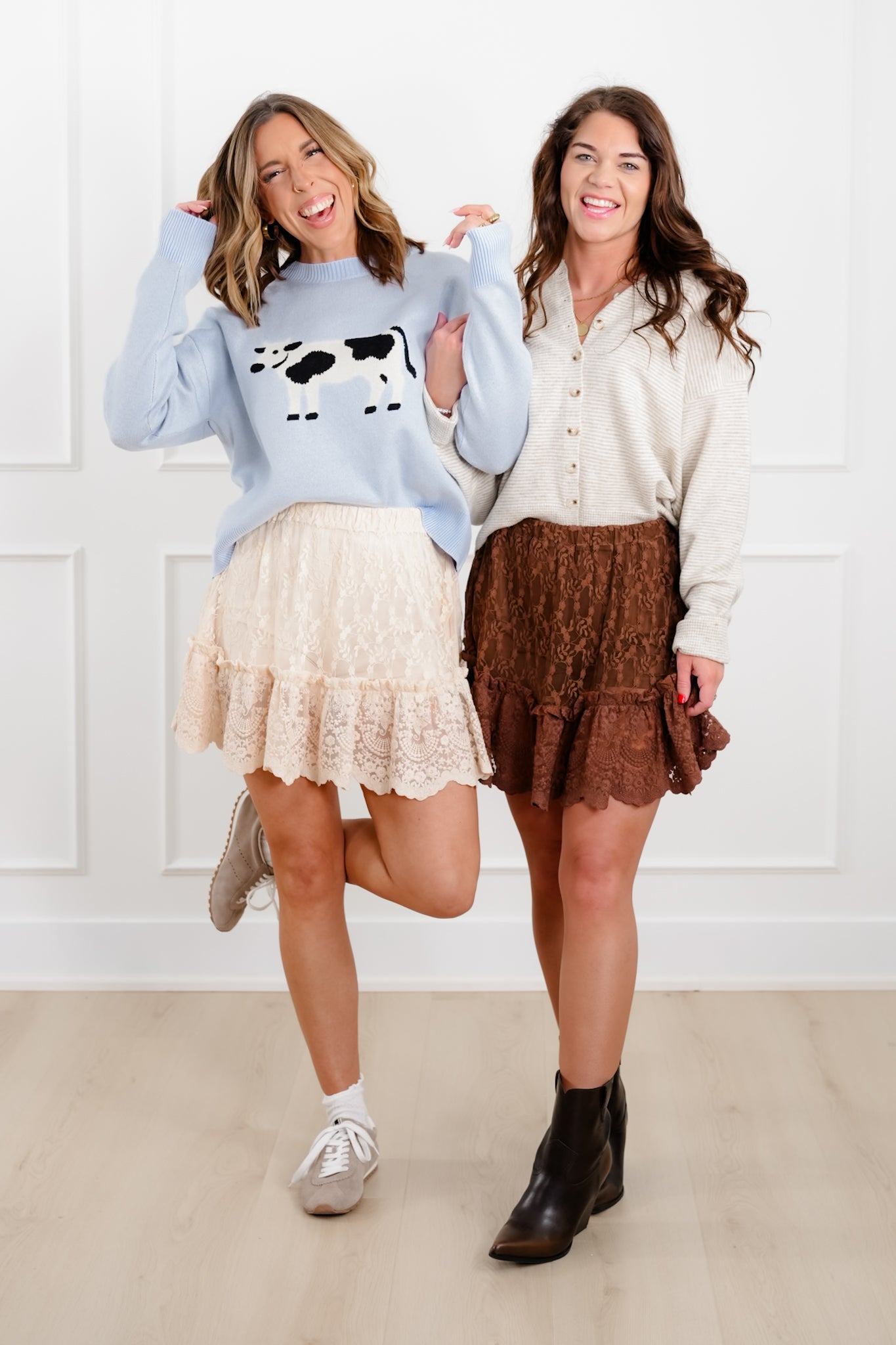 This lace mini skort delivers that dressed-up look with built-in confidence. The tiered lace overlay adds soft movement and texture, while the hidden shorts keep it easy and wearable all day. Stretchy, lightweight, and polished, it styles effortlessly with sweaters, knits, or simple tees for an elevated everyday outfit.