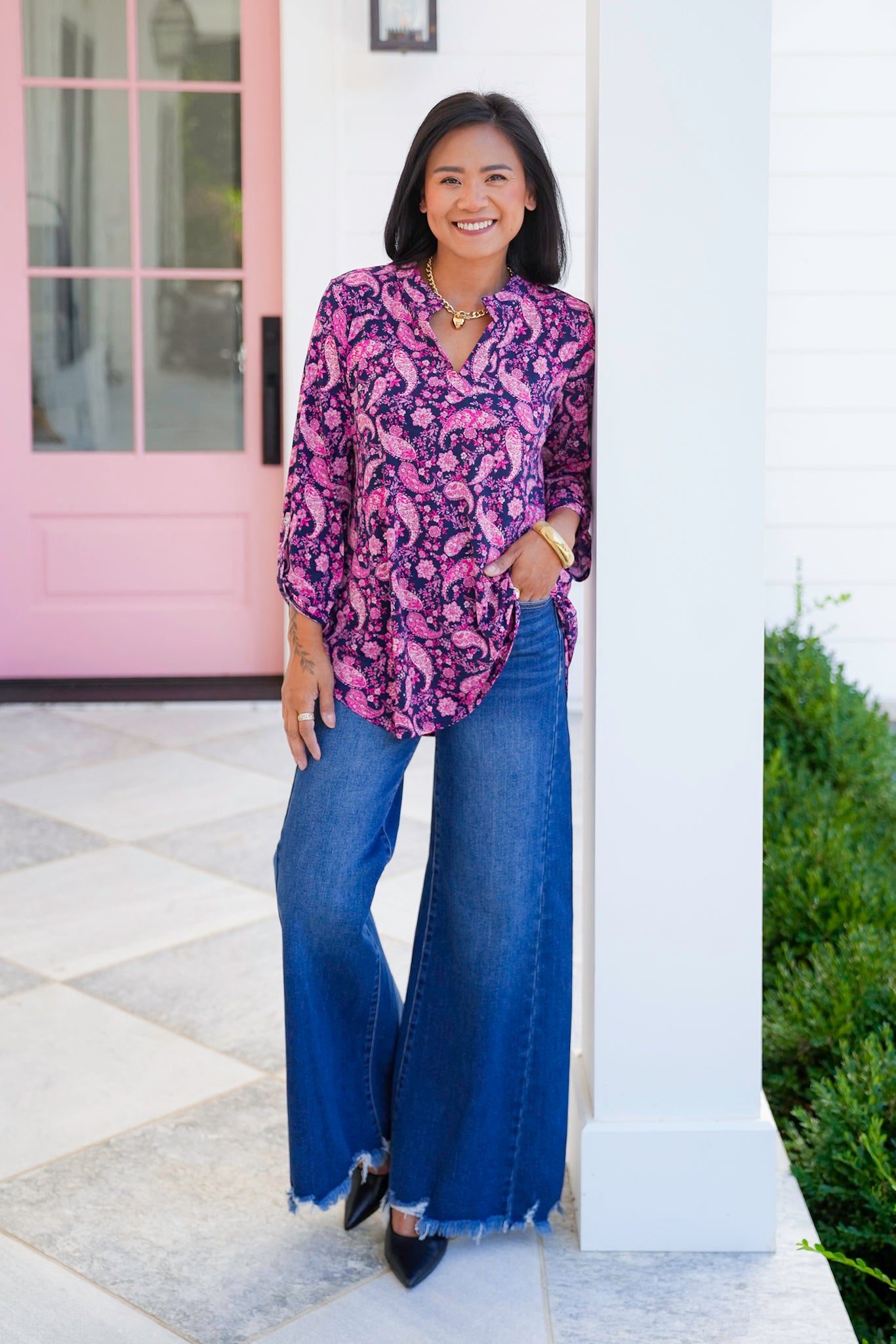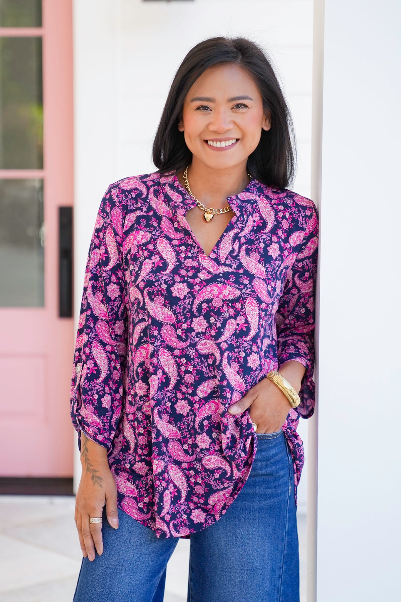 This navy and pink paisley tunic is the perfect pop of pattern for your wardrobe! The lightweight, wrinkle-free Bulgari fabric drapes beautifully and keeps you polished from morning to night. The notched v-neckline with a mandarin collar adds a chic touch, while the vibrant paisley print makes this top such a standout. Easy to dress up for work or style casually with denim, it’s a piece you’ll be reaching for again and again. With its easy-care fabric and classic cut, this is one of those tops that feels effortless but looks like you really pulled your outfit together.