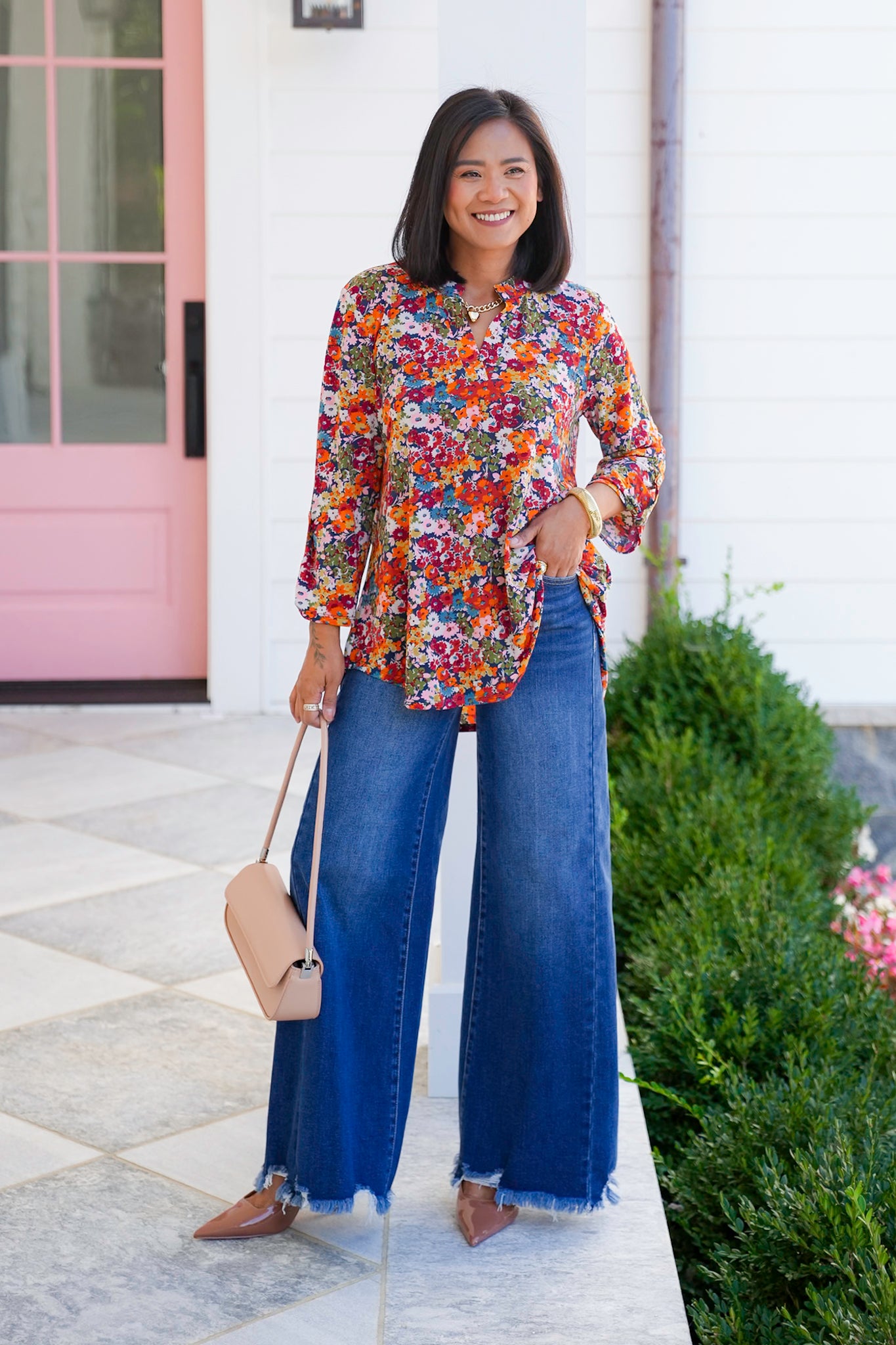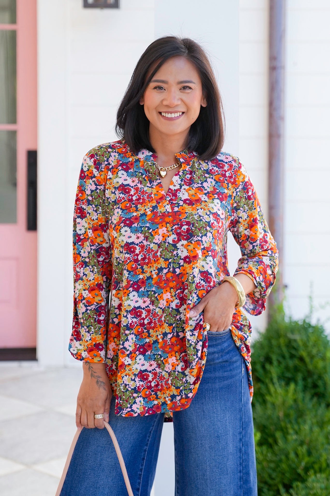 This tunic is the definition of style meets practicality. The vibrant floral print gives it a cheerful, standout look, while the Bulgari fabric makes it perfect for busy days—you’ll look polished from morning to night with zero effort. Dress it up with trousers and flats for work, or pair it with leggings and boots for a comfy yet chic weekend outfit.