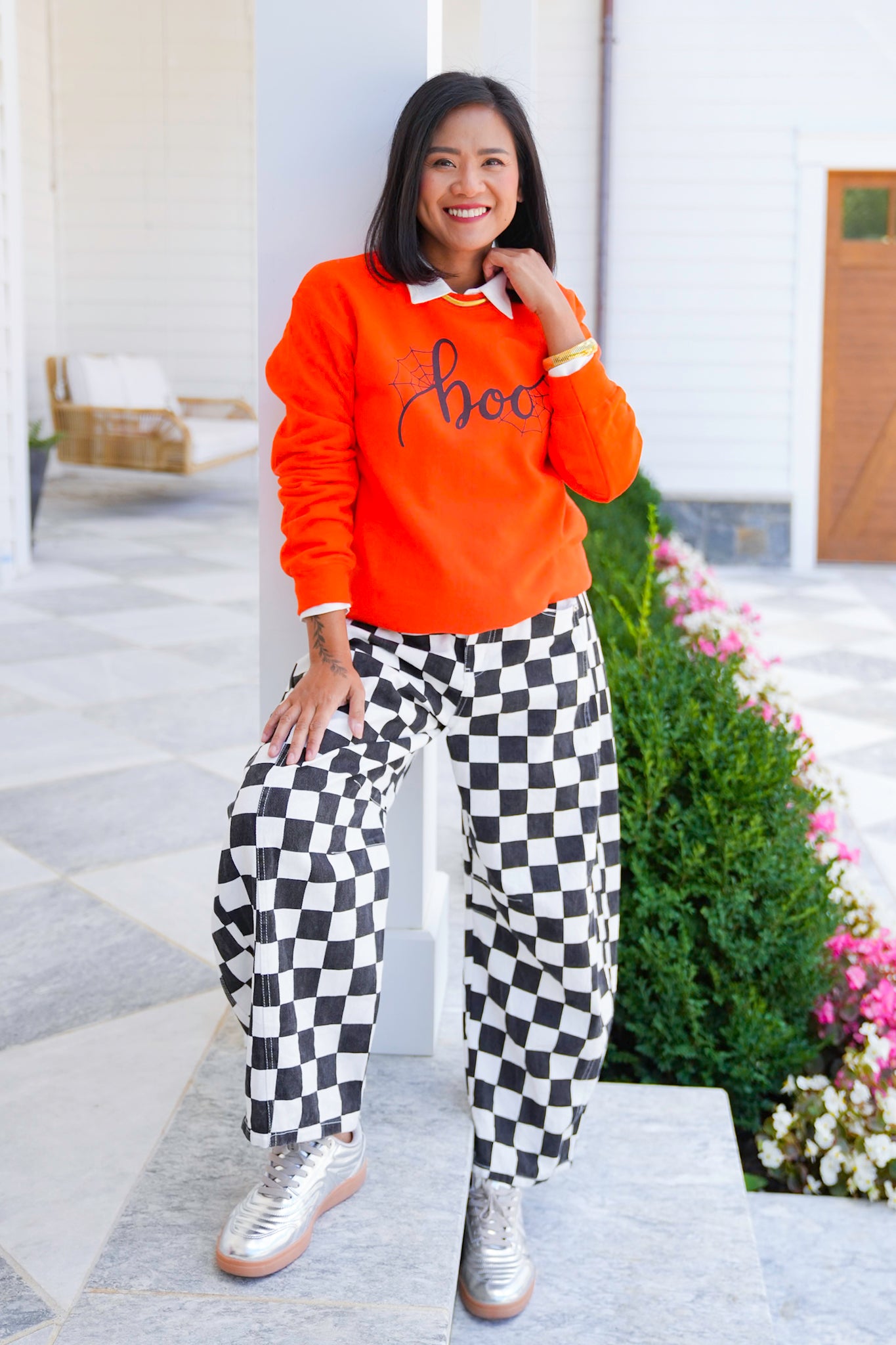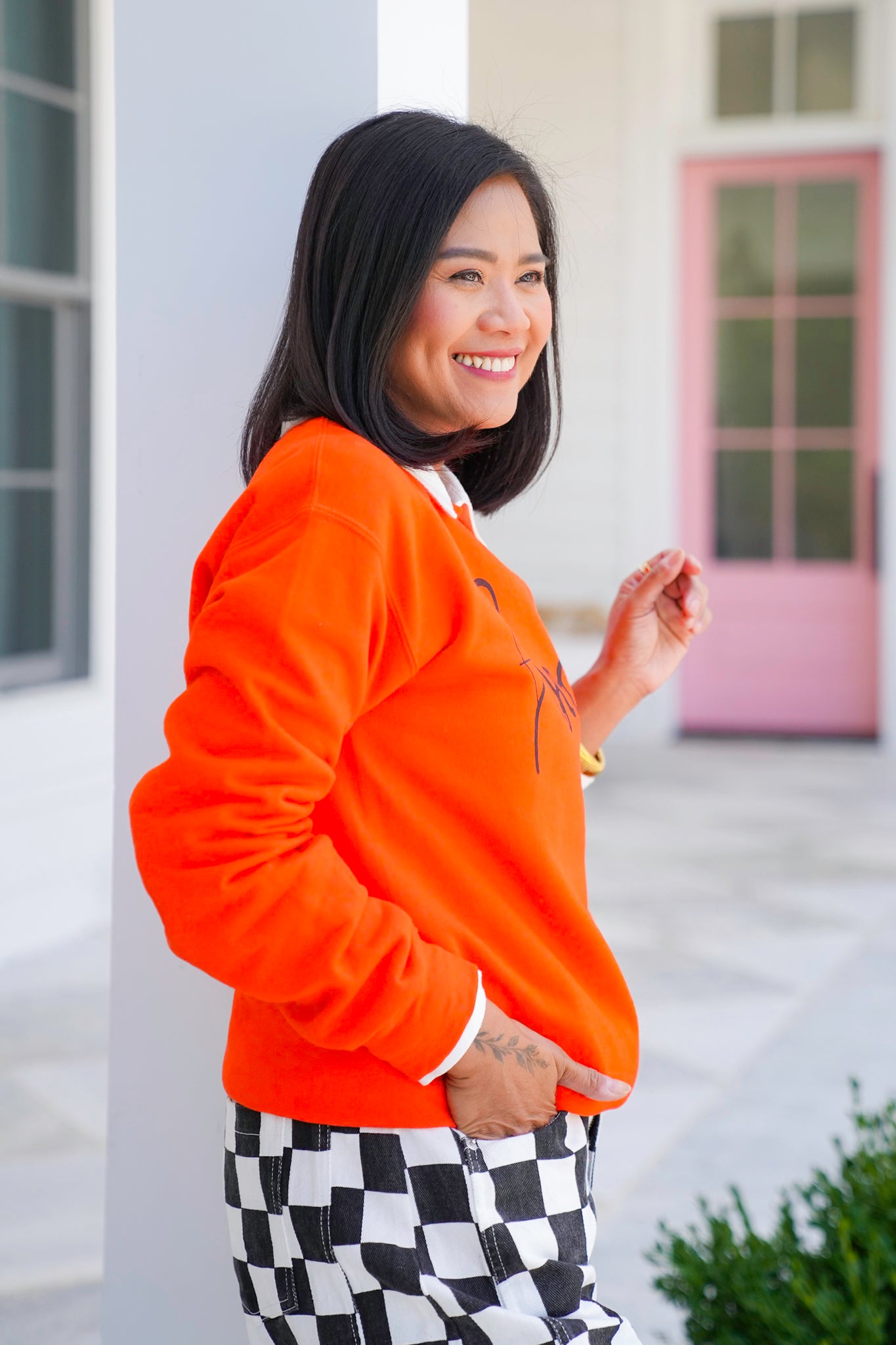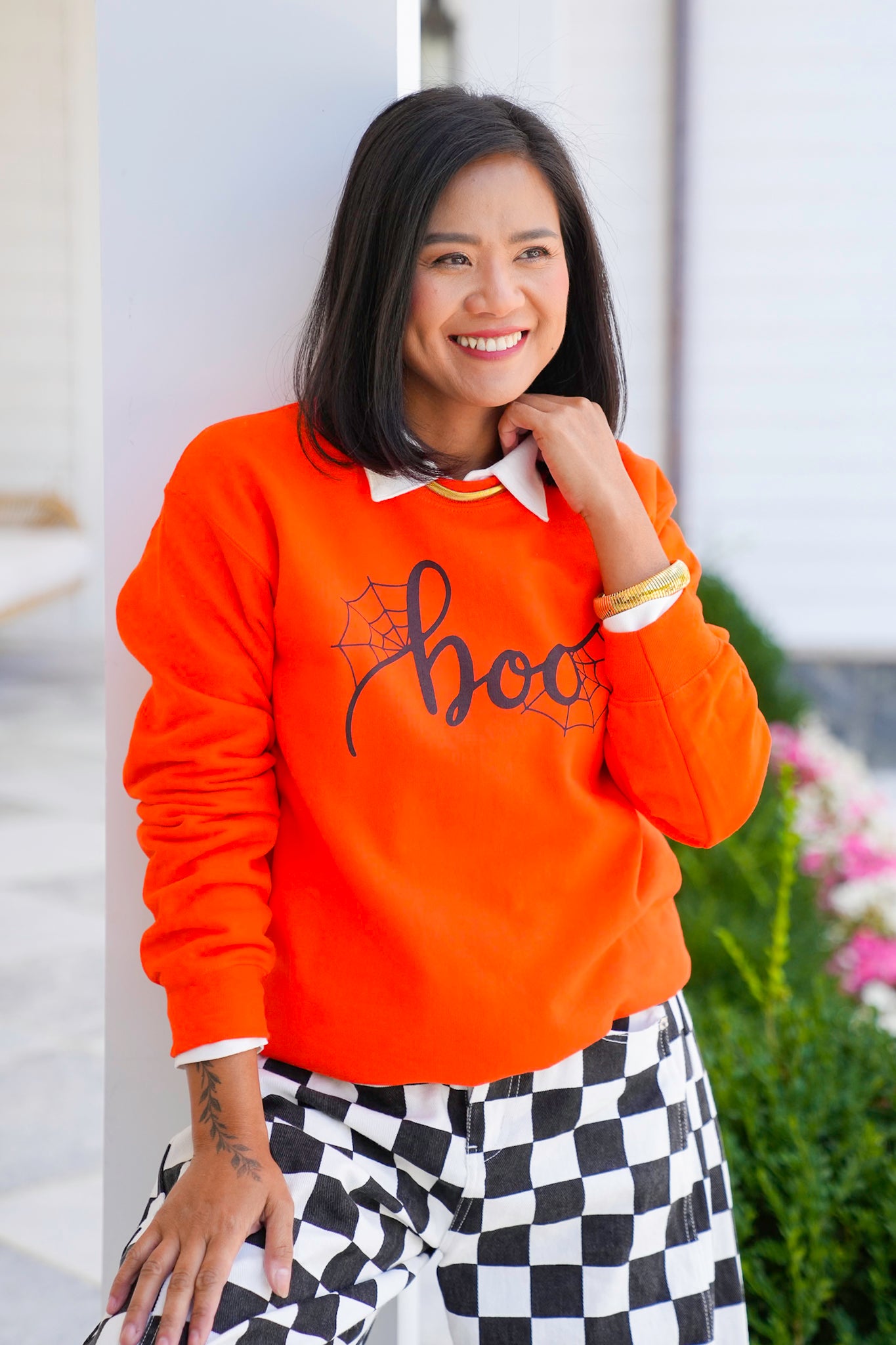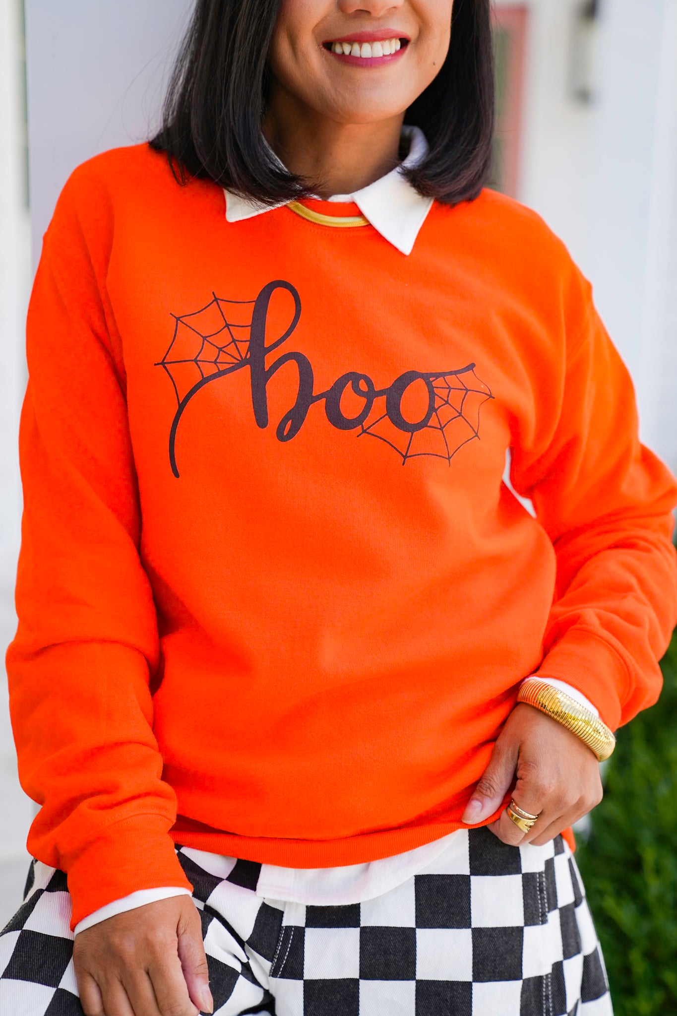 Bring on the spooky vibes with this bold orange “Boo” sweatshirt! The playful script with spiderweb accents makes it festive, fun, and so easy to wear all season long. With its soft fleece lining and classic crew neckline, this sweatshirt is perfect for everything from pumpkin patches to cozy nights in. Pair with denim, leggings, or even a checkered skirt for a Halloween-ready look.
