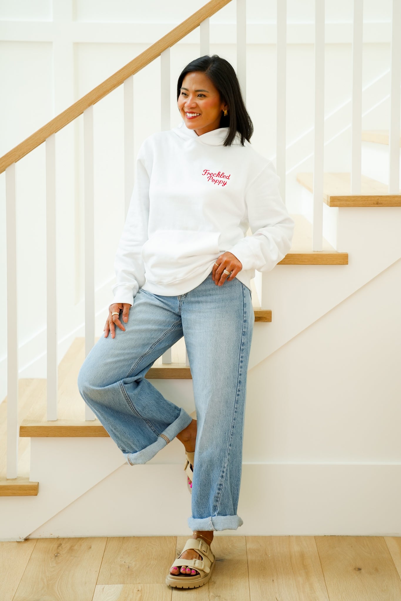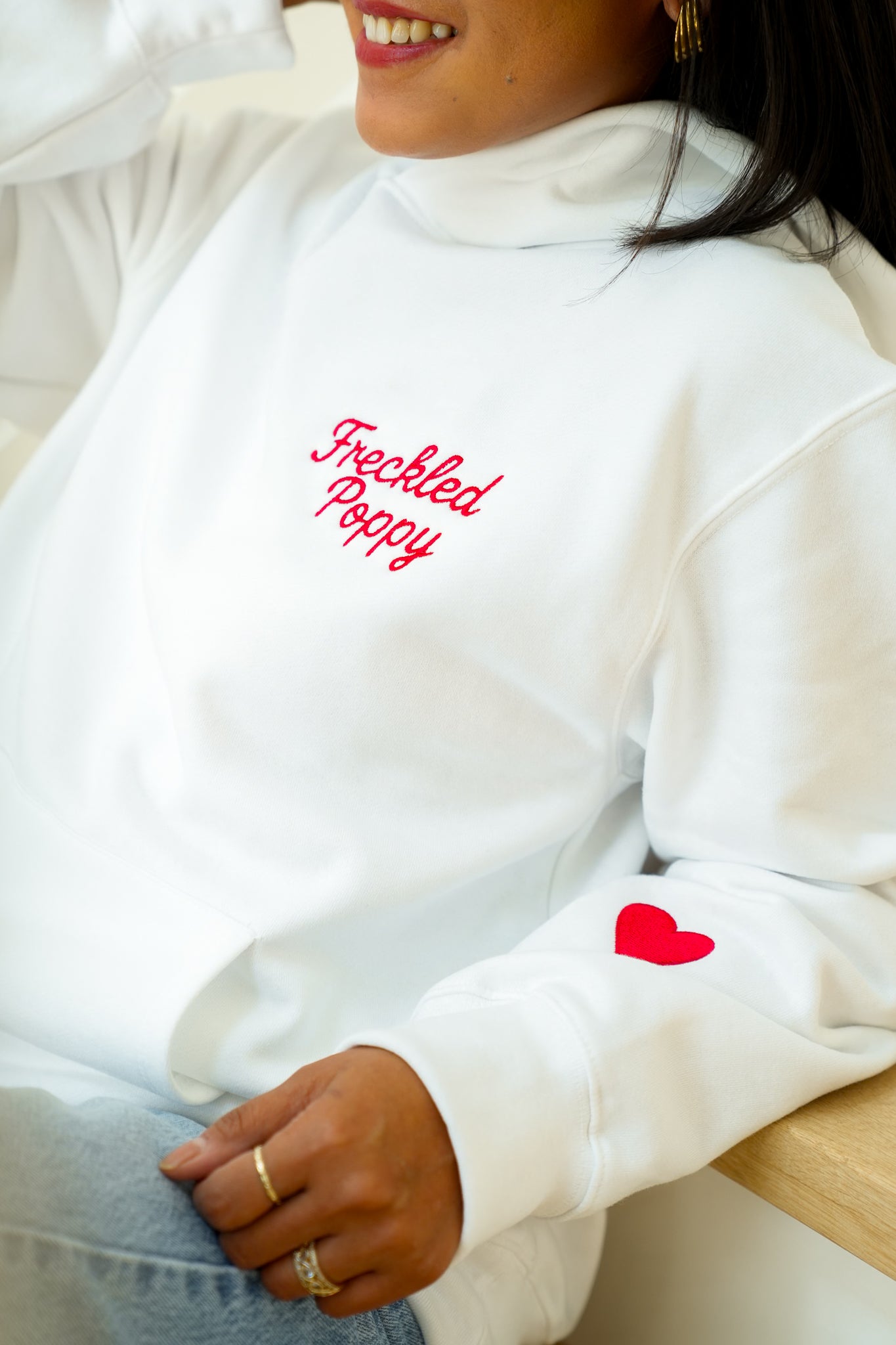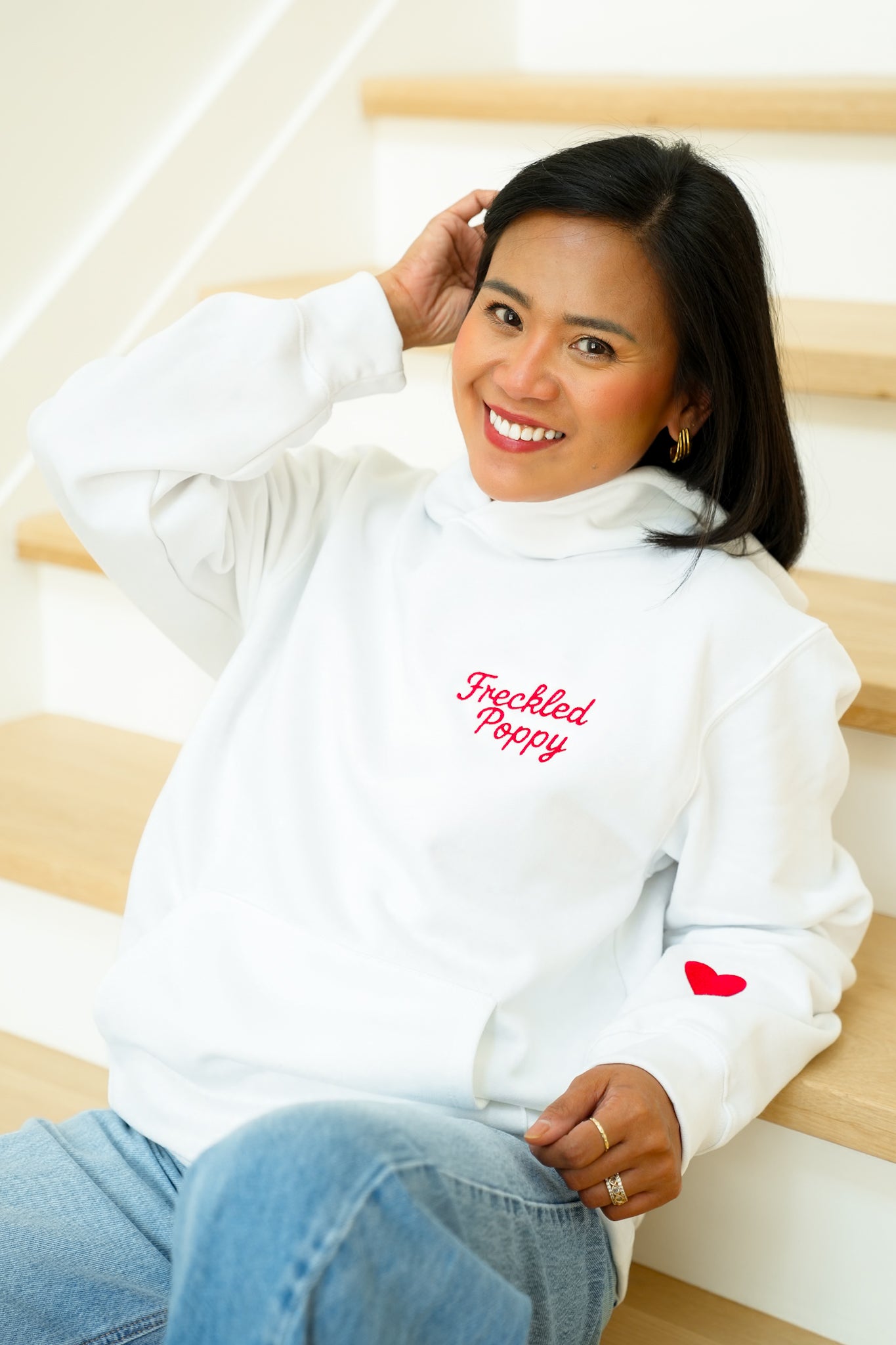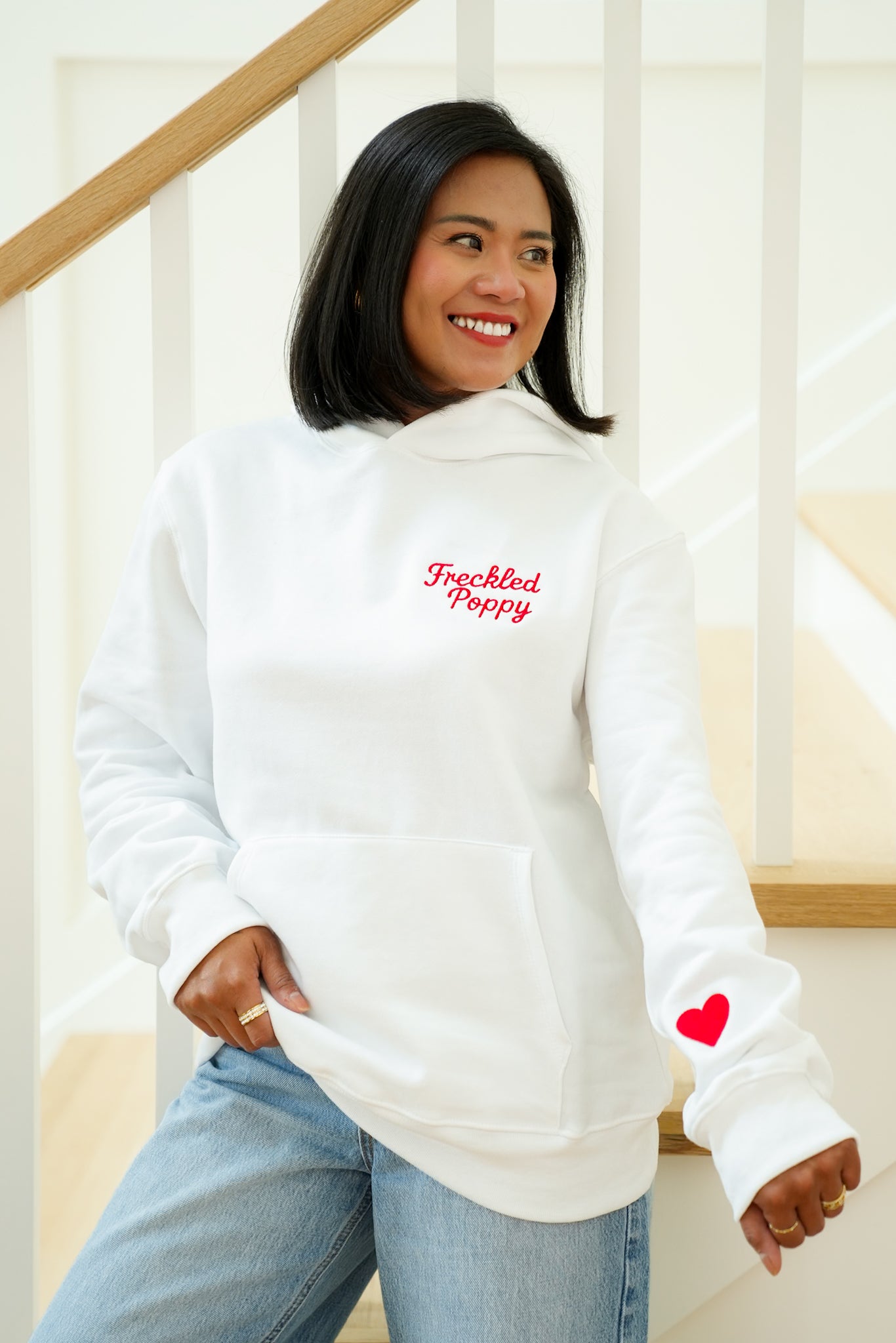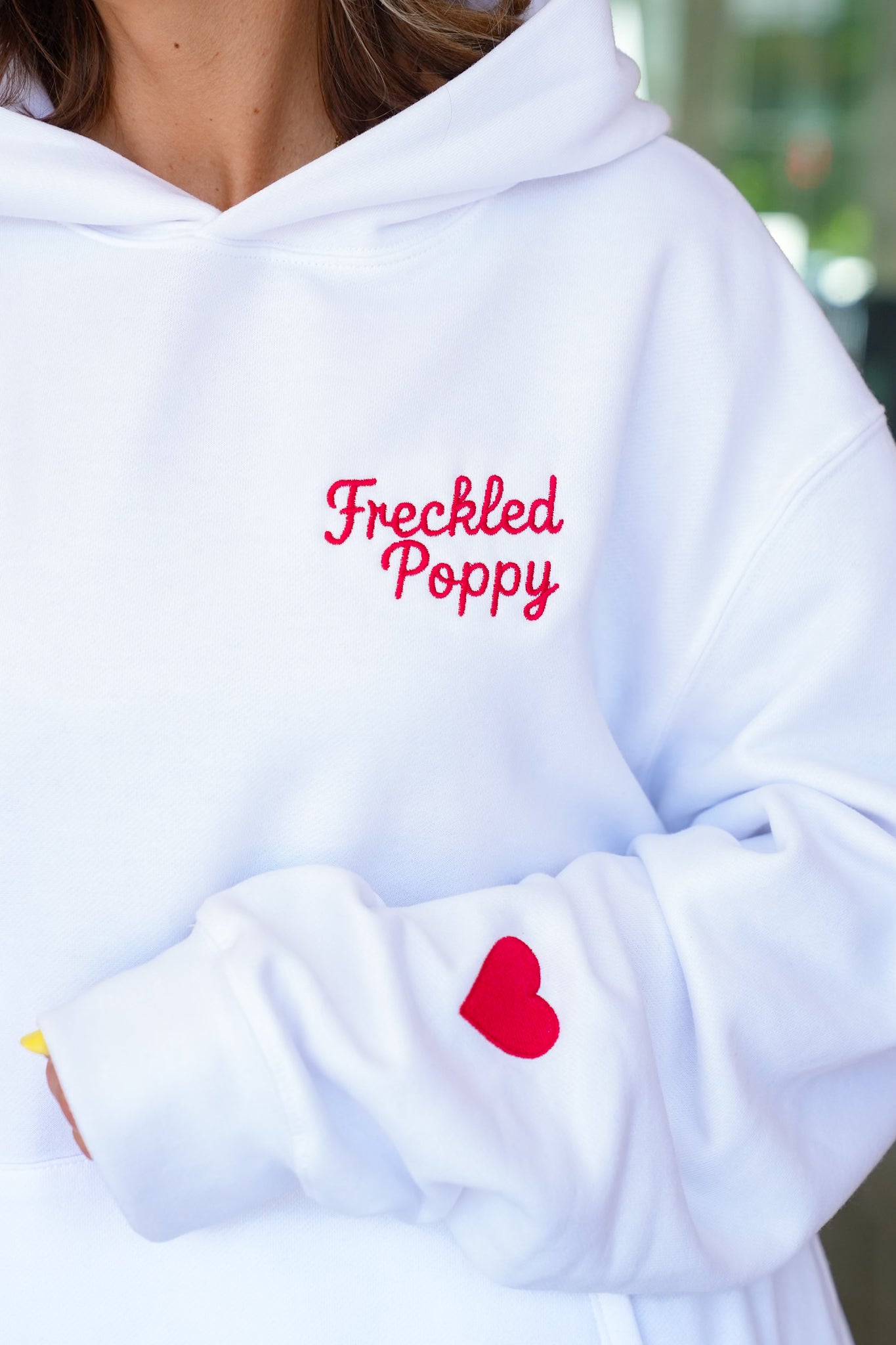 A little love, a little cozy—this adorable graphic hoodie is pure joy! With the sweetheart on the sleeve and embroidered Freckled Poppy front, it’s a playful fave for coffee runs and couch hangs. Style it with denim, joggers, or your favorite leggings.
