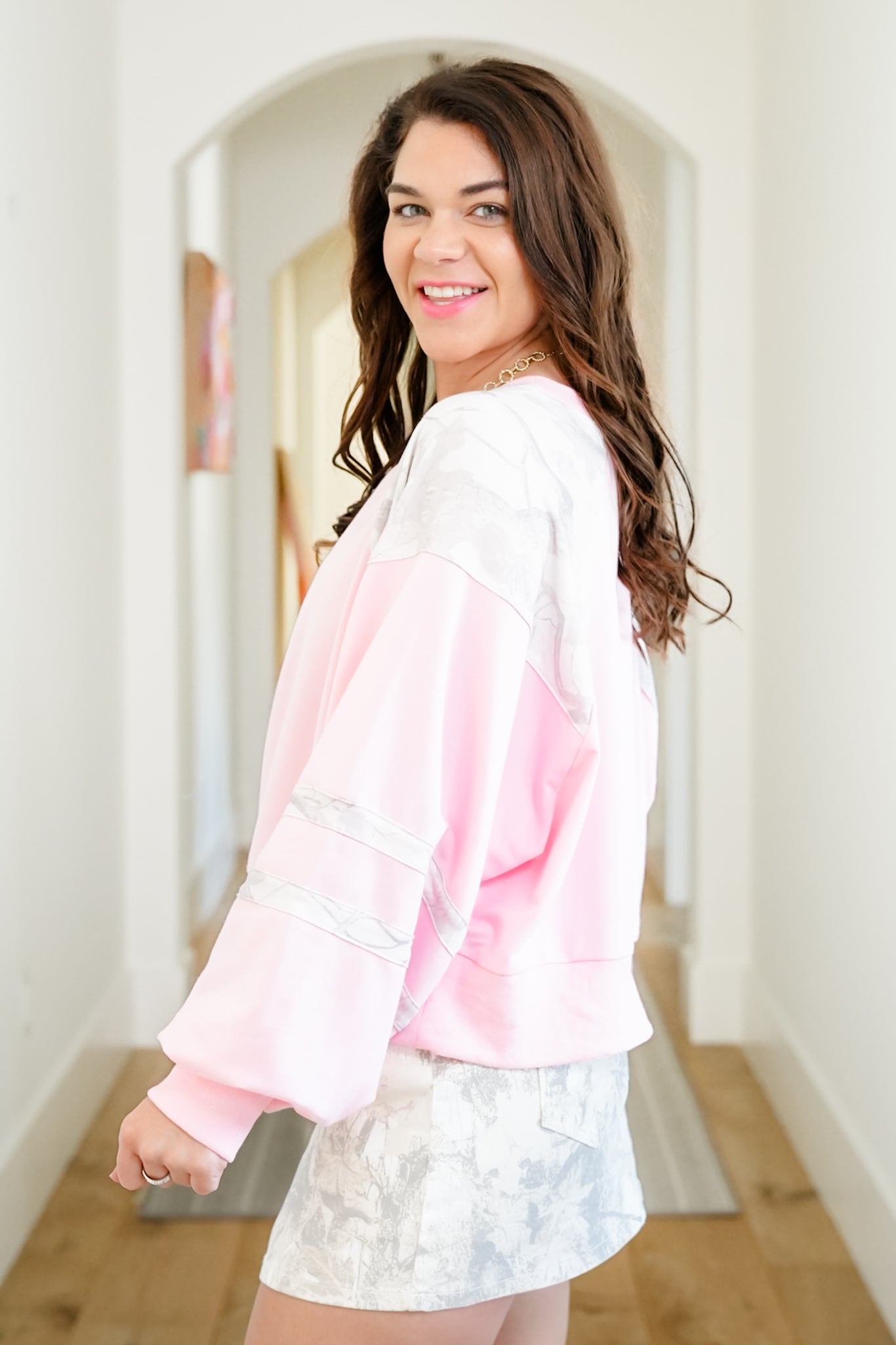 This pullover takes everyday comfort up a notch with camo-accented panels that add just the right amount of visual interest. The lightweight fabric keeps it comfortable, and the roomy sleeves create a relaxed, modern shape that always looks good. Pair it with denim, joggers, or leggings for an easygoing look that still feels polished.
