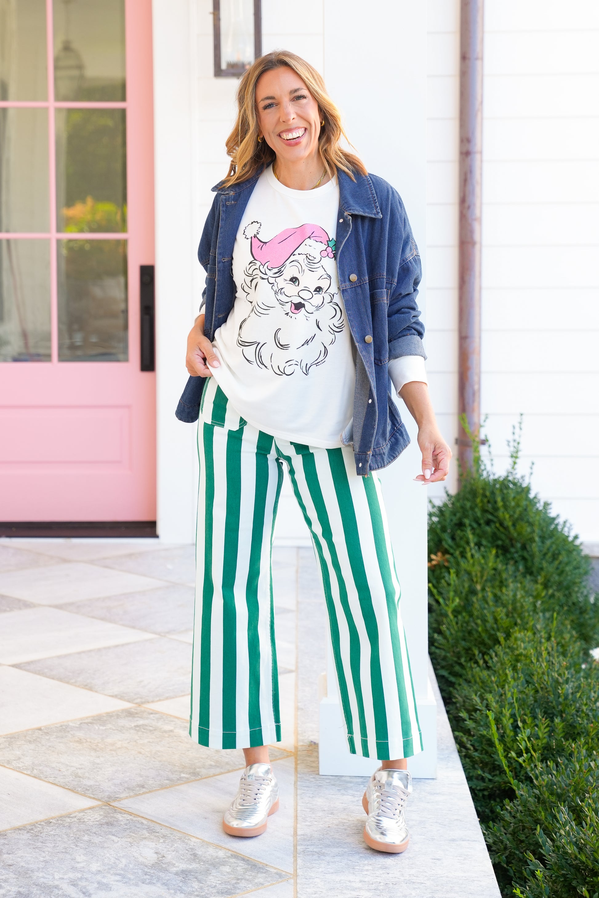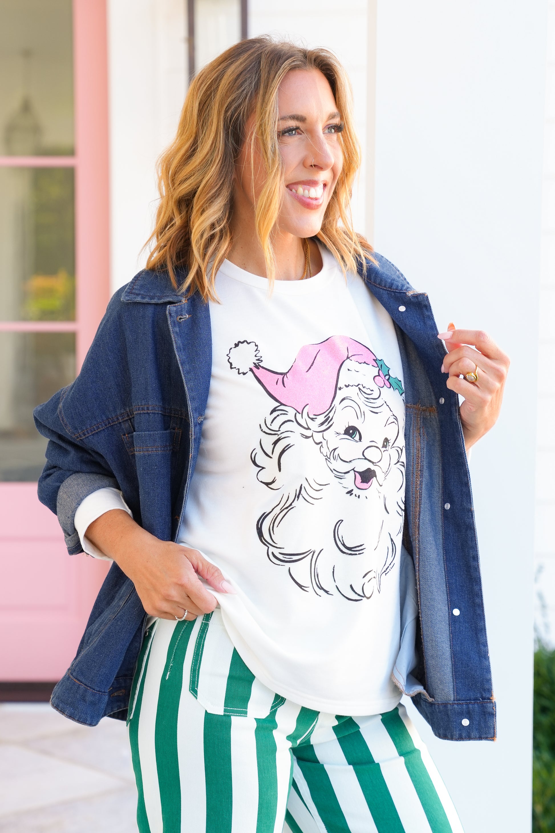 Add a nostalgic touch to your holiday lineup with this classic Santa pullover. The cheerful print and lightweight comfort make it a must-have for festive mornings or casual celebrations. Easy to pair with jeans, skirts, or festive pants for a fun fit!
