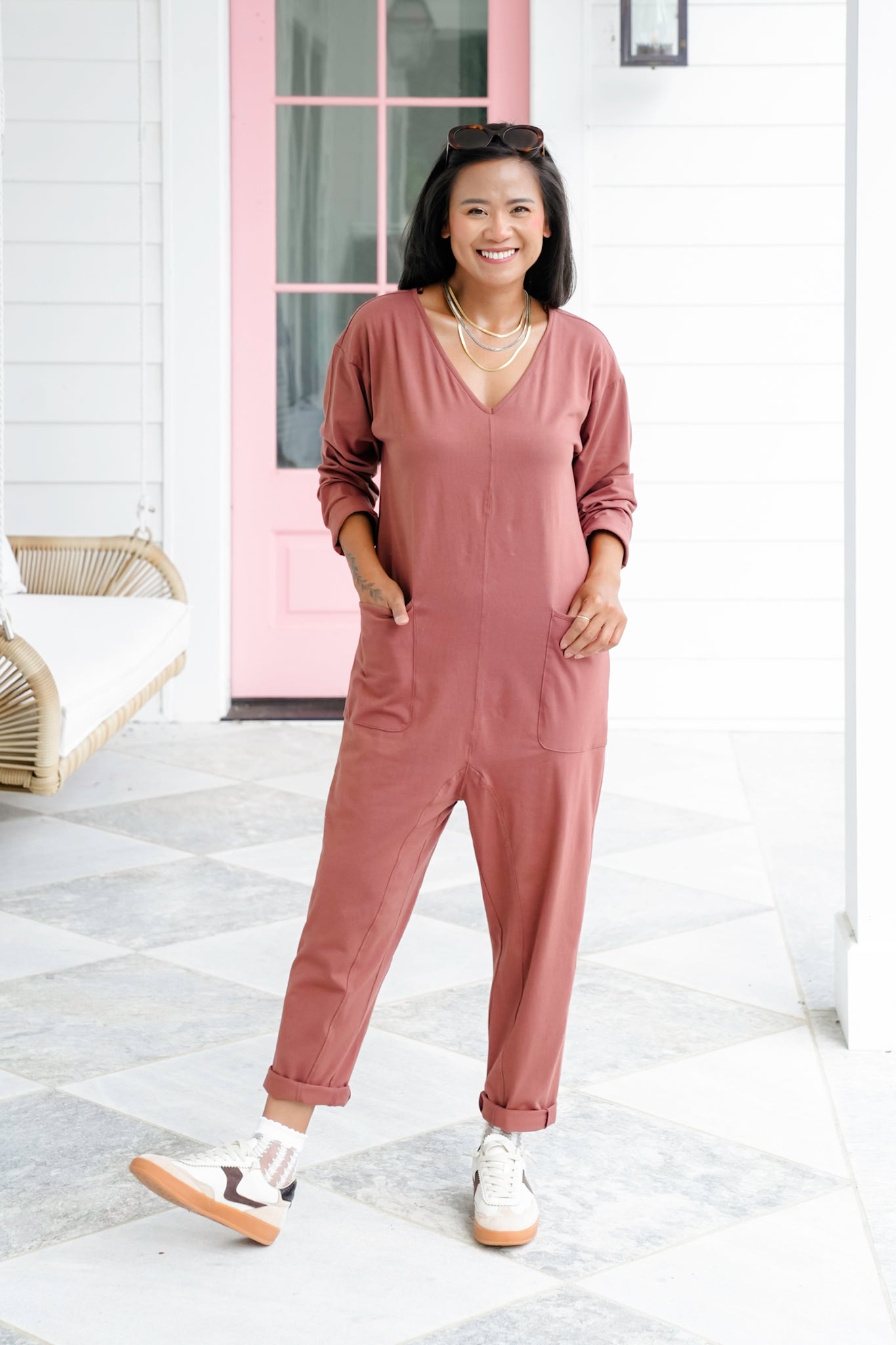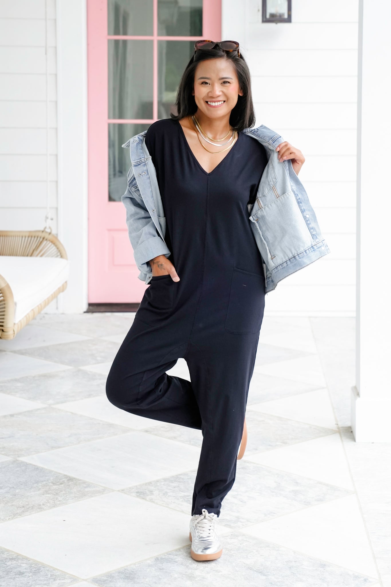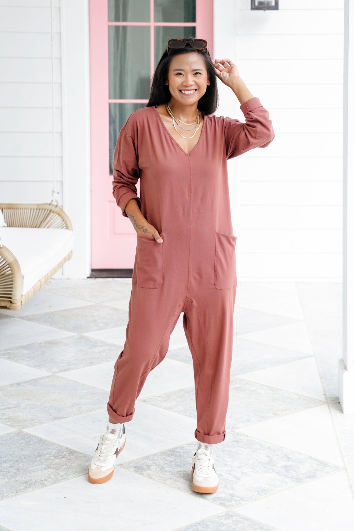 This jumpsuit is about to become your anytime, anywhere fave. Buttery soft with the dreamiest stretch, it moves with you without losing its shape. Deep V neckline keeps things flattering, and functional front patch pockets give it that lived-in, laid-back vibe we all crave. Layer it with a denim jacket, rock it solo with sneakers or sandals, or belt it up for a touch of structure.