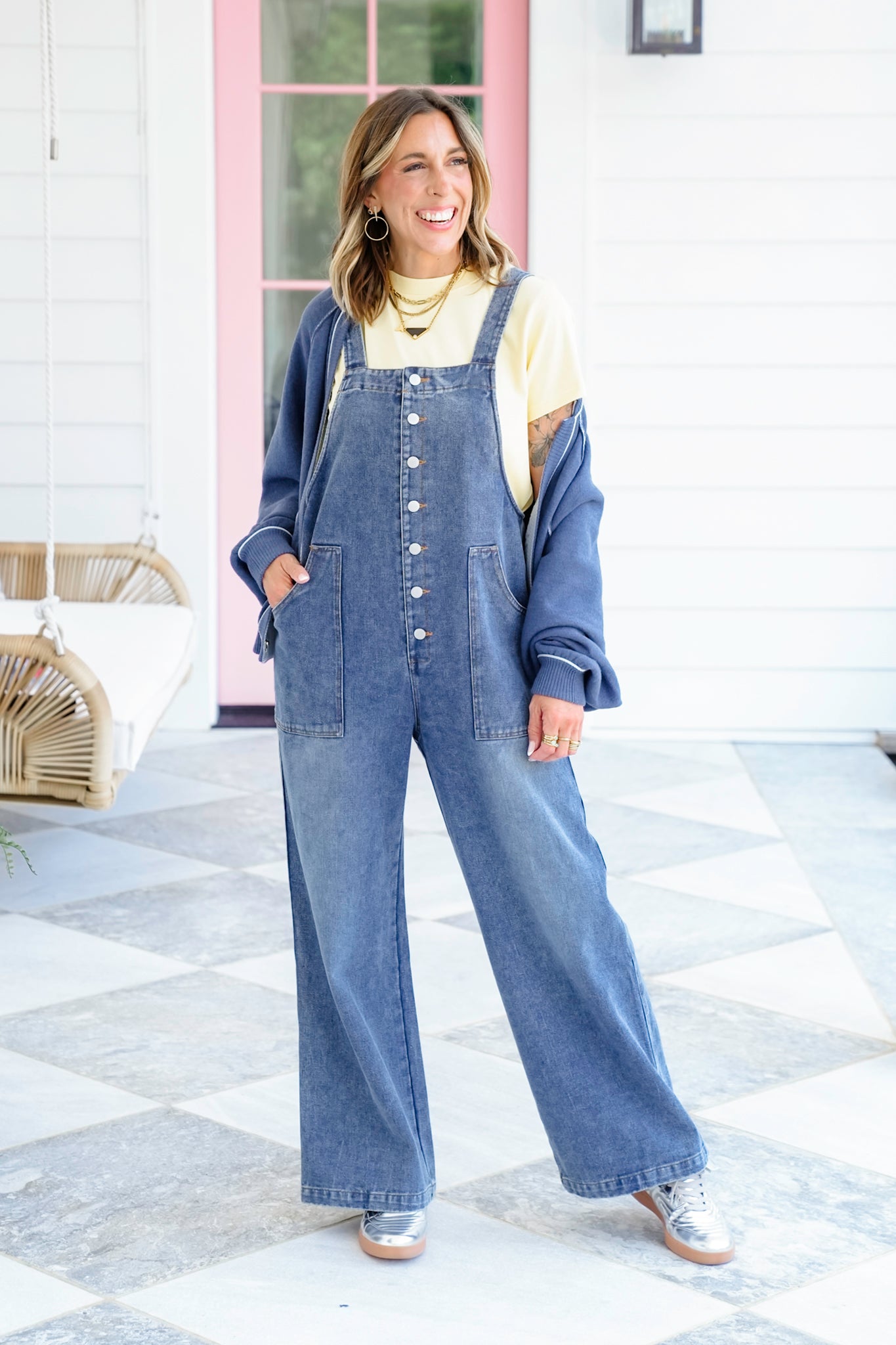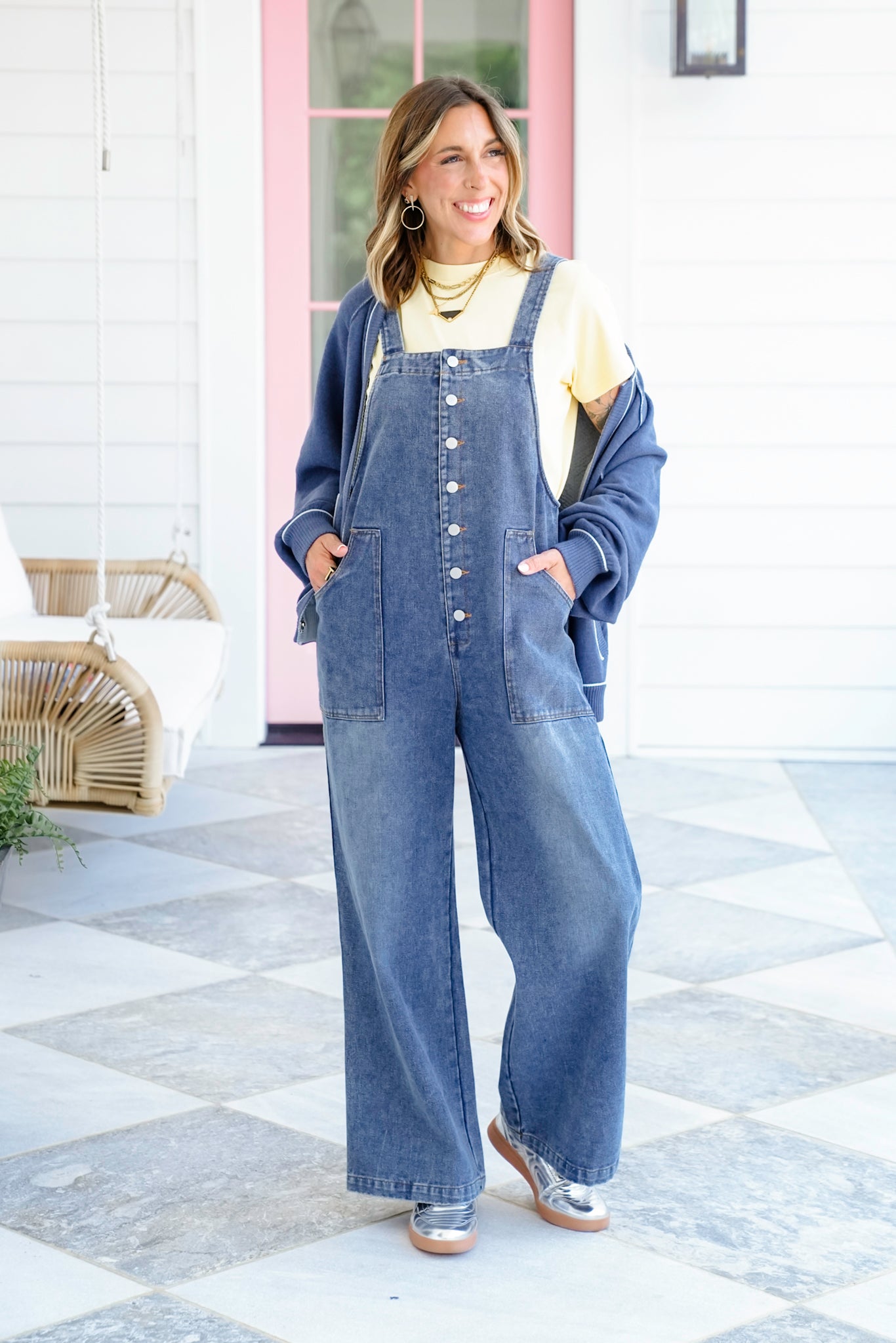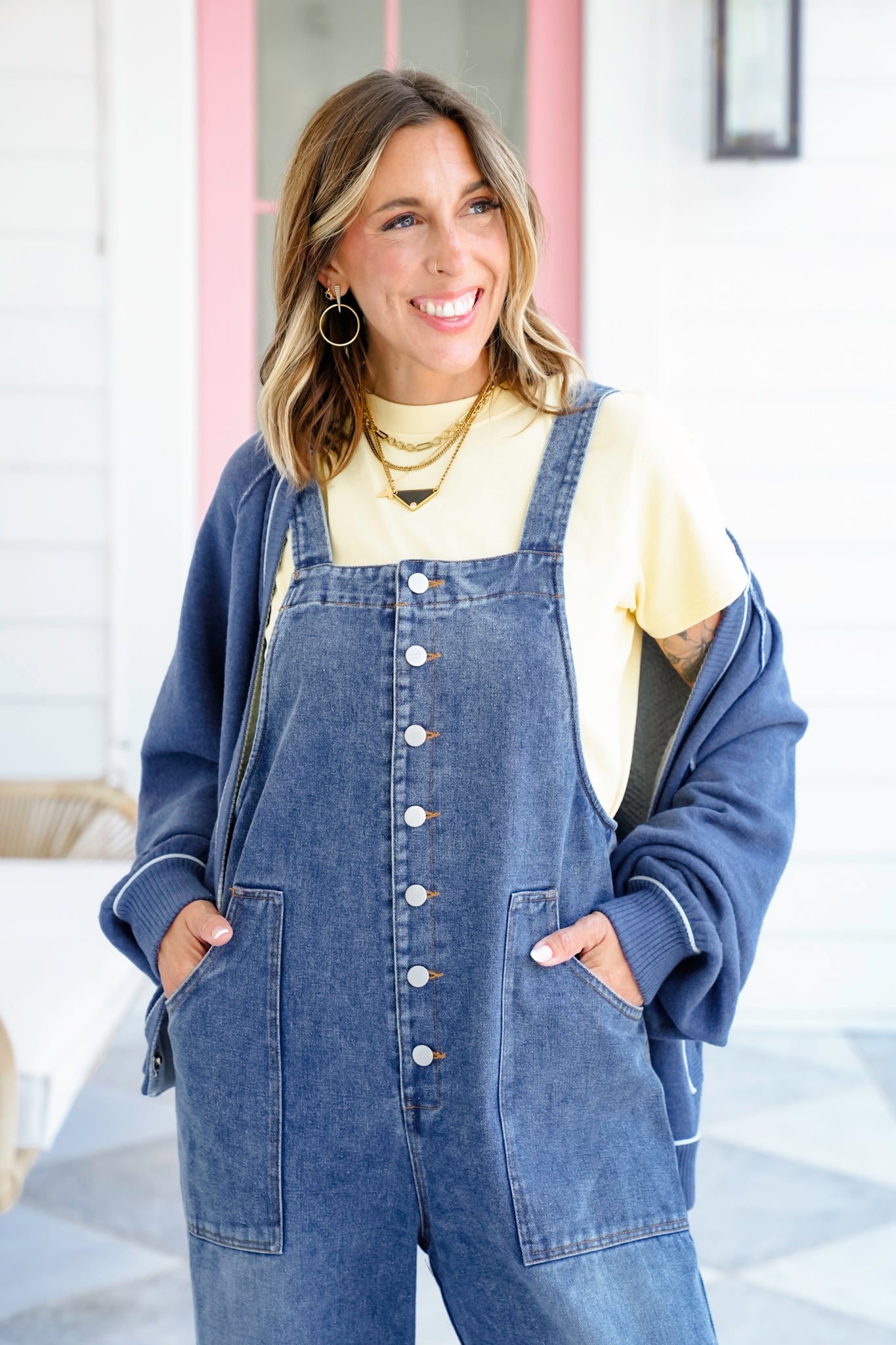 Bring an easy-going style to life with these medium wash button-up overalls. The relaxed wide-leg cut, adjustable straps, and deep pockets make them a throw-on-and-go favorite. Whether layered with a tee, sweater, or tank, these overalls are ready for anything from weekend errands to coffee dates.