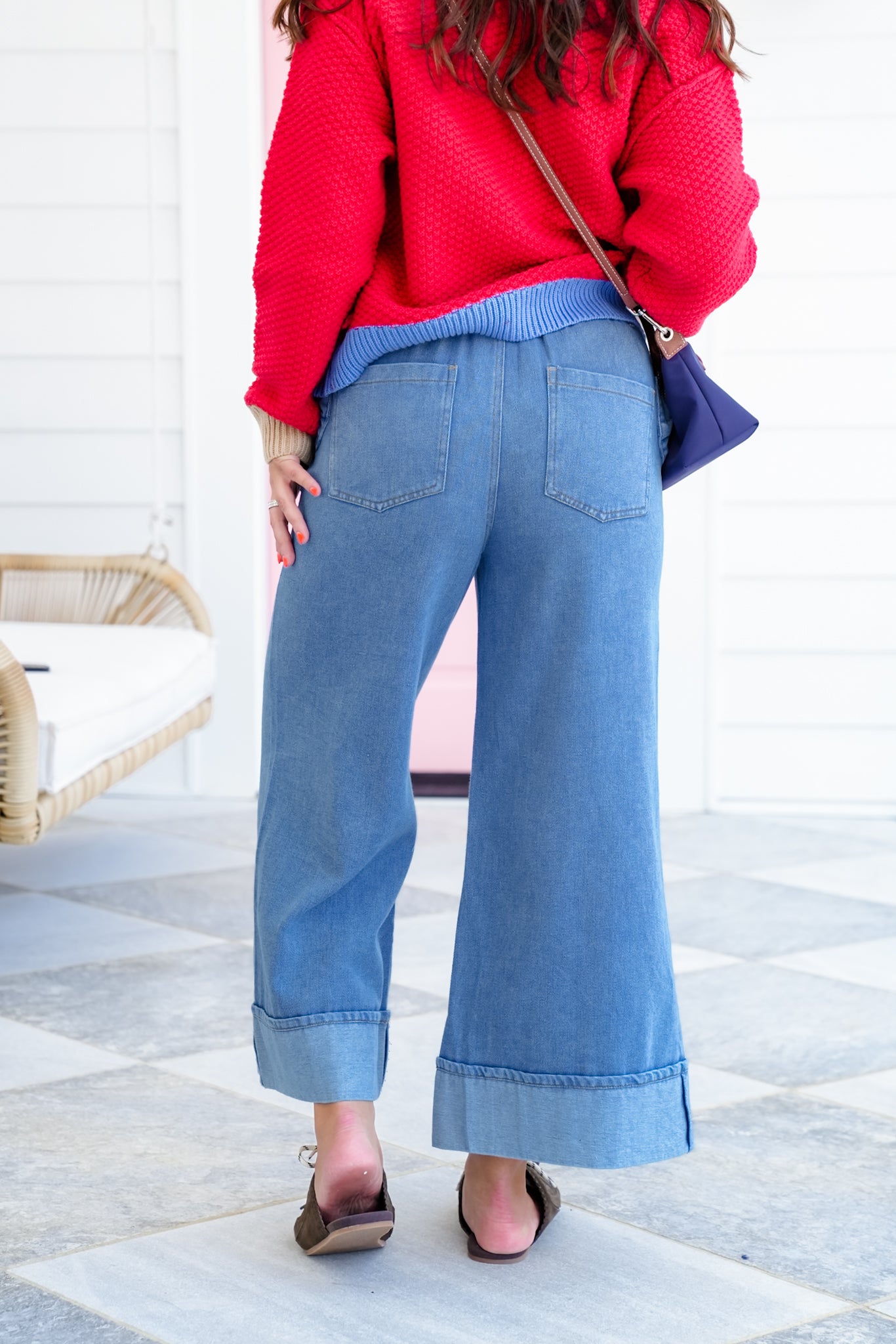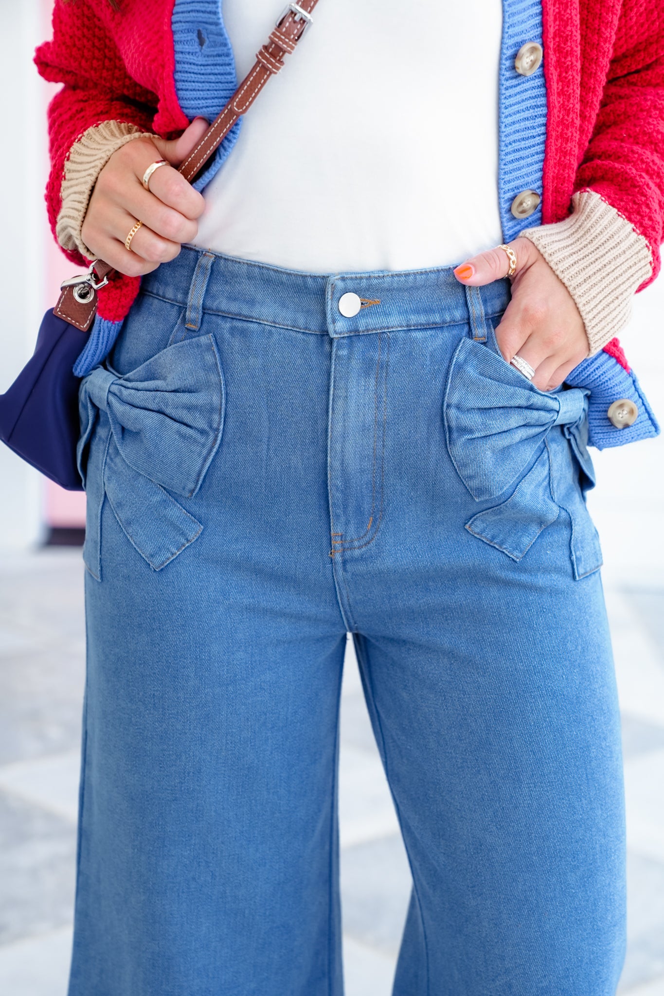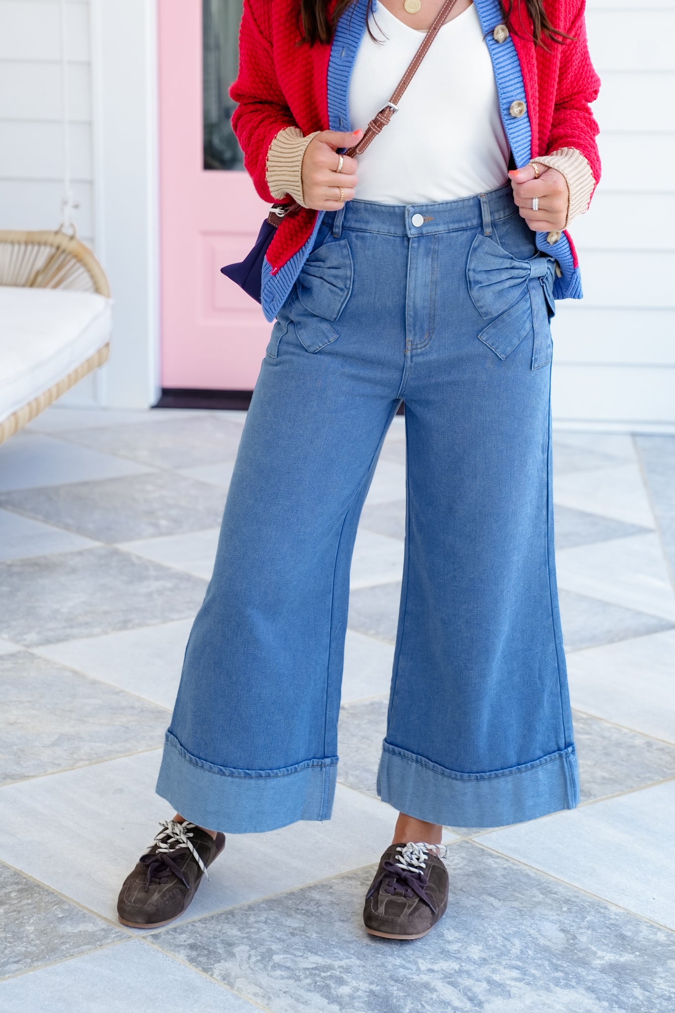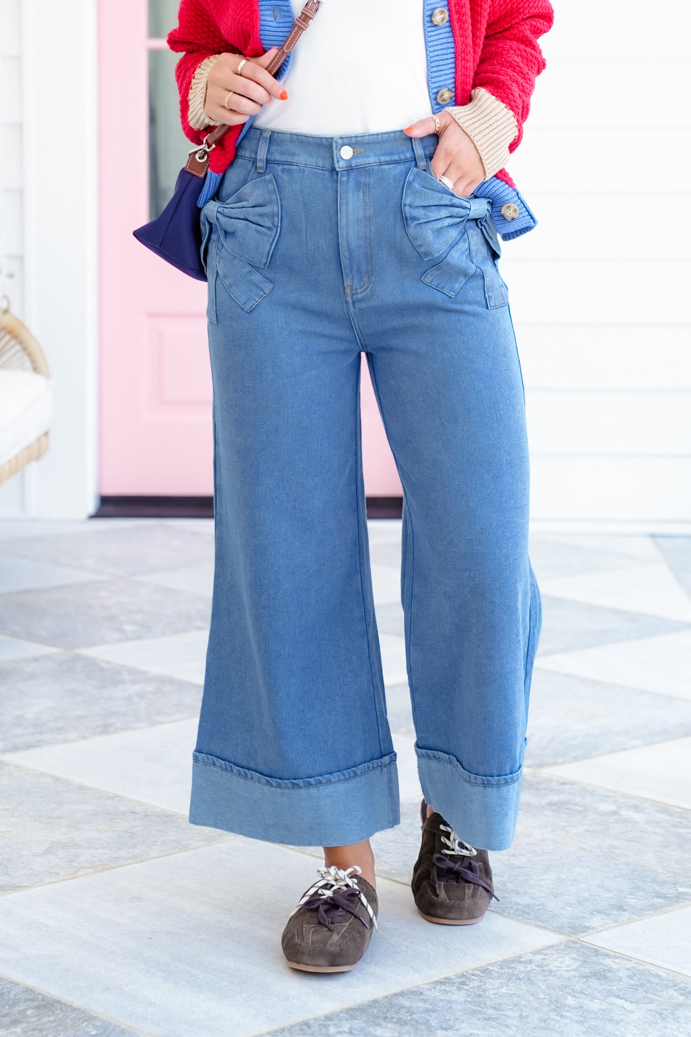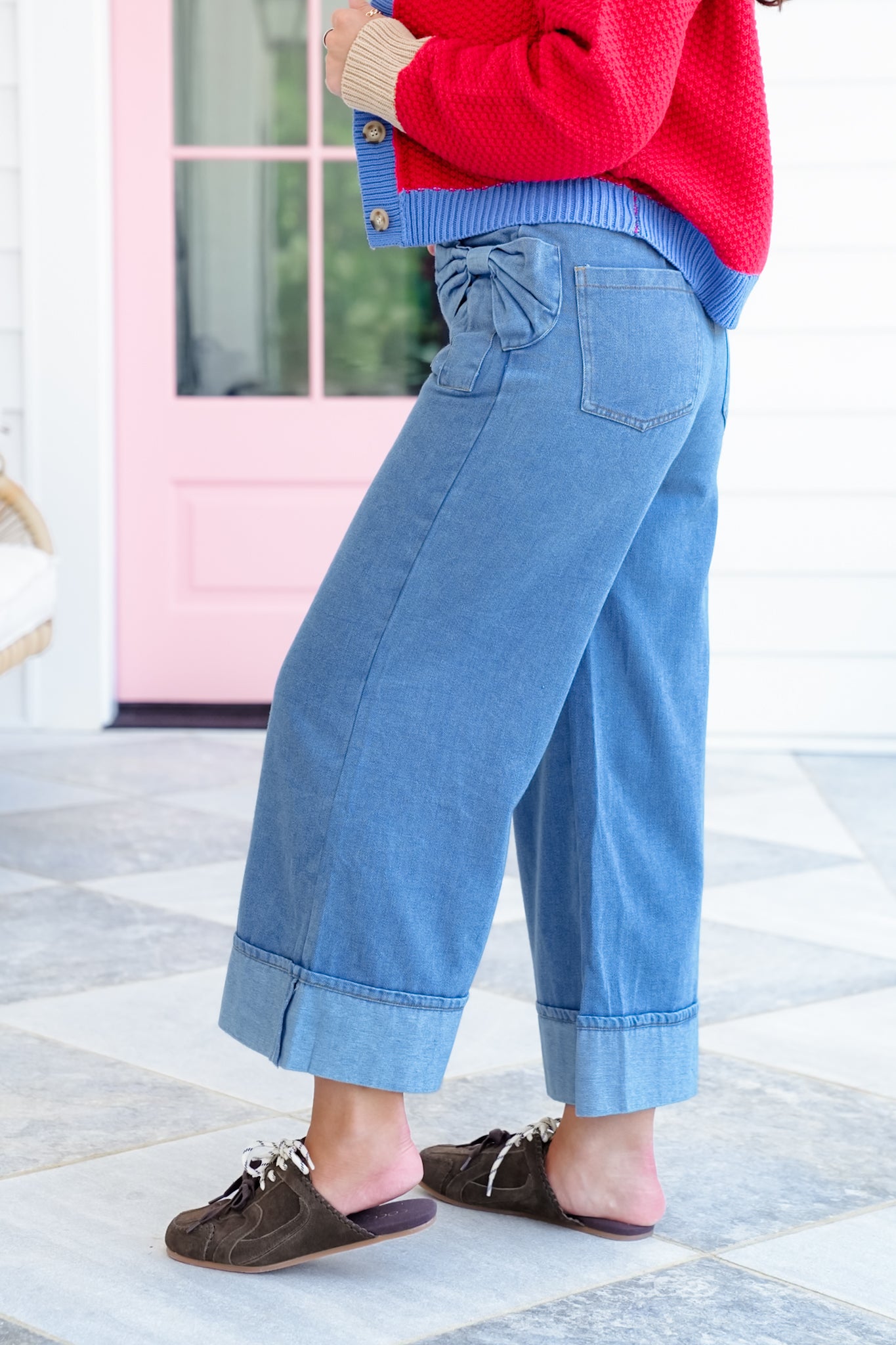 These wide-leg pants are denim-inspired perfection with a girly twist. The bow details at the front pockets instantly elevate them from basic to boutique, while the cropped wide leg and cuffed hem give them that fashion-forward edge. Dress them down with sneakers and a tee for a casual day look or pair with heels and a blouse for something more polished.