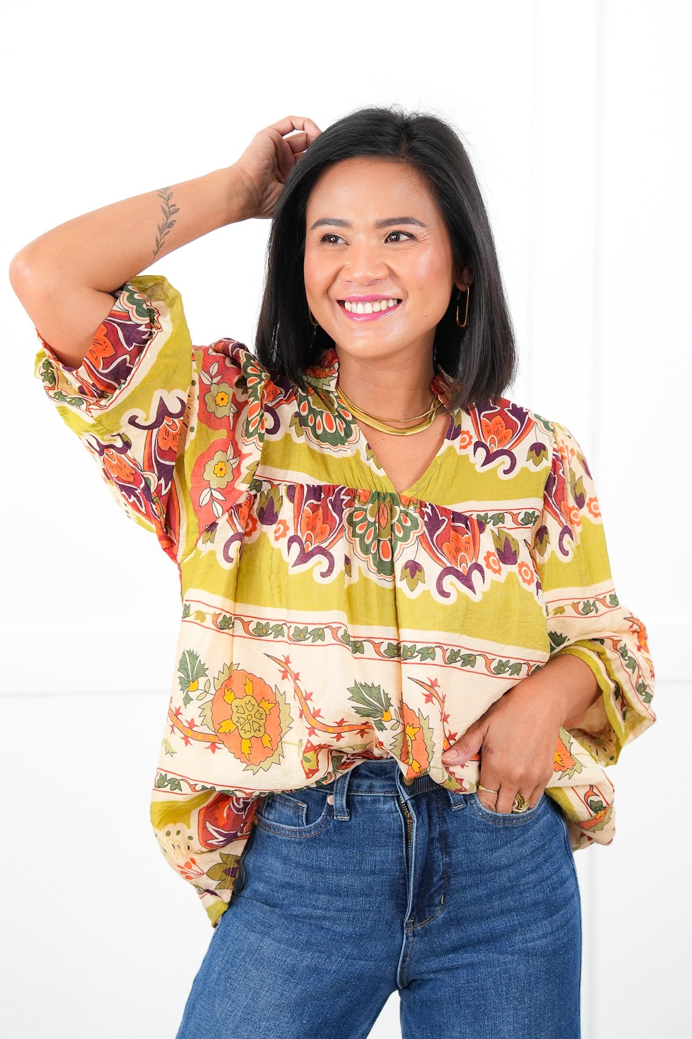 Transform your look with this vibrant, eye-catching top! Bold prints and colors collide for a statement piece that's impossible to ignore. The split V-neck adds a flirty touch, while 3/4 puff sleeves bring the drama. Available in plus and regular sizes, it's designed to flatter every figure. Pair with jeans for a casual pop, or dress it up for a night out. Ready to turn heads and boost your confidence? This top is your secret weapon for instant style!