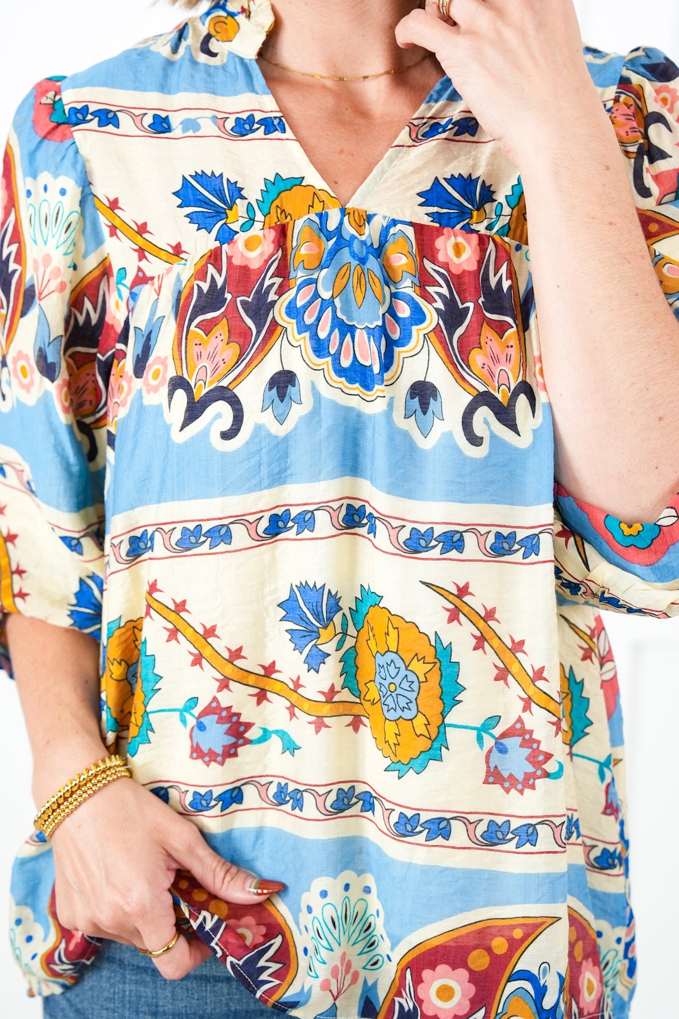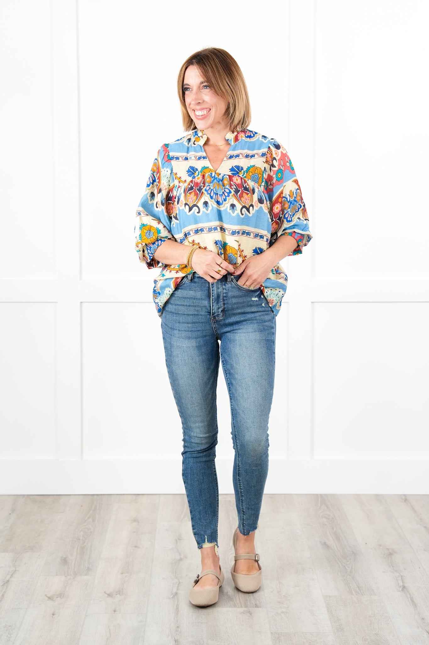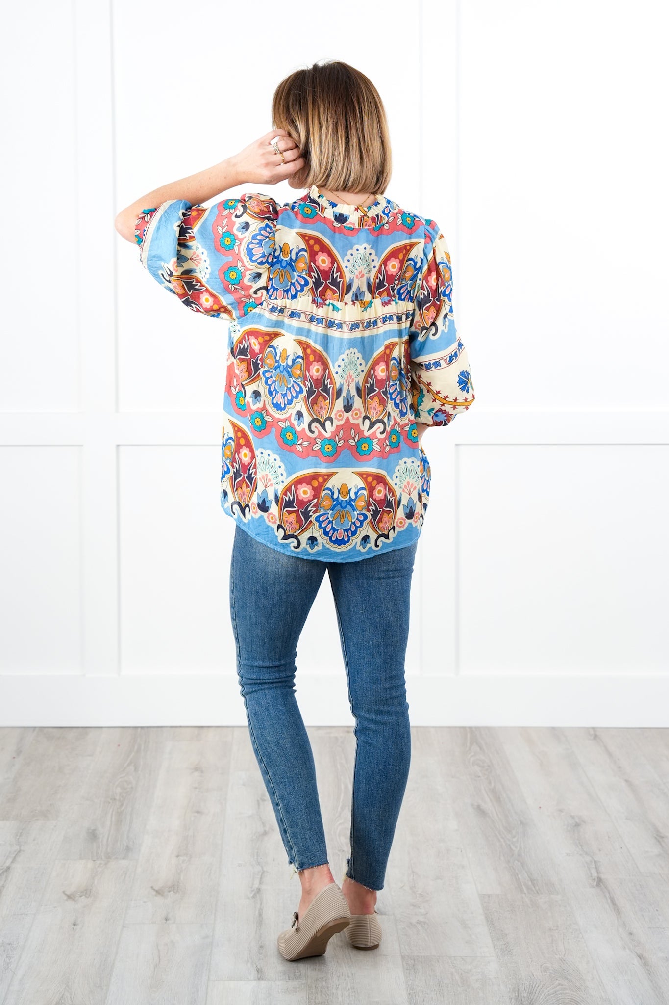 Fit: This blouse is a total statement! It is bright and colorful with a sophisticated pattern that will stand out in a crowd. The conservative v-neck, puff 3/4 sleeves, and slight pleating create a flowy and feminine masterpiece. It has a roomy fit. If you are between sizes, you can size down.