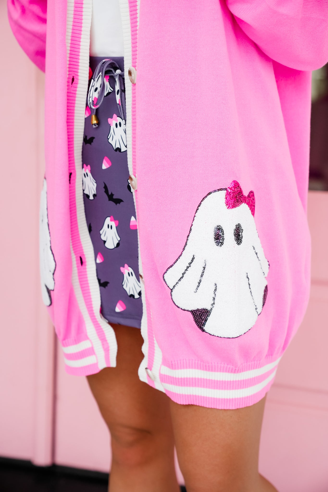 This cardigan brings sweet and spooky together in the cutest way! The vibrant pink base pops with sequin ghost patches, while the striped trim gives it that sporty-chic vibe. Perfect for layering over tees, tanks, or even a dress, this cardigan instantly adds personality and festive flair to your outfit.