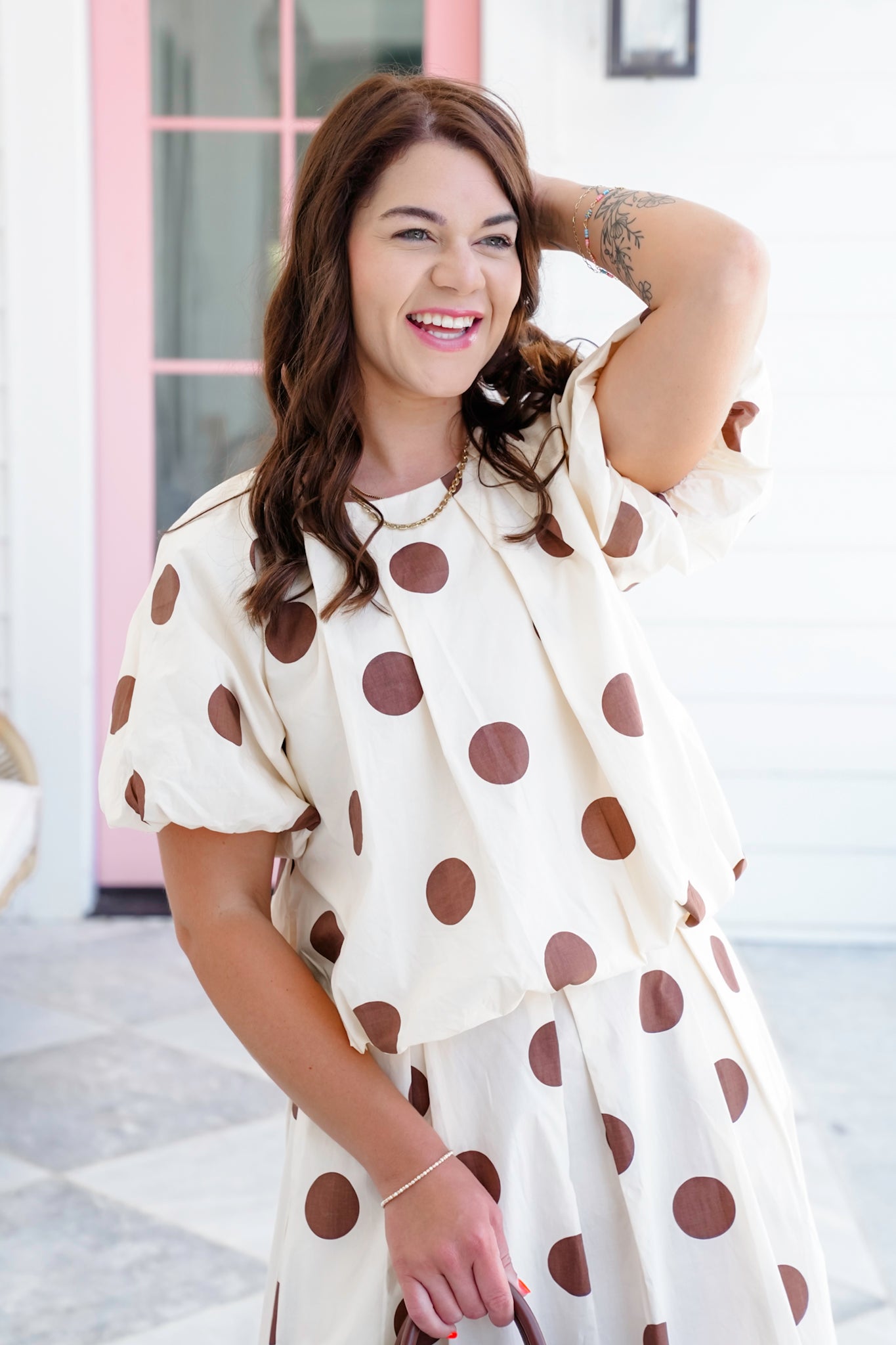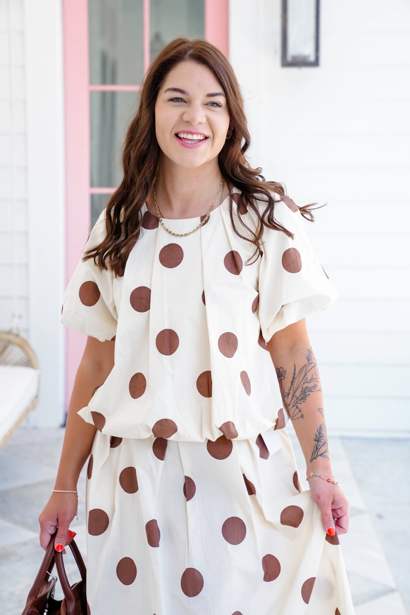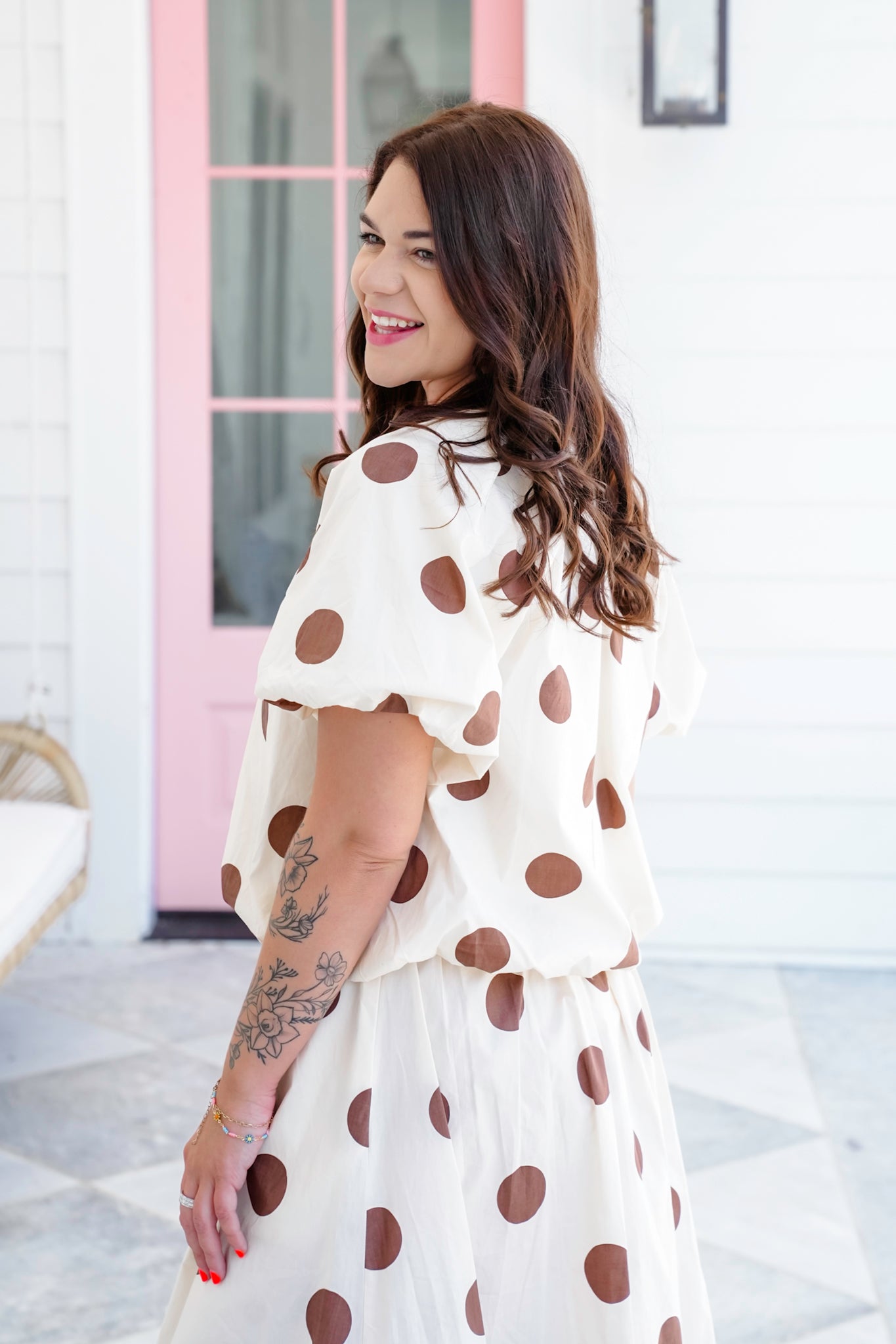 This bubble hem top is flirty, fun, and polished all in one. The bold polka dots pop against the flowy silhouette, while the pleated bubble hem and puff sleeves add just the right amount of playful drama. Pair it with the matching skirt for a two-piece look that turns heads, or tuck it into tailored pants or denim for a chic mix-and-match moment.