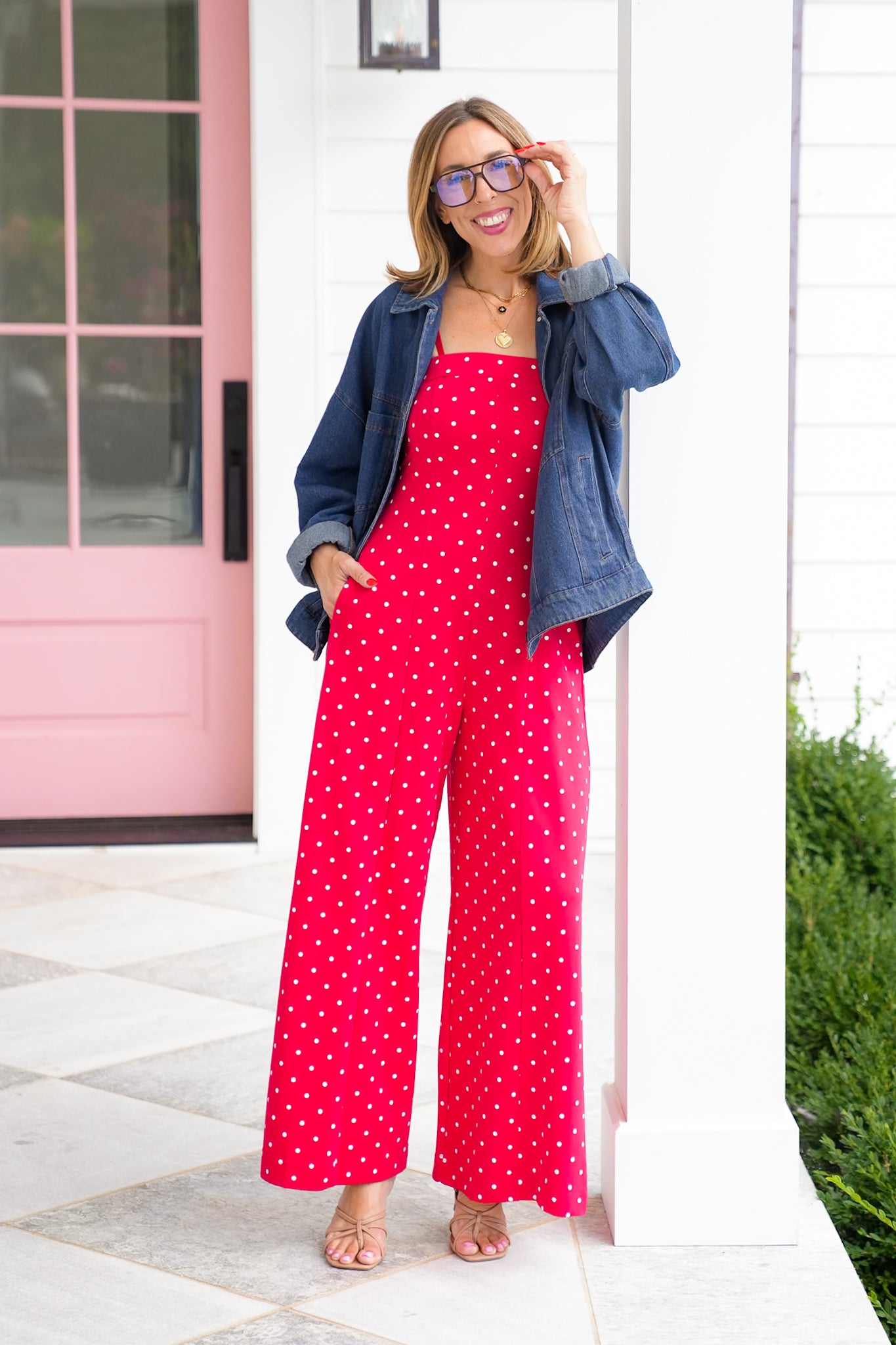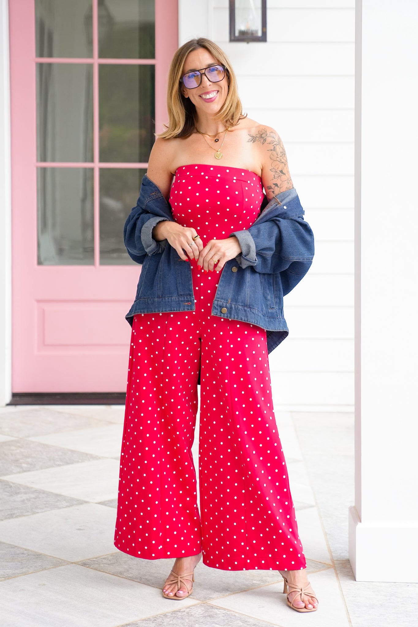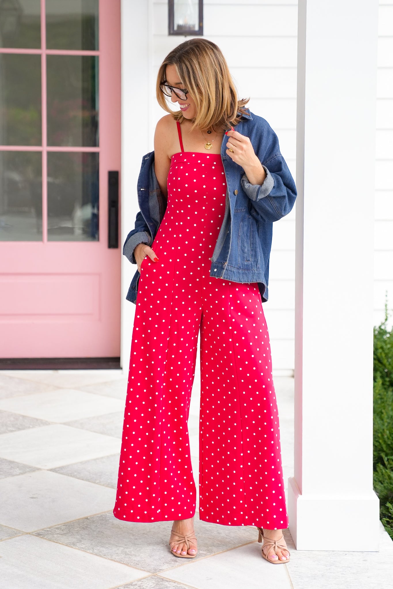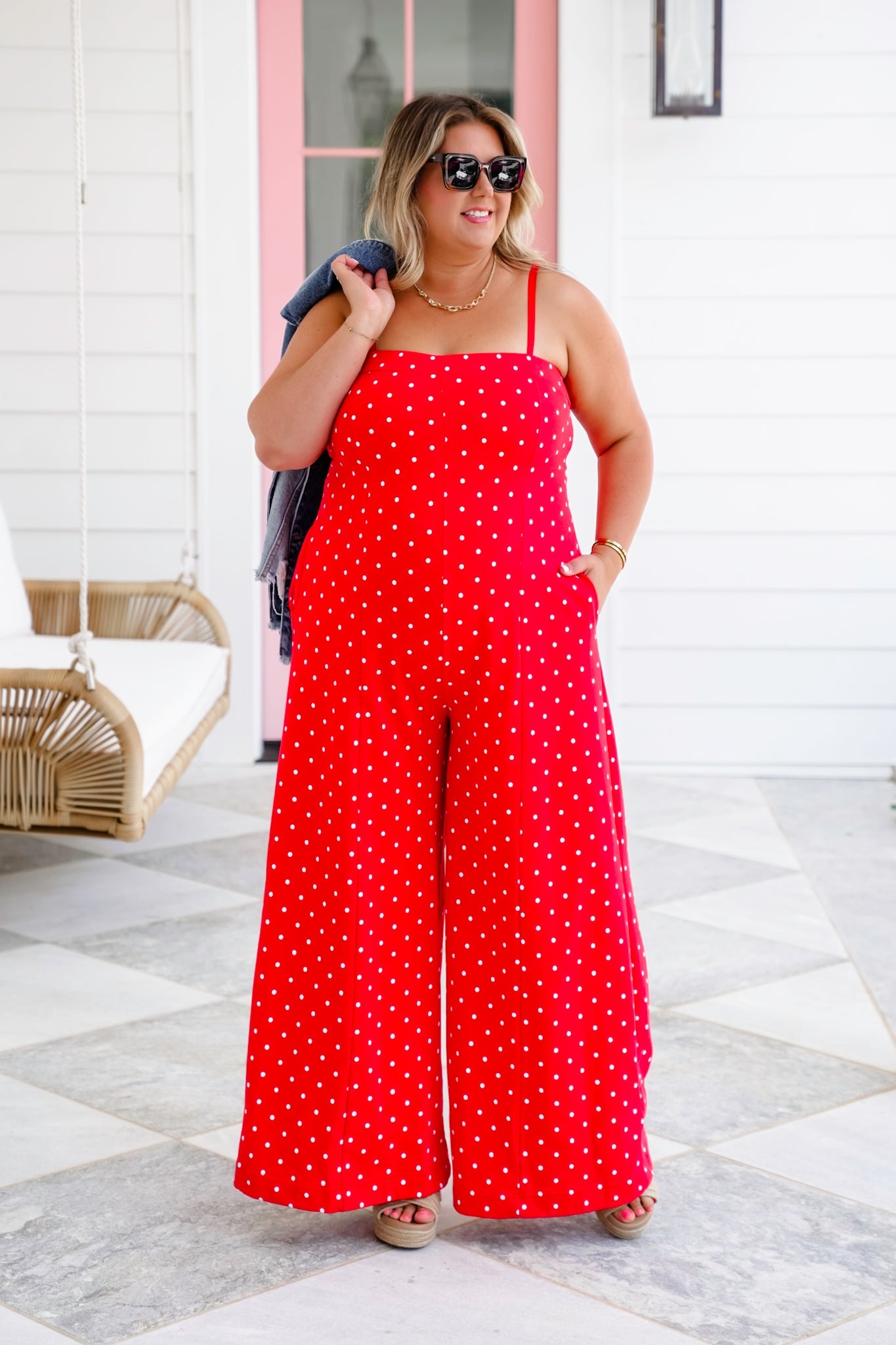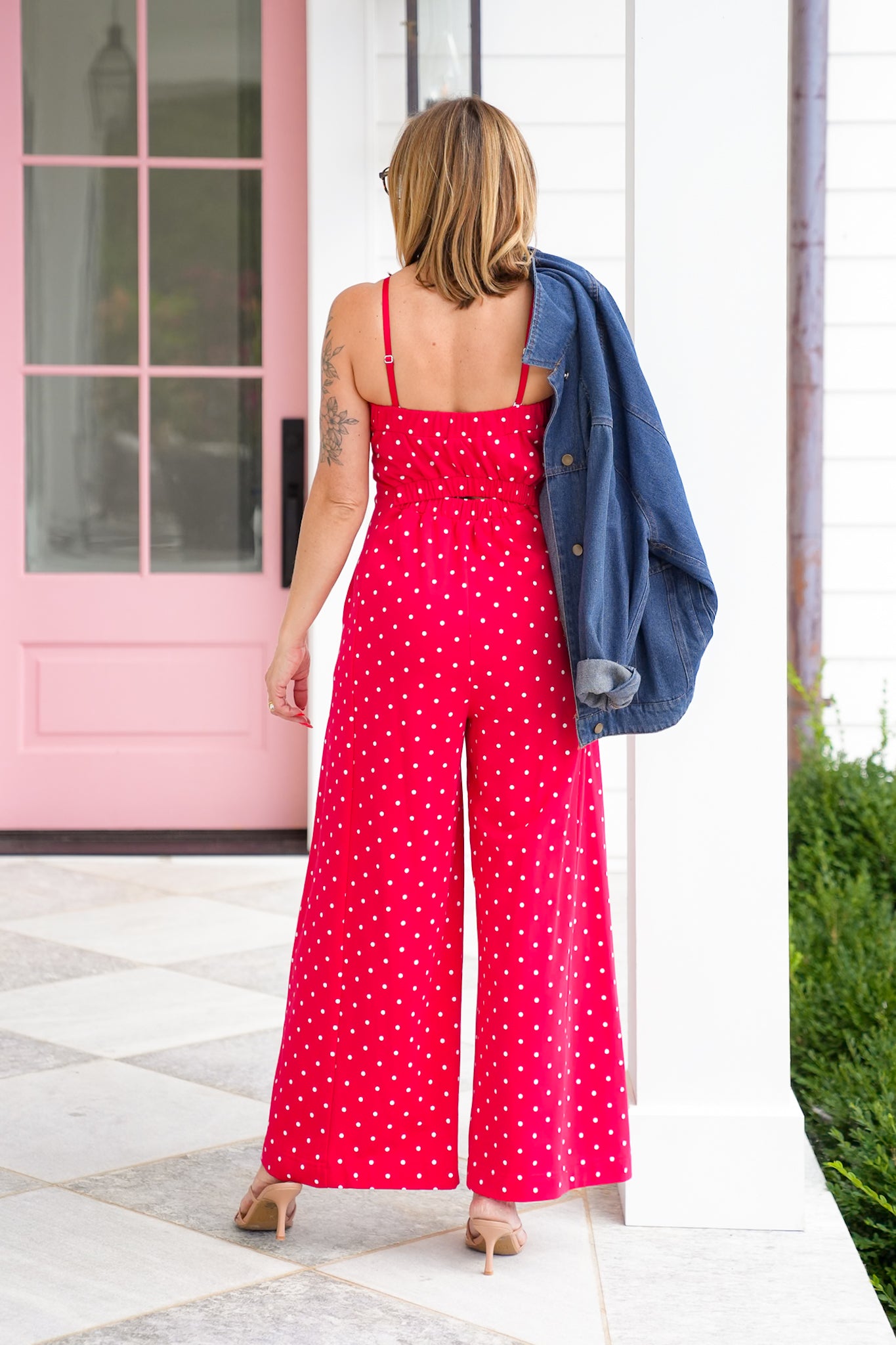 This bold red jumpsuit brings instant vintage charm with a playful twist. Covered in white polka dots and cut with a breezy wide leg, it’s got just the right mix of flirty and fun. The removable straps give you styling freedom—go strapless for a standout moment or add them for extra support. Style it with nude heels and a denim jacket or keep it casual with sandals and sunnies.