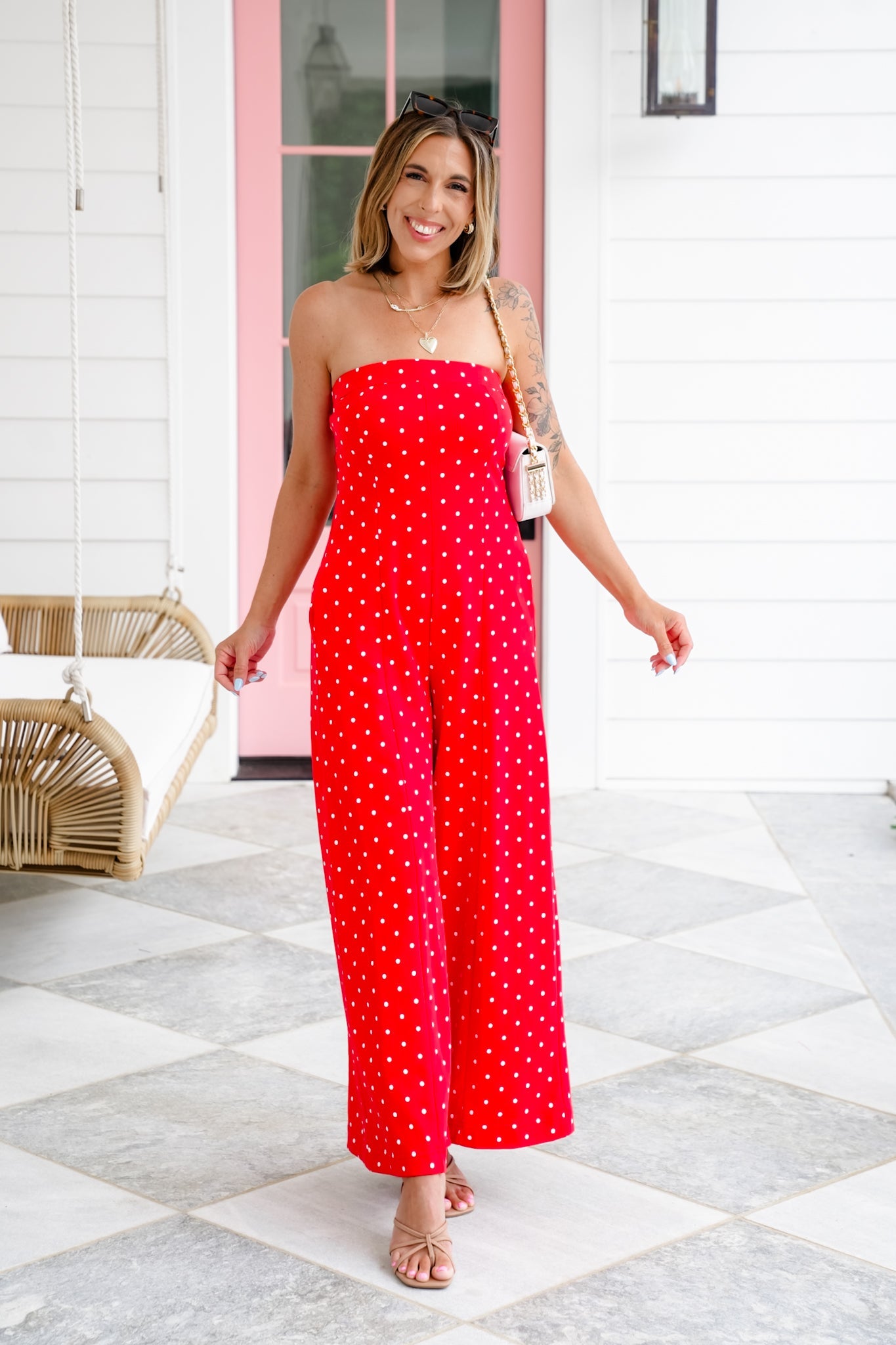 Restock! Plus/Reg Red Polka Dot Print Strapless Wide Leg Jumpsuit