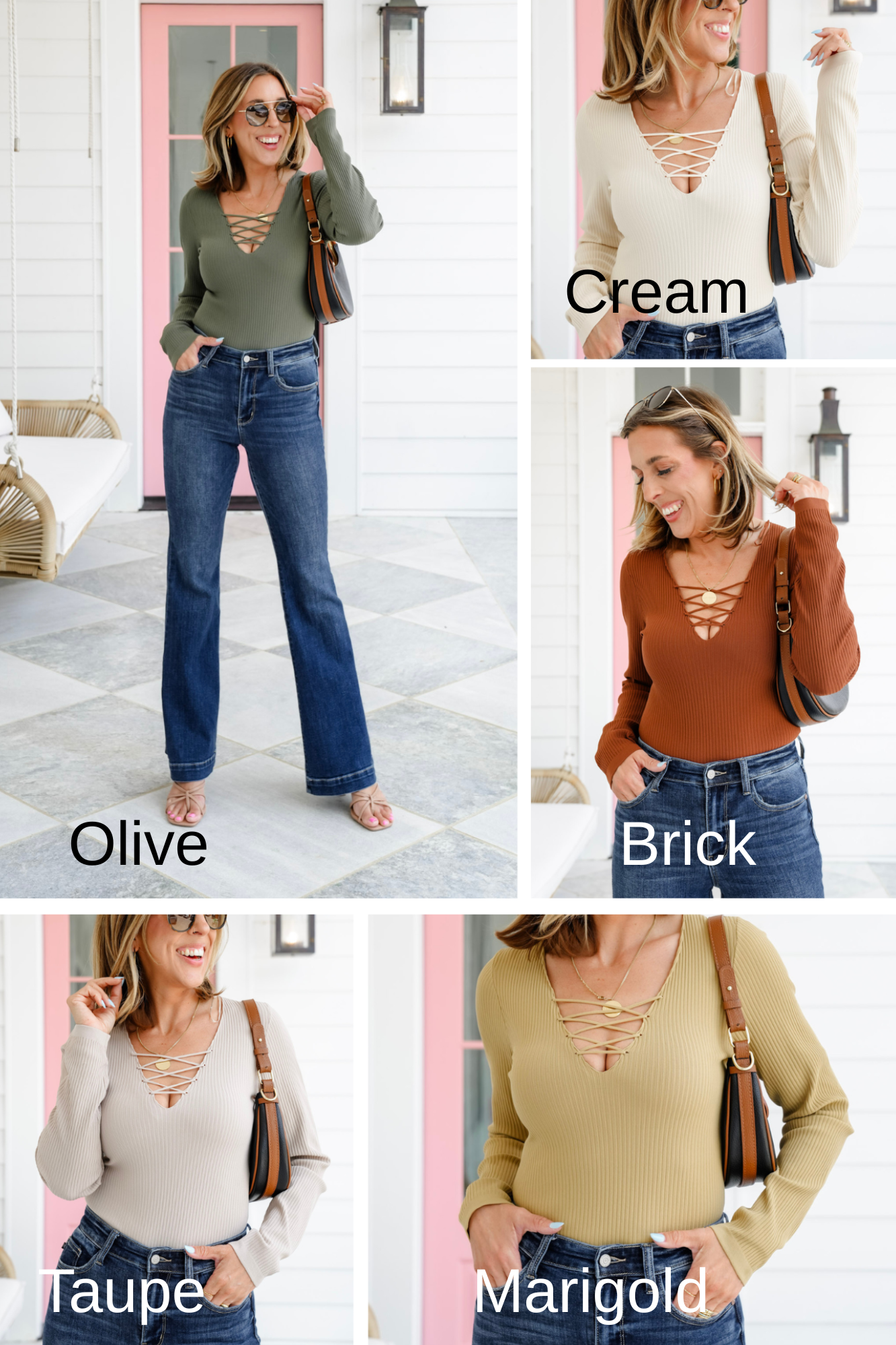 Talk about a head-turner! This ribbed sweater bodysuit has a flirty lace-up neckline and a flattering, body-hugging fit with tons of stretch. Style with high-rise denim or skirts and layer with your favorite jackets.
