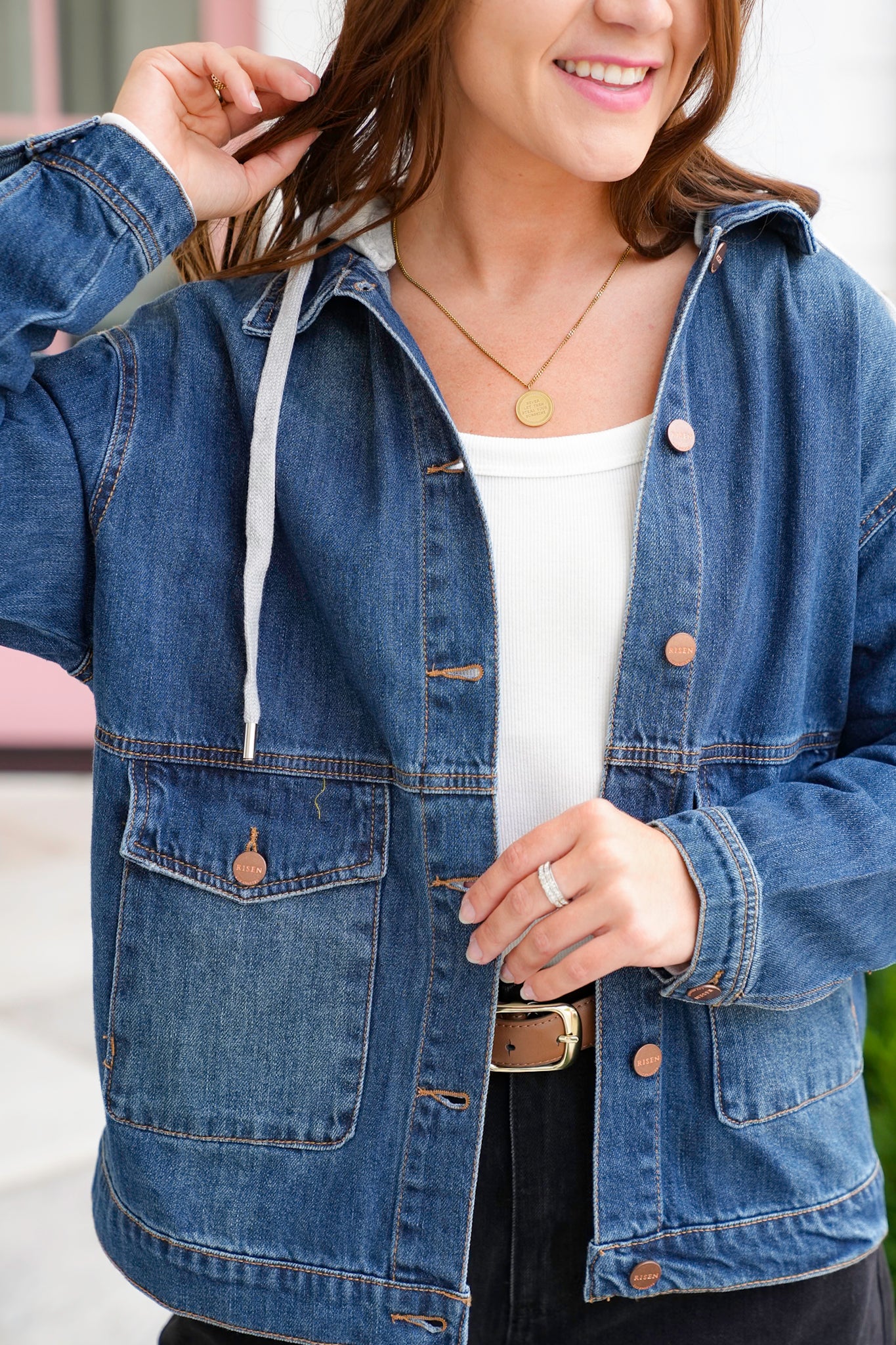 This Risen jacket nails that cool, effortless vibe with its mix of classic denim and cozy hoodie style. It’s the kind of piece that works with everything—from leggings to dresses—adding instant laid-back charm to any outfit.