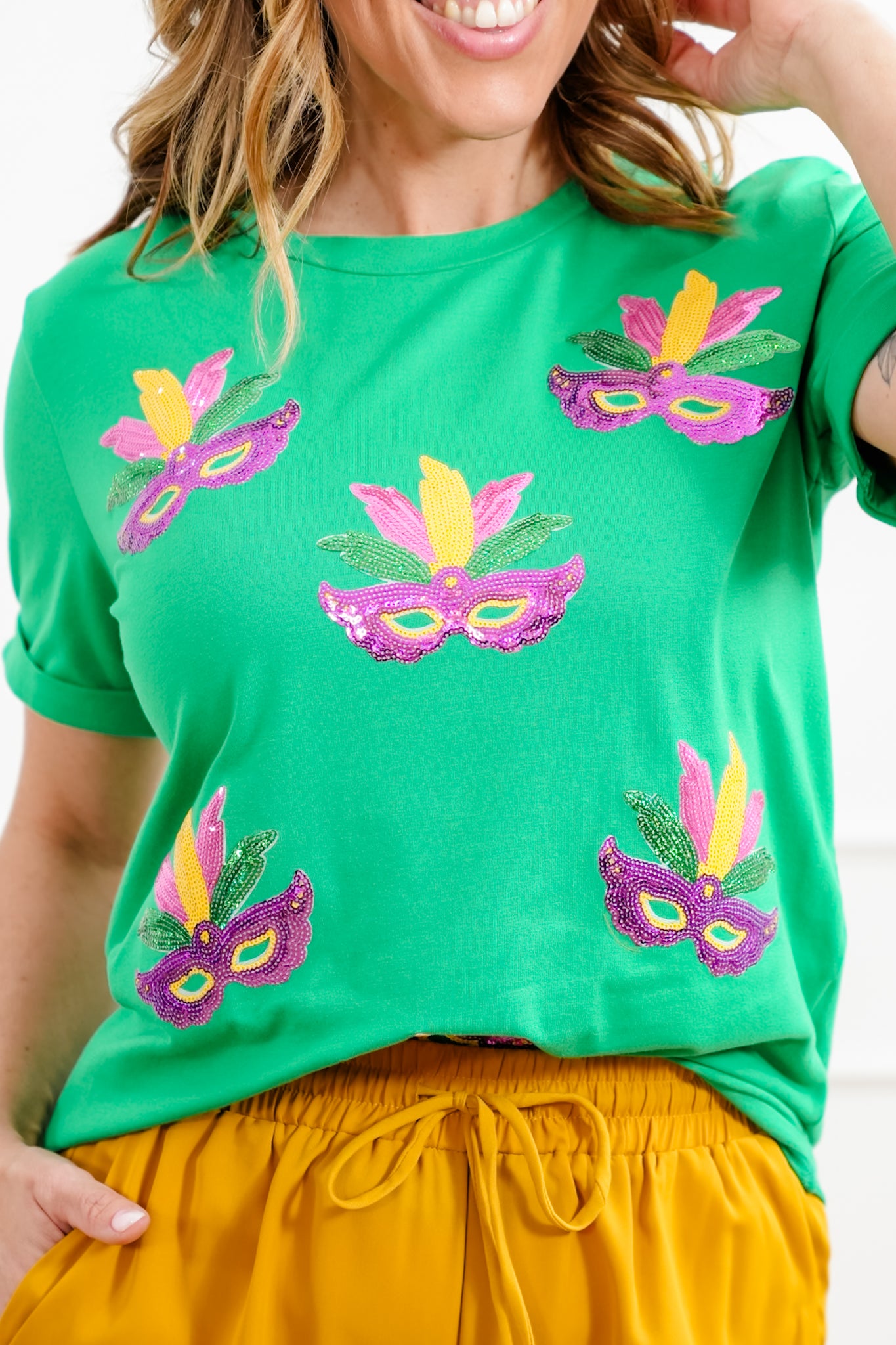 This festive tee brings all the Mardi Gras energy with colorful sequin mask details scattered across a bright green base that instantly stands out. The relaxed shape keeps it comfy while the sparkle does all the talking. Style it with denim, a bold skort, or layered accessories for a look that feels playful, confident, and ready for a good time.