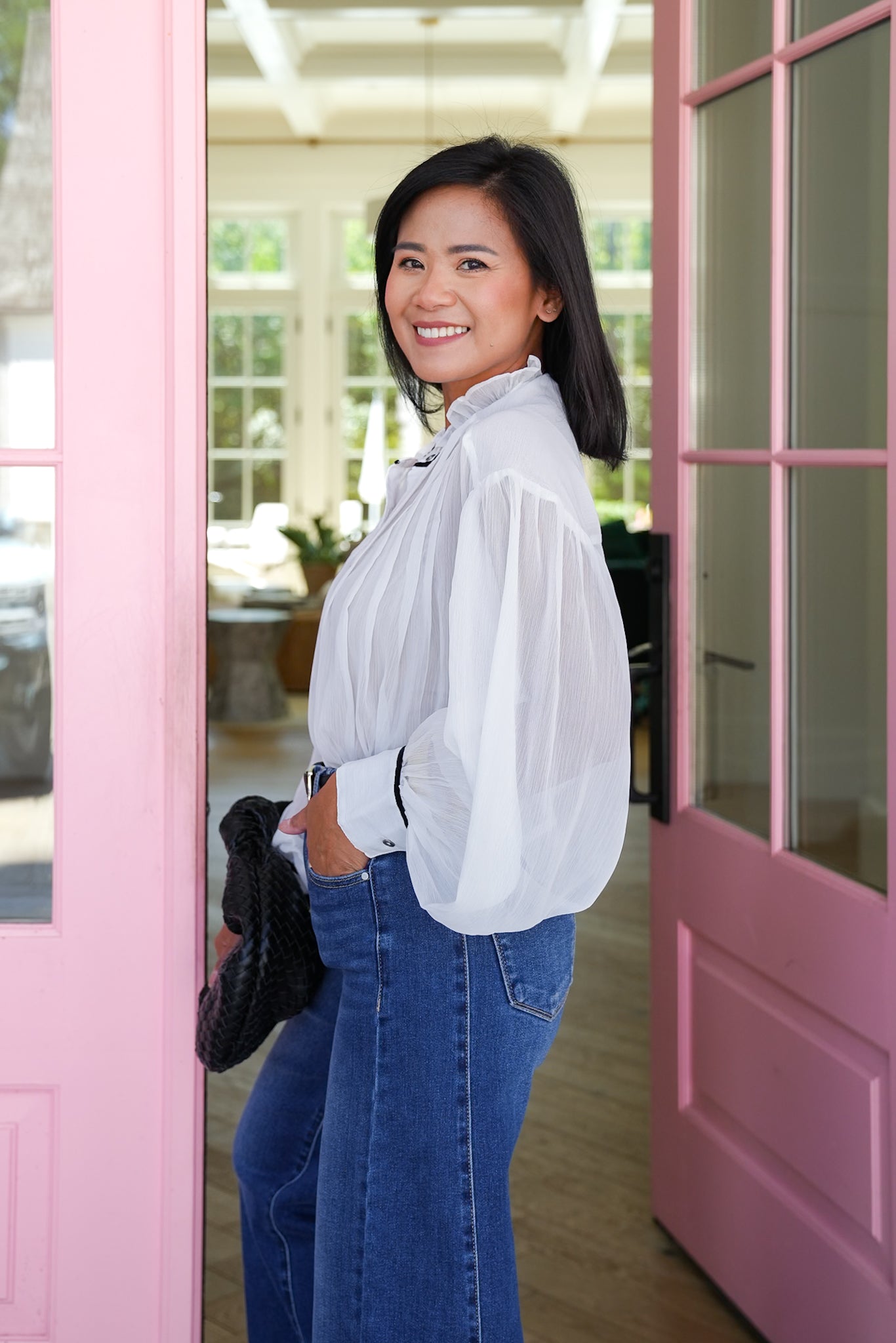 Bring a touch of sophistication to your wardrobe with this pleated sheer blouse. The lightweight fabric flows beautifully, while the vertical pleats create a flattering, elongated shape.