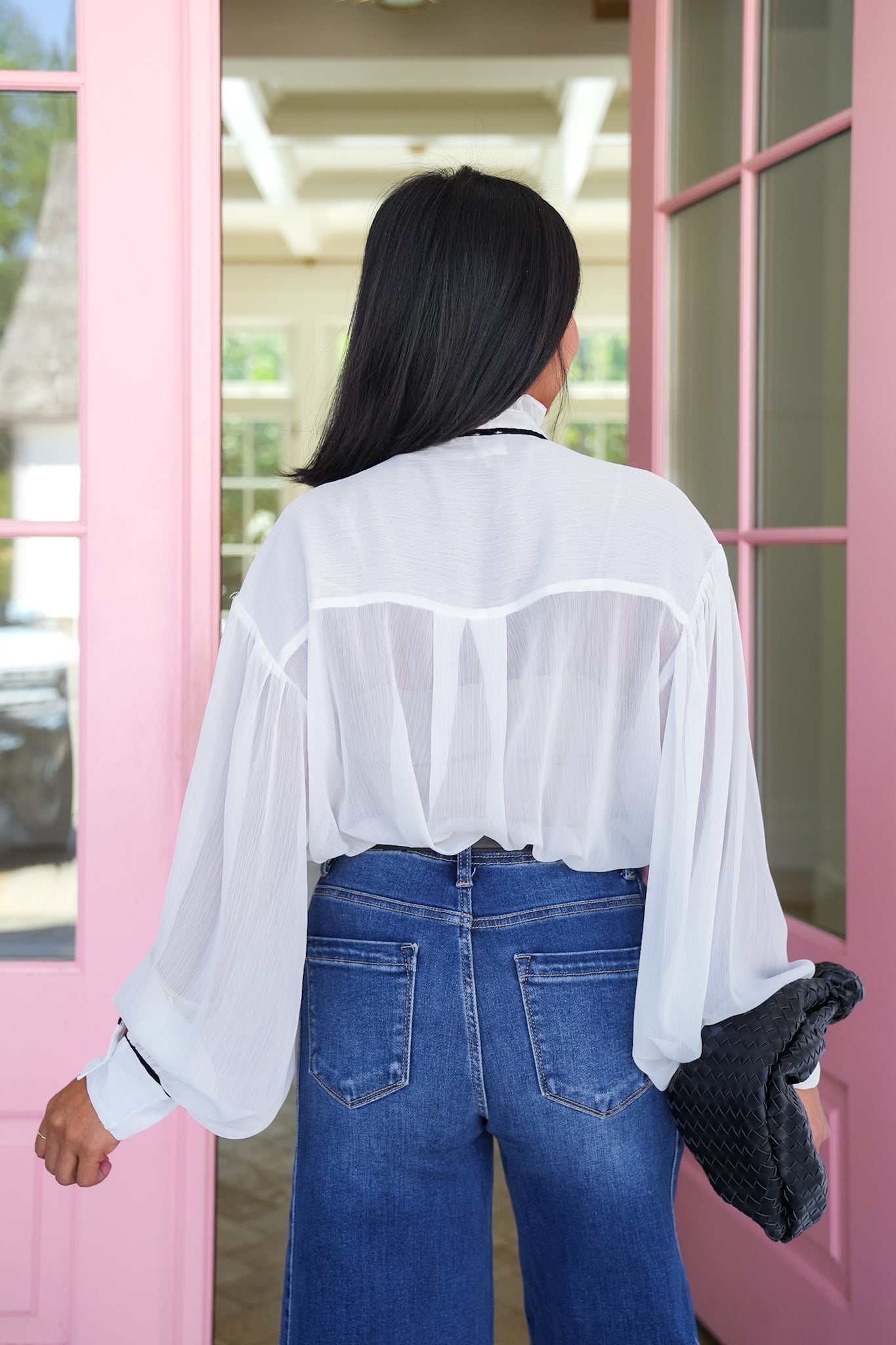 Plus/Reg Sheer Long Sleeve Button Down Pleated Top