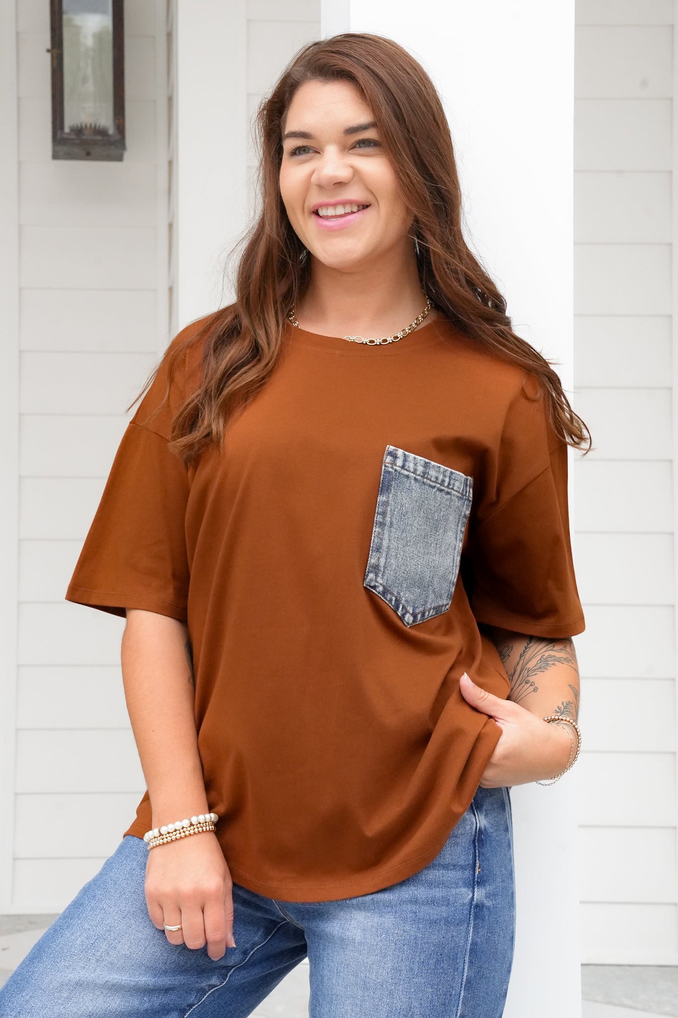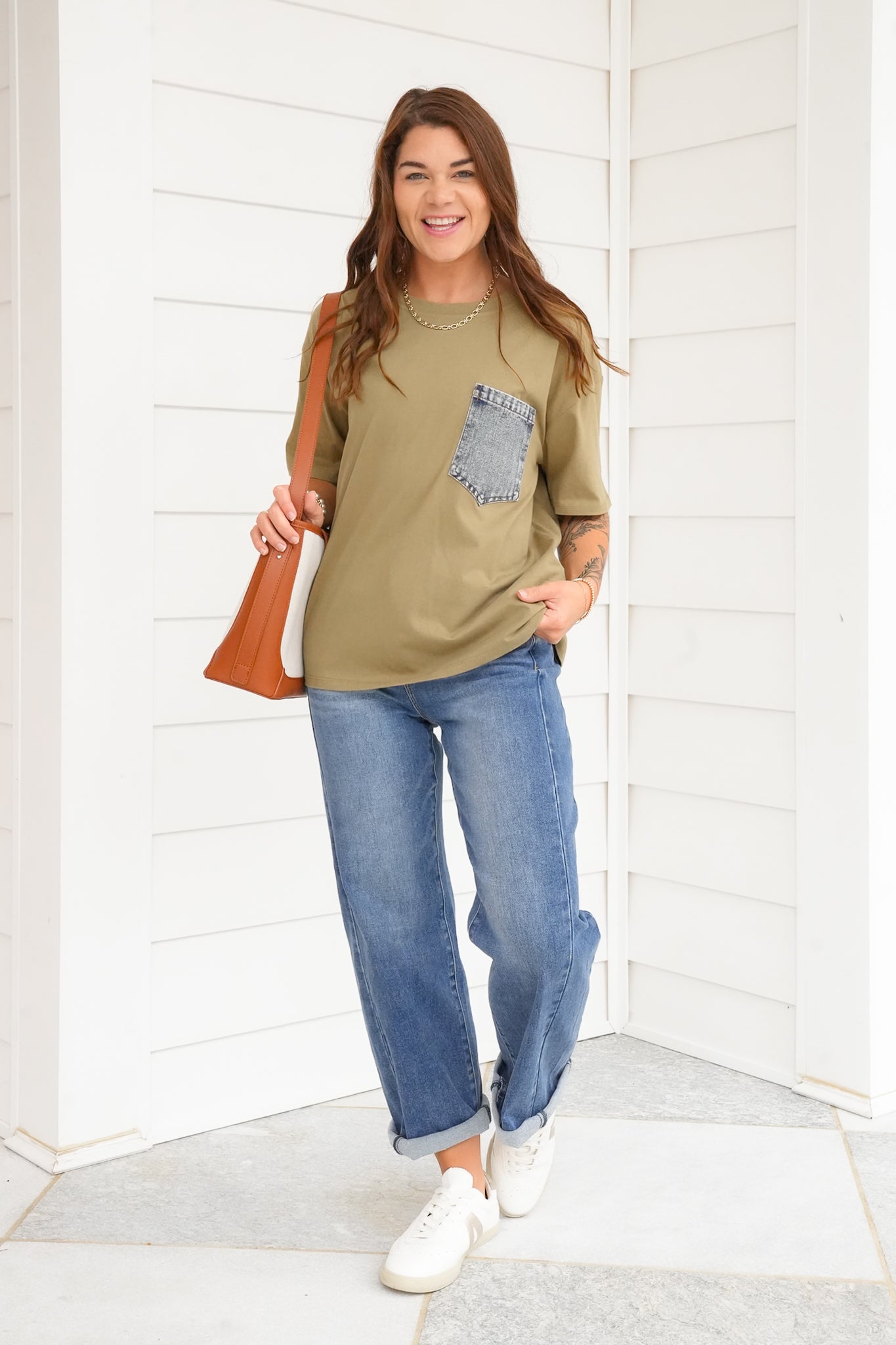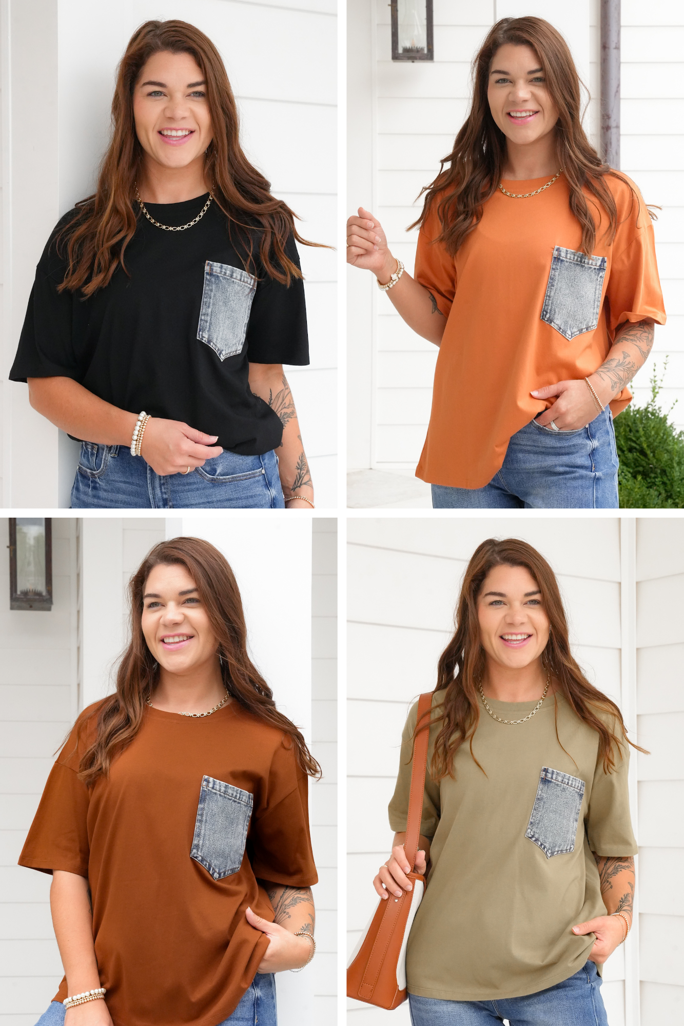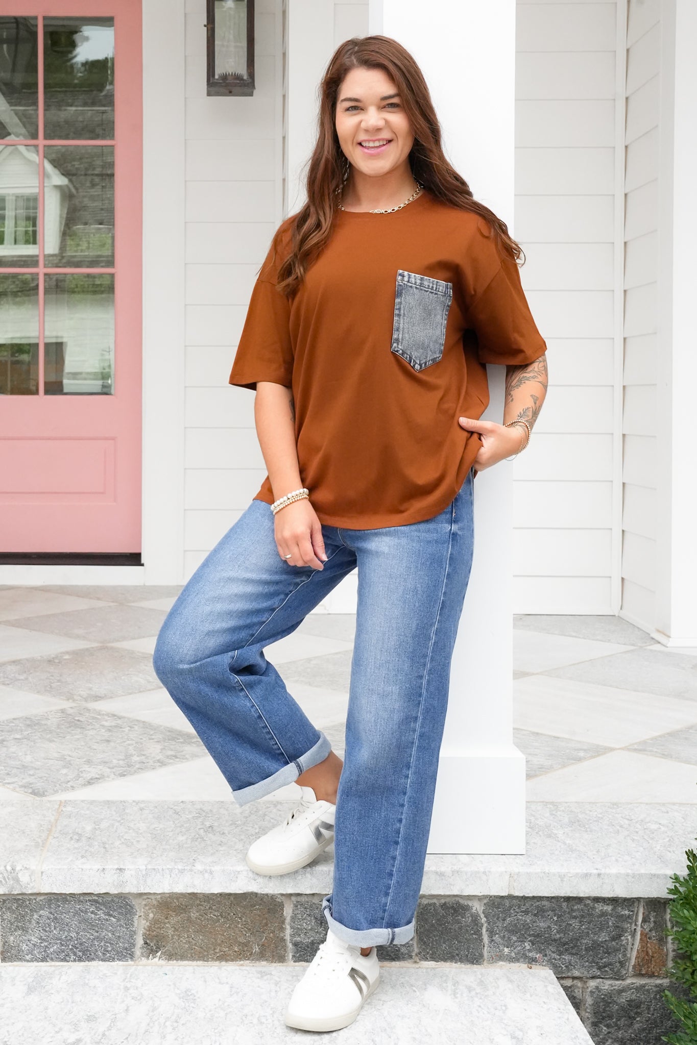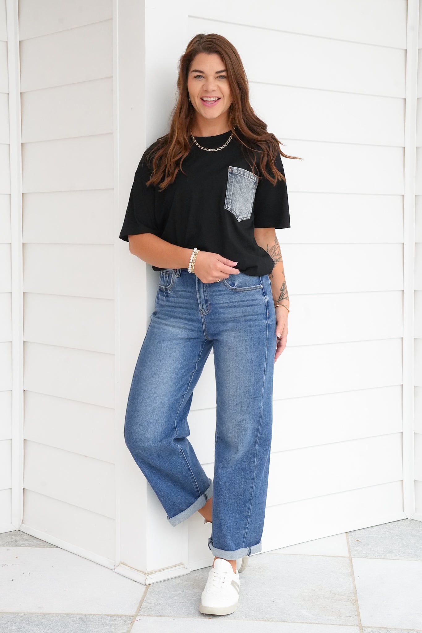 This tee takes “basic” and makes it bold. The oversized cut and contrast pocket instantly elevate your casual look, while still being soft and easy to throw on. Style it with biker shorts, wide leg denim, or layered under a shacket for endless options.