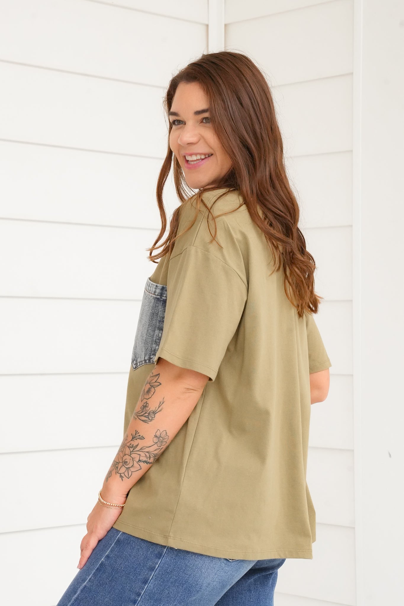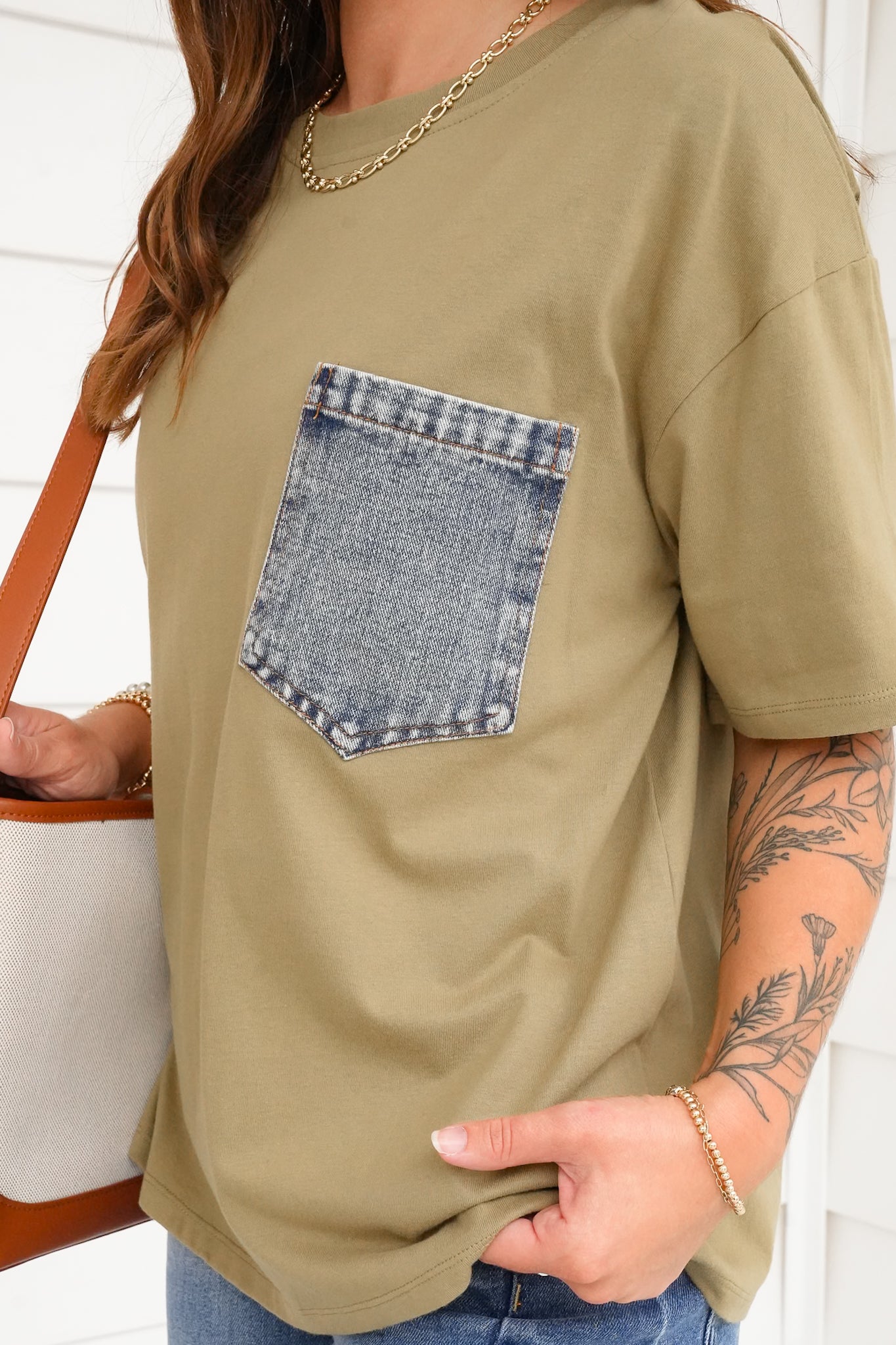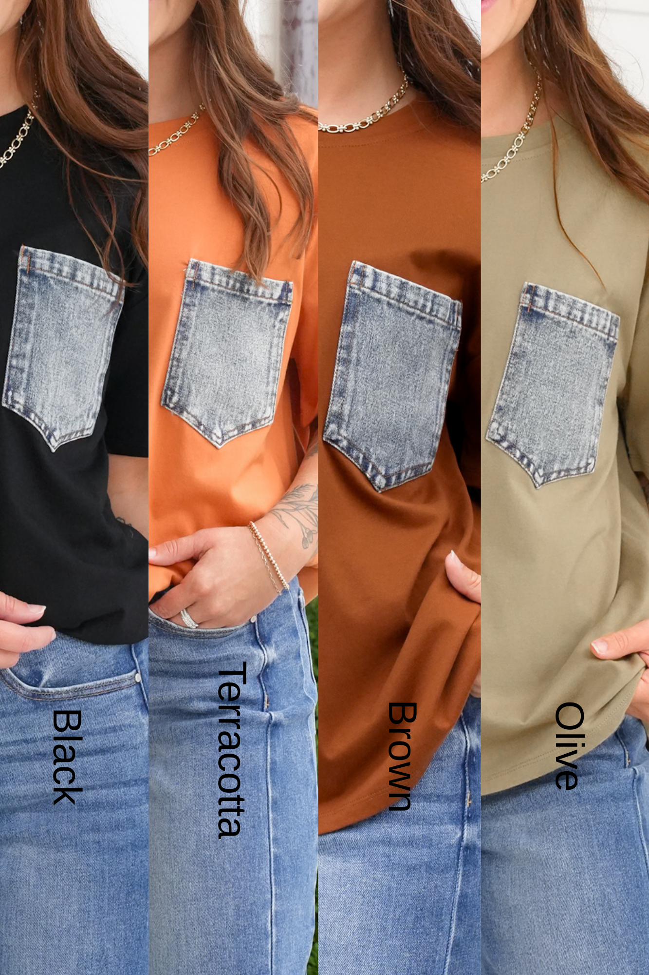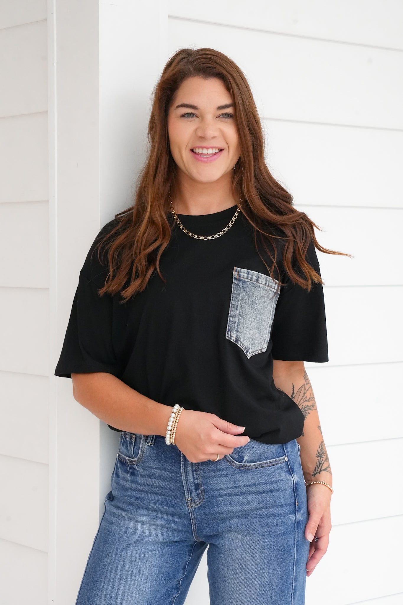 Plus/Reg Short Sleeve Crew Neck Top with Denim Pocket