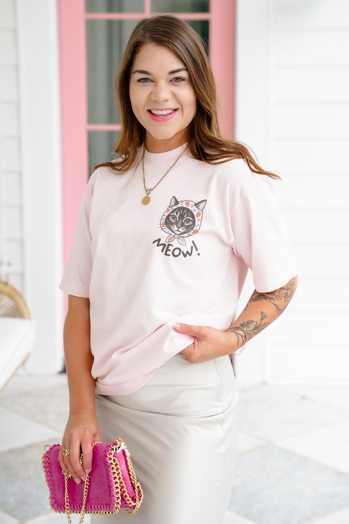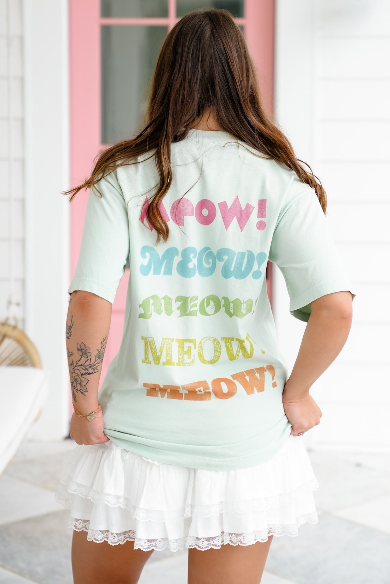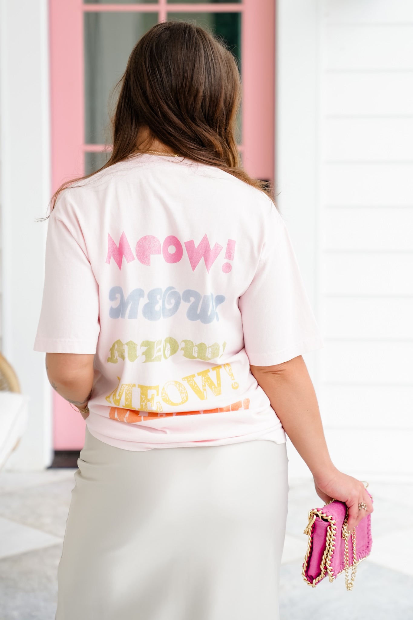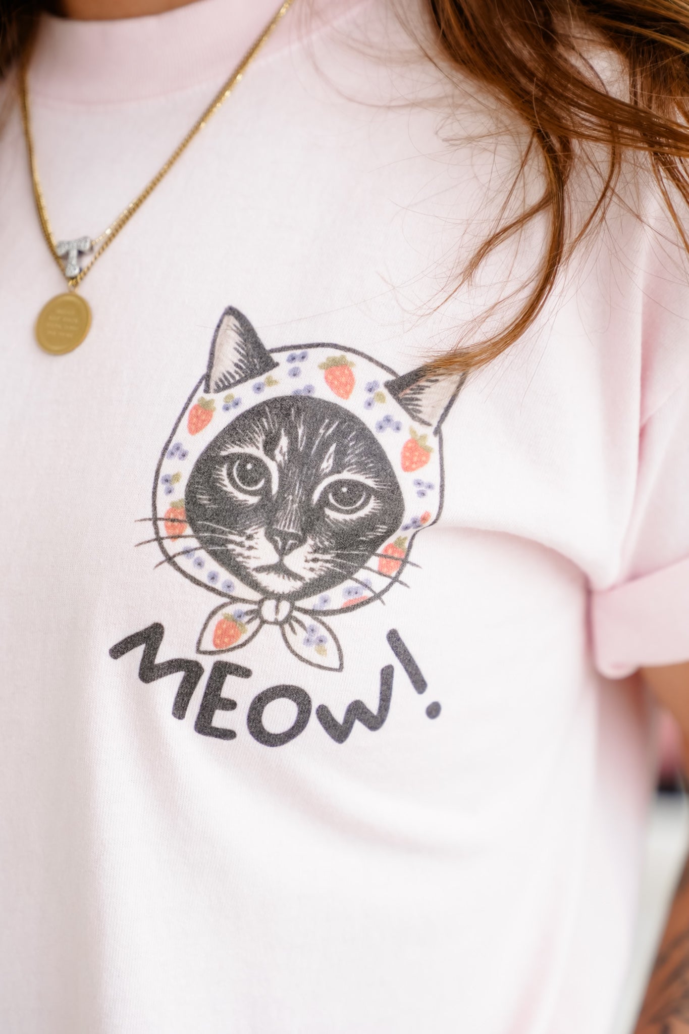This fruit cat “Meow” graphic top is pure playful perfection! The front shows off an adorable kitty in a floral headscarf with a cheeky “Meow!” while the back bursts with a rainbow of colorful meows stacked from top to bottom. Available in two soft pastel colors, it’s the kind of tee that instantly brightens your mood and your outfit.