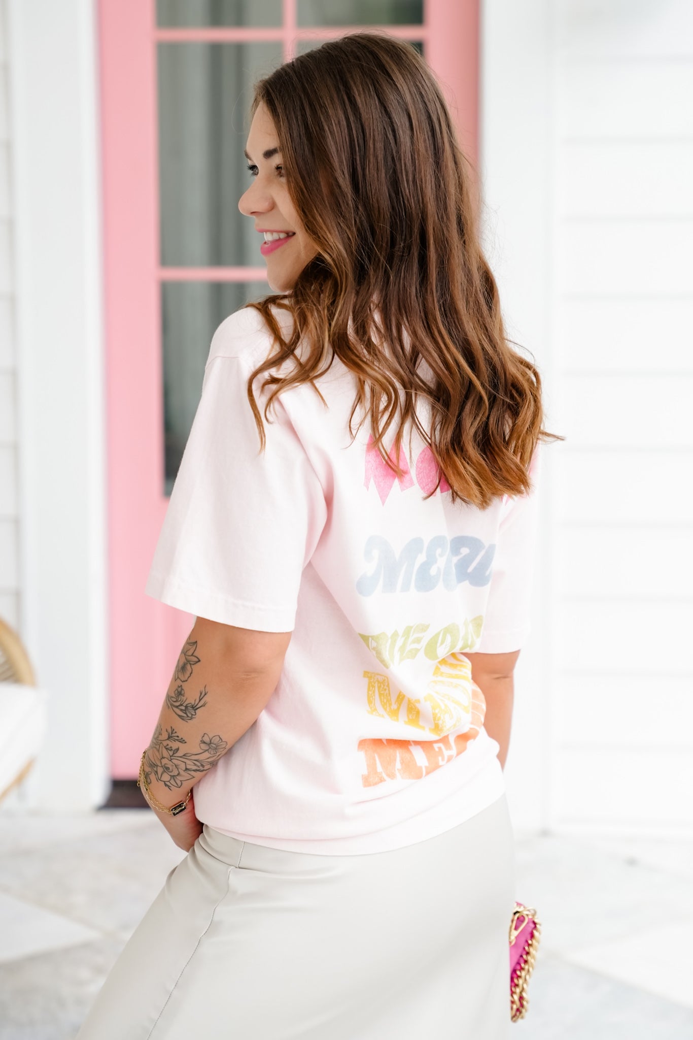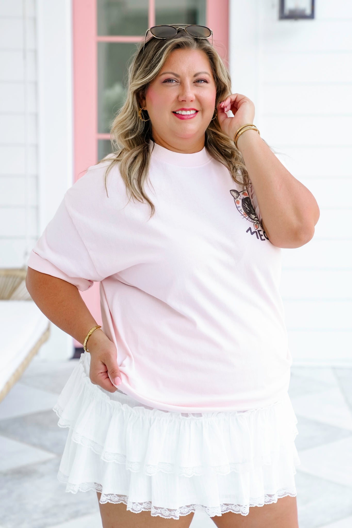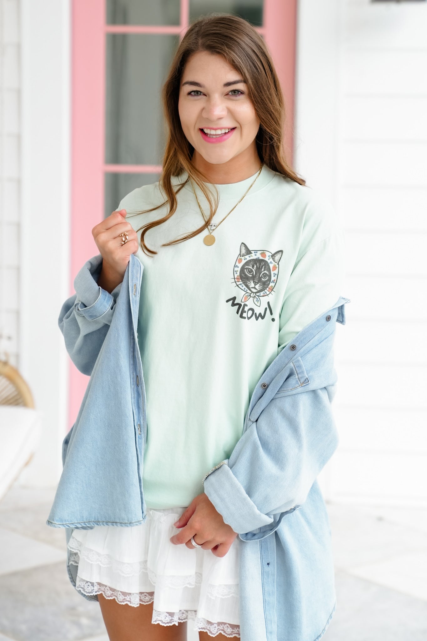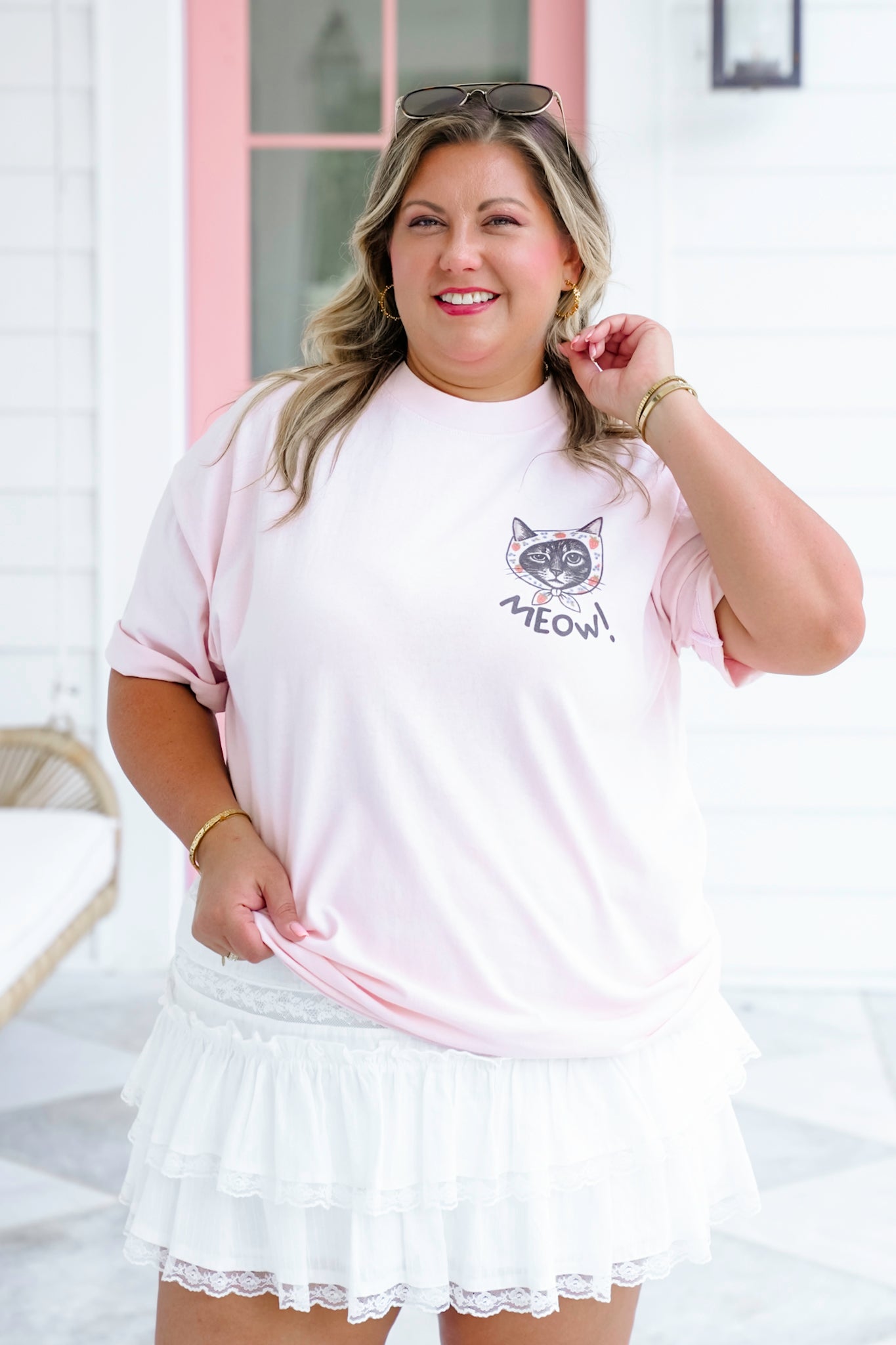 This fruit cat “Meow” graphic top is pure playful perfection! The front shows off an adorable kitty in a floral headscarf with a cheeky “Meow!” while the back bursts with a rainbow of colorful meows stacked from top to bottom. Available in two soft pastel colors, it’s the kind of tee that instantly brightens your mood and your outfit.