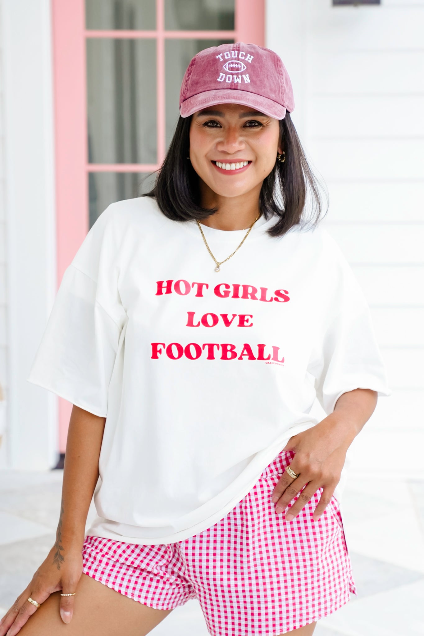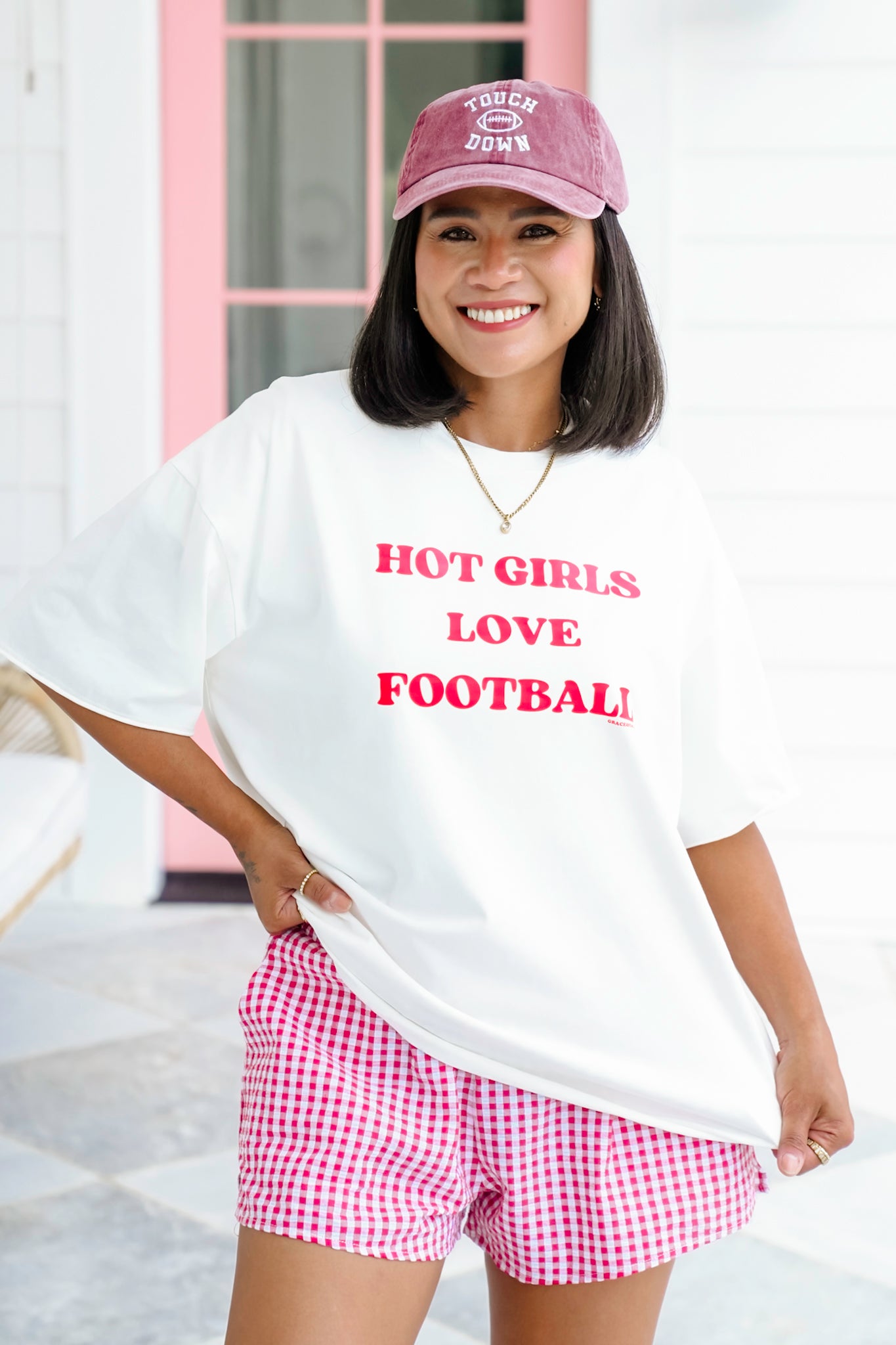 This tee is bringing the heat to the stands and the sofa! The “Hot Girls Love Football” graphic is bold, sassy, and packed with personality, just like you. Designed with an oversized fit and ultra-soft fabric, it's perfect for game day lounging or touchdown celebrations. Throw it on with biker shorts, distressed denim, or a flirty skirt and cap for a sporty-cute vibe you’ll be obsessed with.