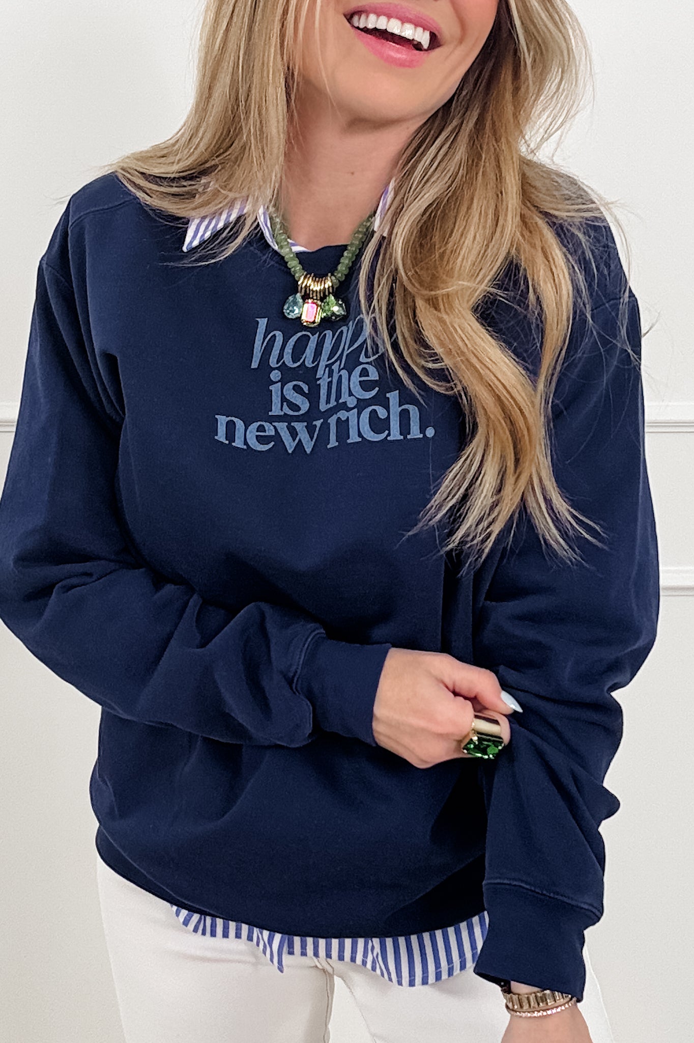 Turns out the best kind of rich has nothing to do with money! The "Happy Is the New Rich" graphic keeps the message simple and uplifting, making this pullover just feel good to wear. The classic navy color gives it an easy, everyday vibe while the soft sweatshirt fabric keeps you cozy and comfortable. Pair it effortlessly with denim, shorts, or joggers for a laid-back look you'll reach for again and again!
