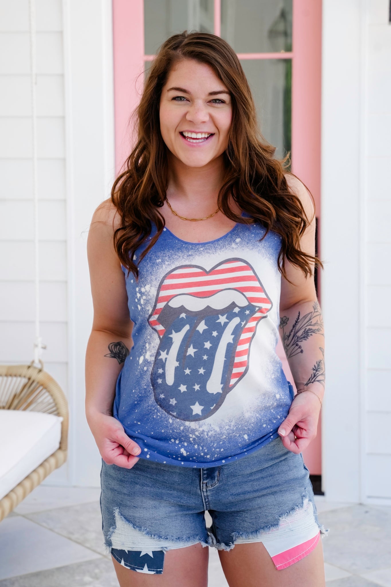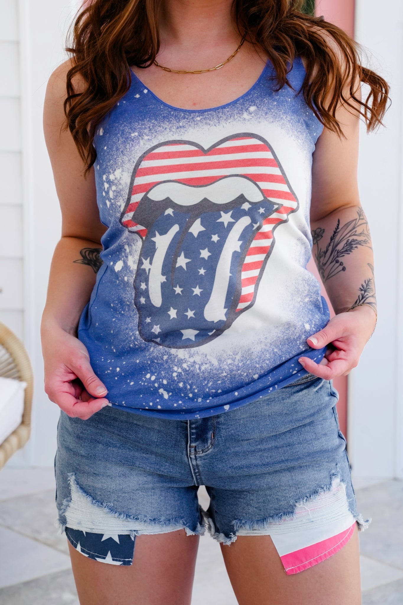 Add a little rock-and-roll to your red, white, and blue with this bold graphic tank! The distressed star-spangled lips graphic gives major cool-girl energy, and the racerback cut keeps it breezy for hot summer days. Style it with patchy denim shorts or joggers and high tops for an edgy BBQ look.