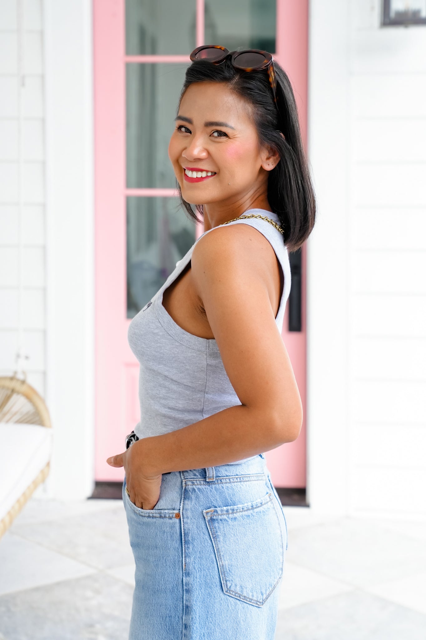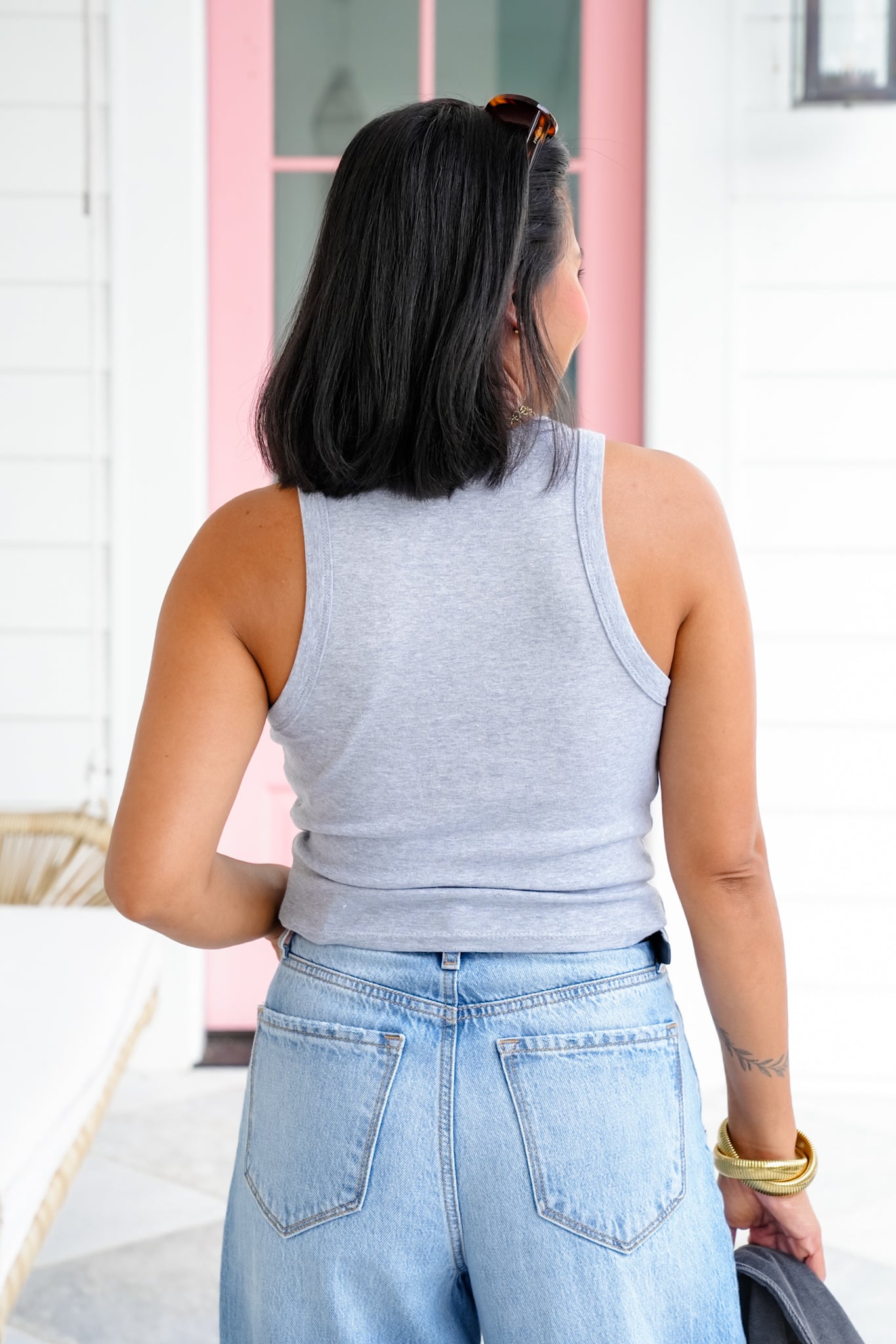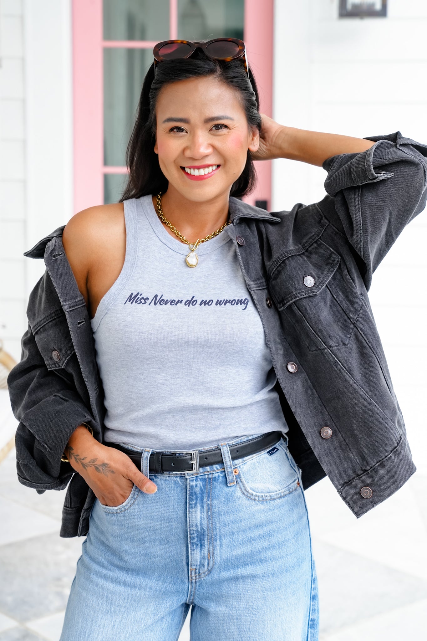 She’s bold, she’s confident, and she’s not taking any blame! This tank is all attitude, in the best way possible. The soft gray ribbed fabric makes it a dream to wear, either on its own or layered under a denim jacket. Pair it with cutoffs for weekend errands or dress it up with a blazer and wide legs for a playful, edgy vibe.