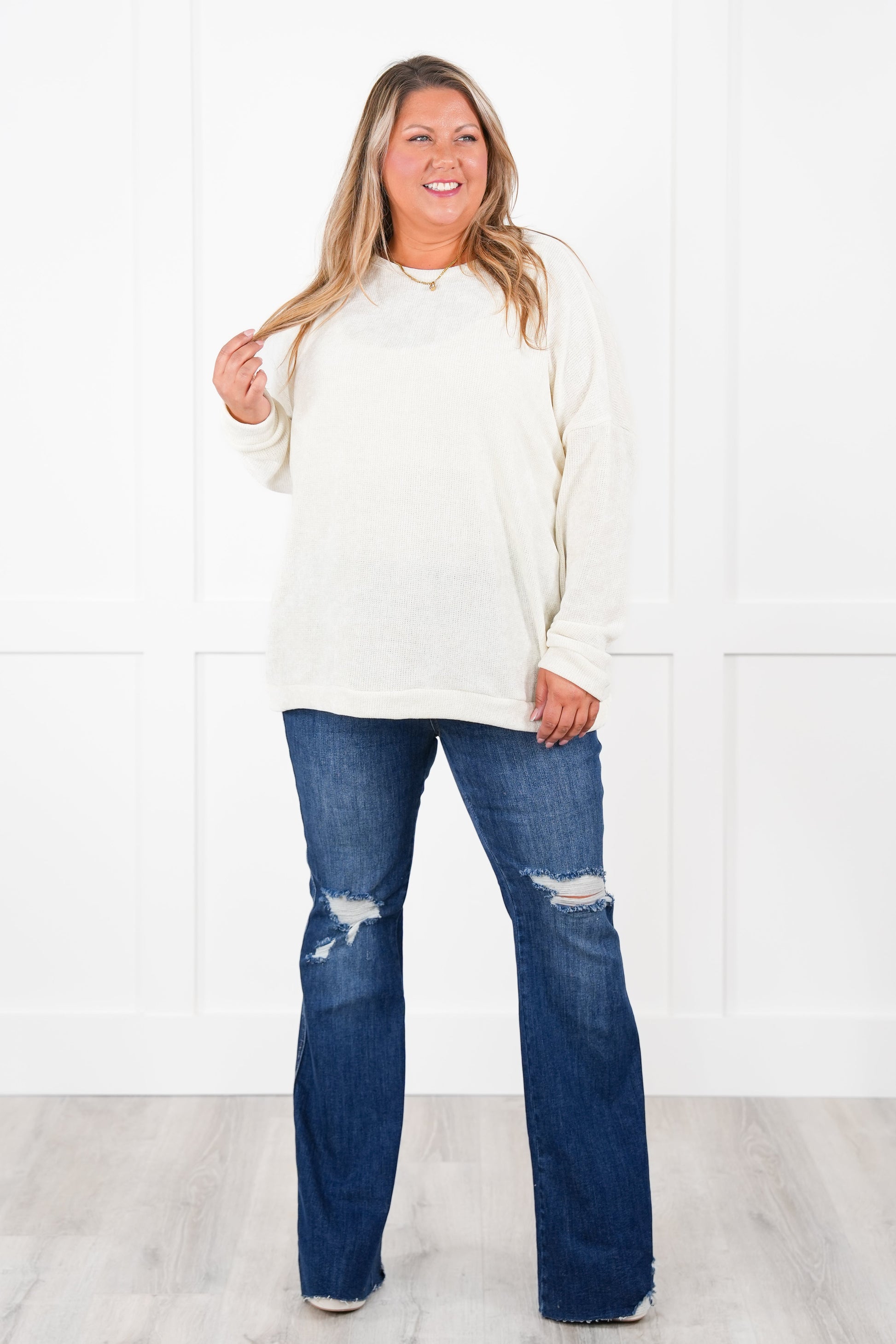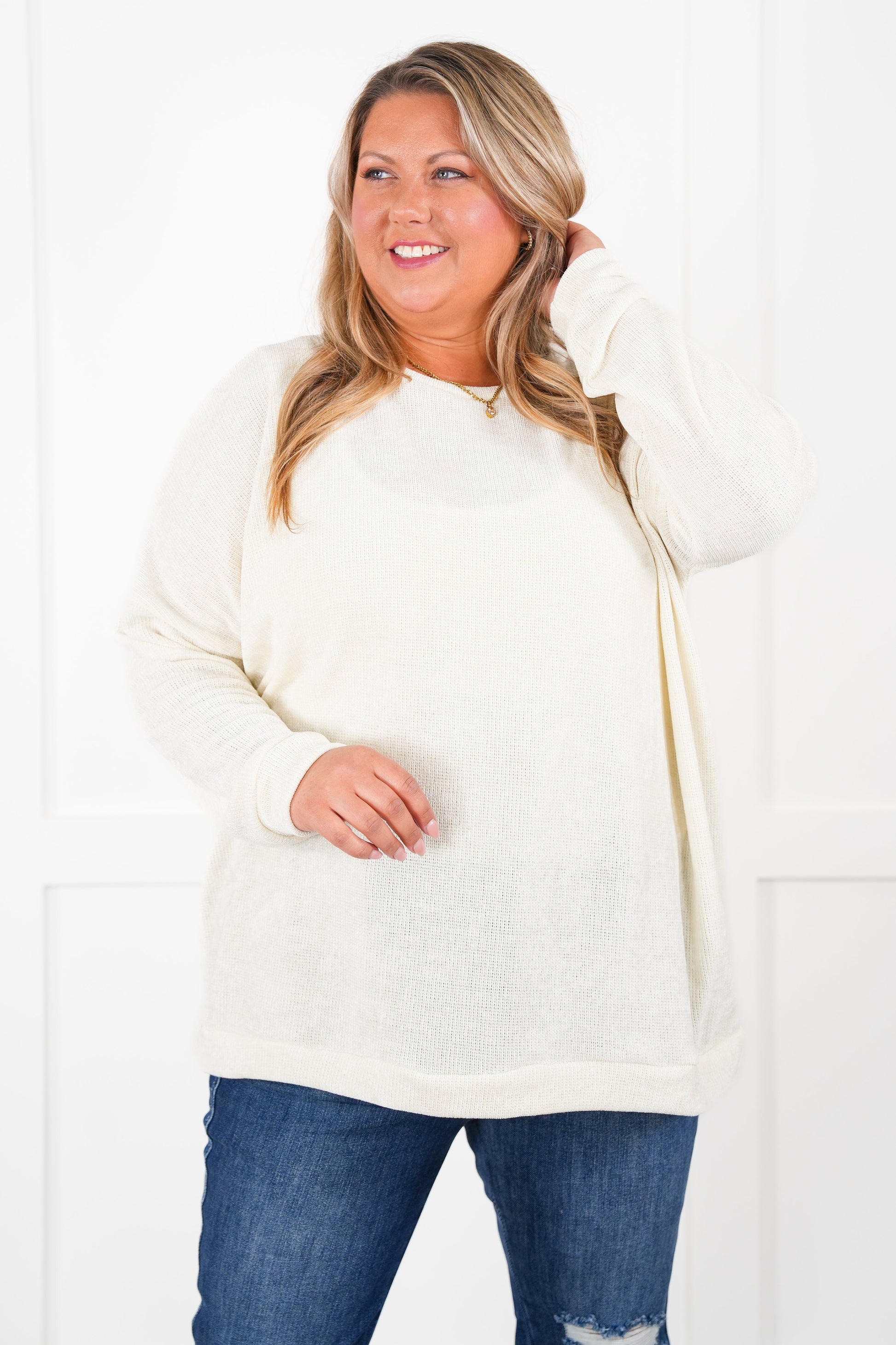 Fit: This sweater is like wearing a warm hug! It is so soft and cozy, and it has our name on it, so you know that we love it! This has a classic crew neck and long sleeves, and it is a tunic length. We cannot stress how comfortable this is! It has a relaxed, true-to-size fit. If you are between sizes, you can size down.