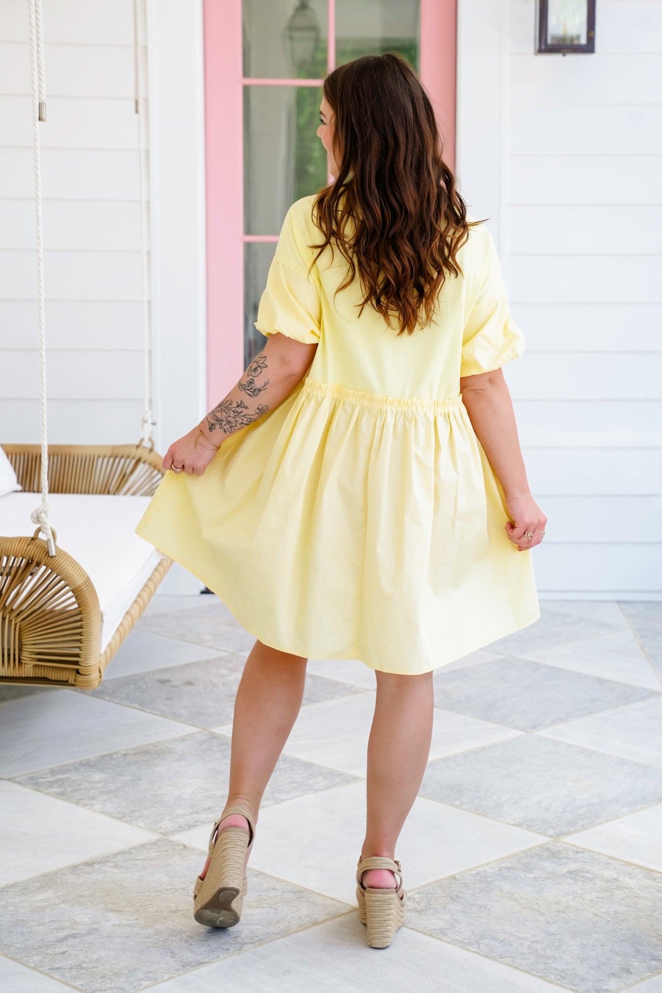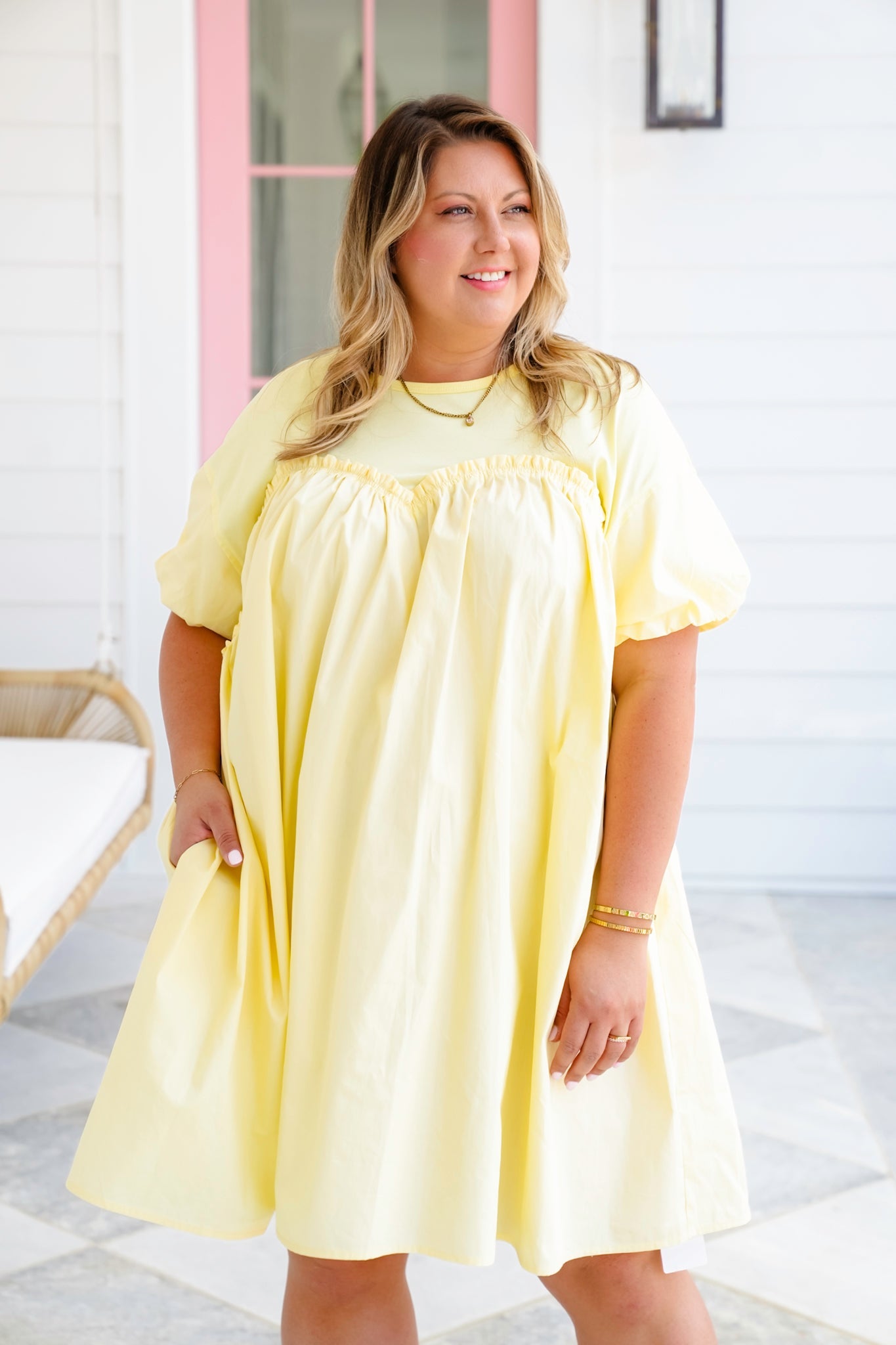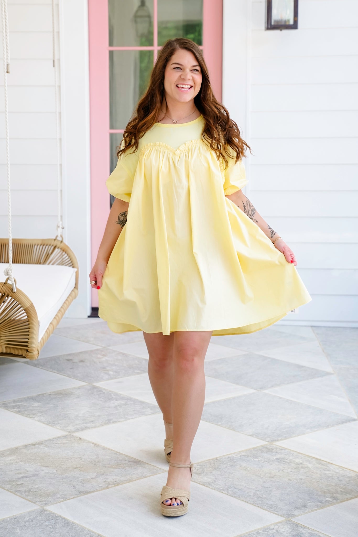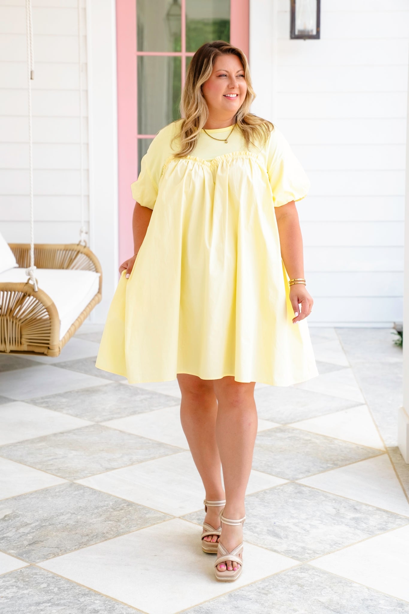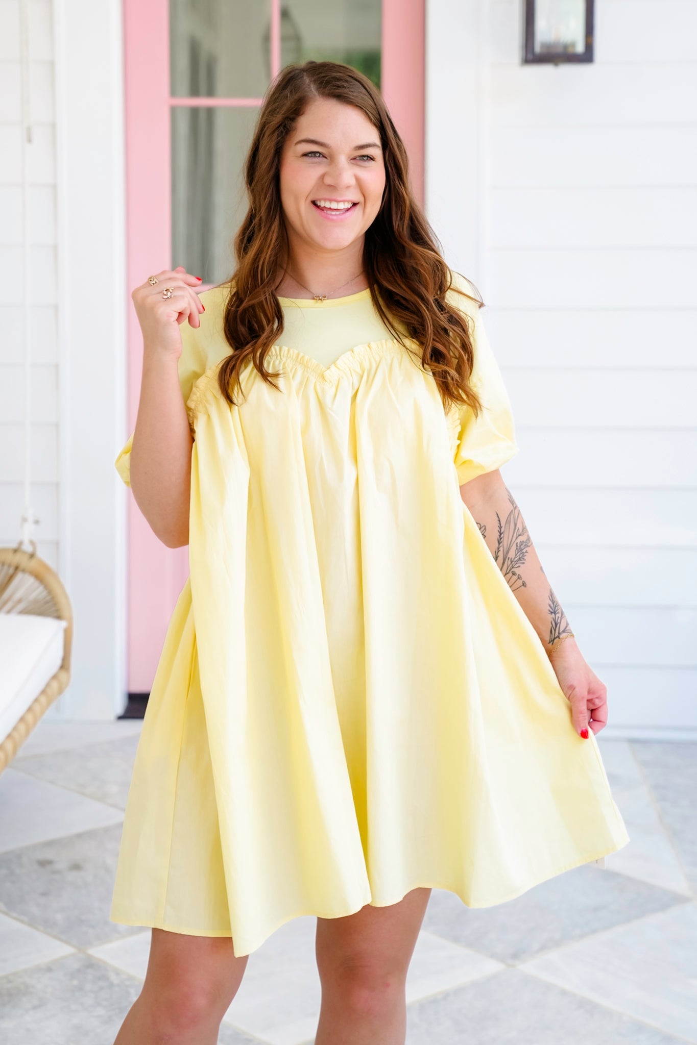Sunshine in dress form, this cheerful babydoll mini is sweet, flowy, and full of charm! The cotton fabric gives it a soft, breezy feel, while the ruffle detail across the bust and the elastic-cuffed sleeves add playful, feminine touches. Hidden side pockets!? Yes, please!