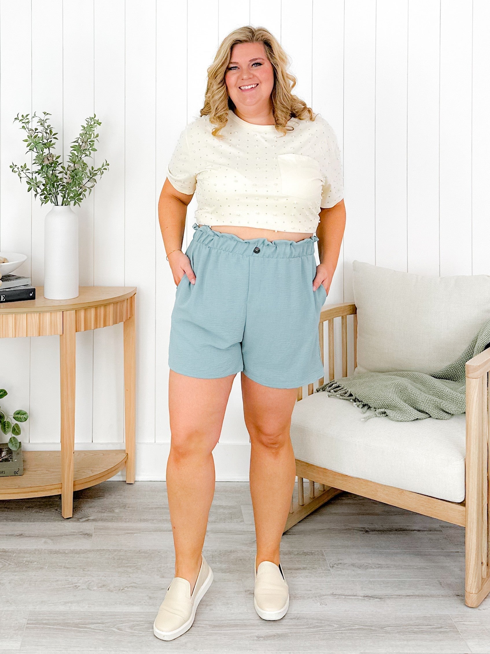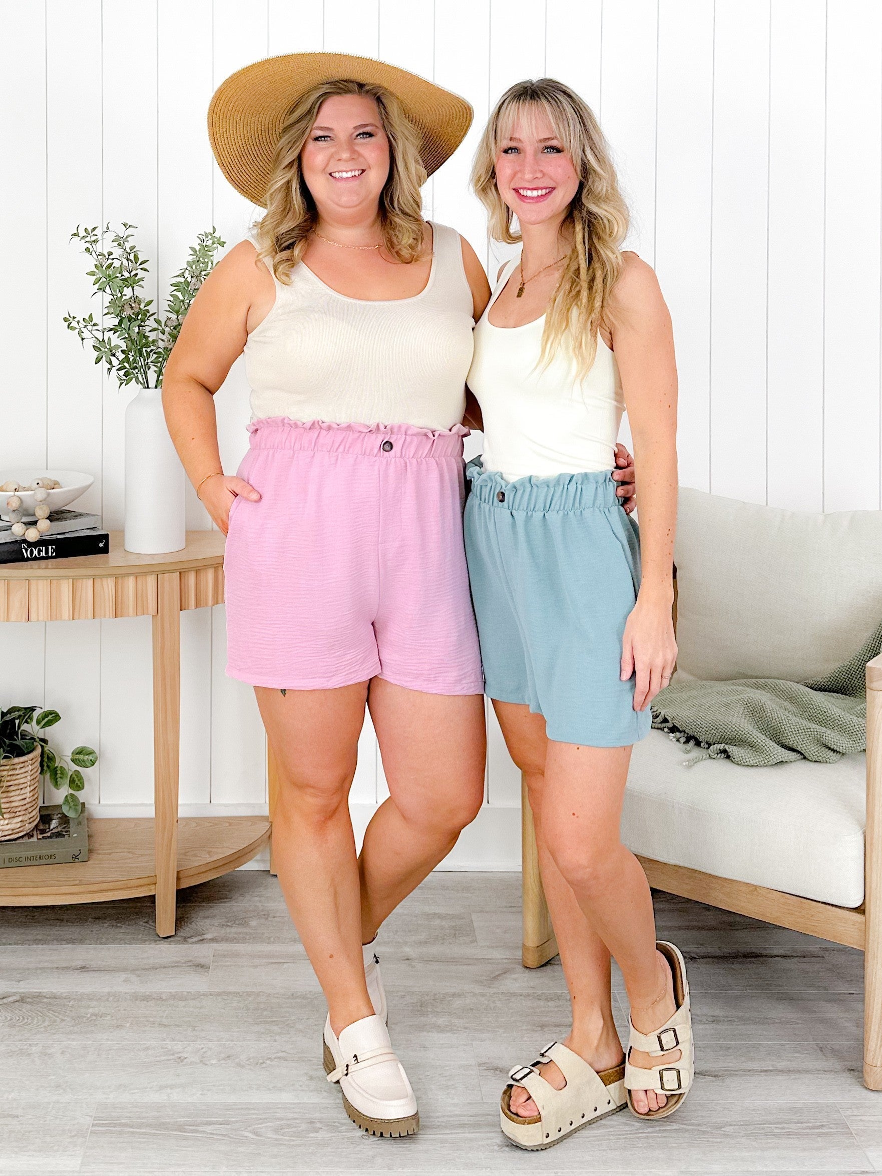 Comfy and cute at the same time? Yes, please! These shorts are the ultimate blend of comfort and style, perfect for all your summer adventures. They have an elastic paper bag waistband with a cute decorative button, while the pockets add convenience and functionality. Whether you're lounging at home or out and about, these shorts will quickly become your go-to. Put on a simple tee or tank for a laid-back look, or dress them up with a blouse for a more polished vibe.