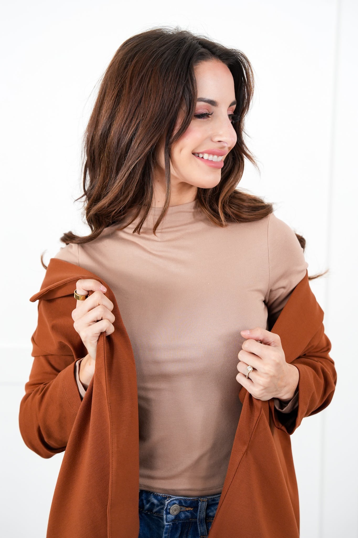 Fit: This is an elevated basic piece you will wear for years! We love the mock neck and chic profile, and it is double-lined for added coverage. It has a fitted, true-to-size fit with a longer cropped length. If you are between sizes, you will want to size up.