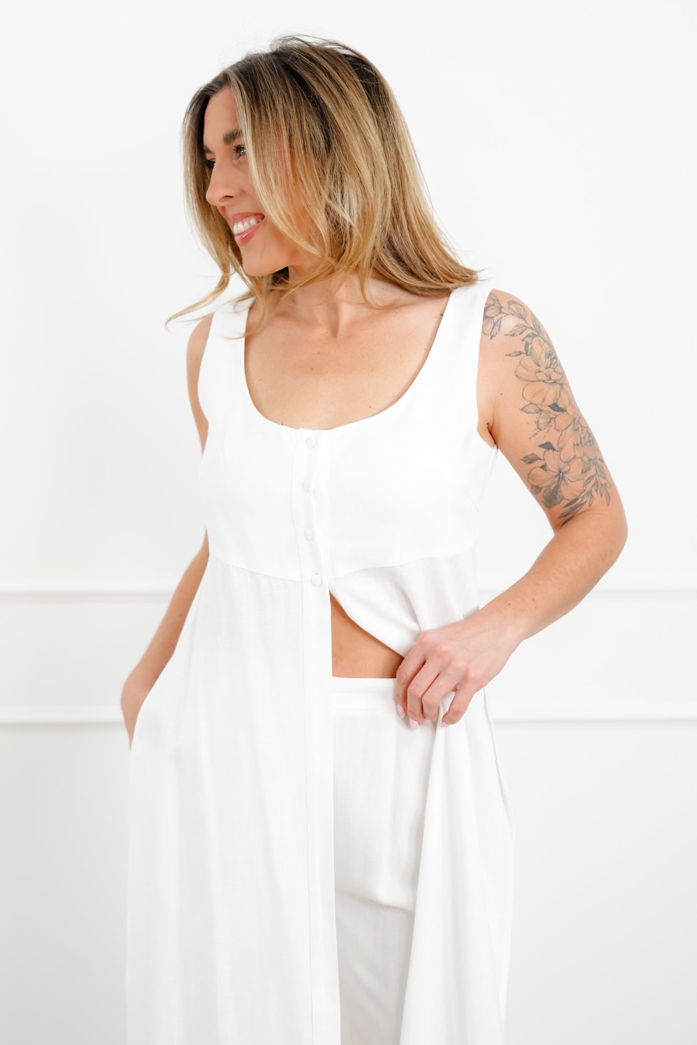 Airy, polished, and ready for sunshine, this sleeveless cover up dress brings instant elevation to any look. The lightweight fabric flows beautifully with every step, while the full front buttons add a timeless, tailored touch. Side slits keep it modern and easy to move in, making it the chic layer you’ll reach for over swim, tanks, or matching sets all season long.