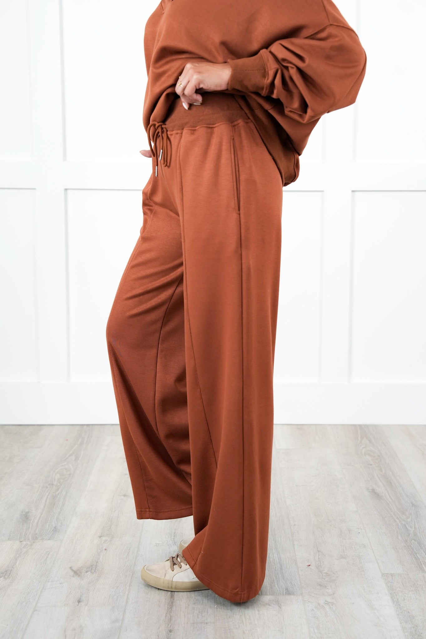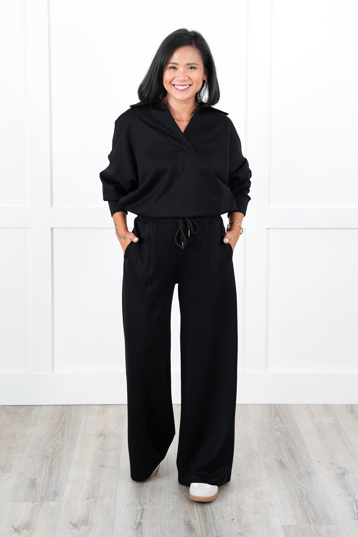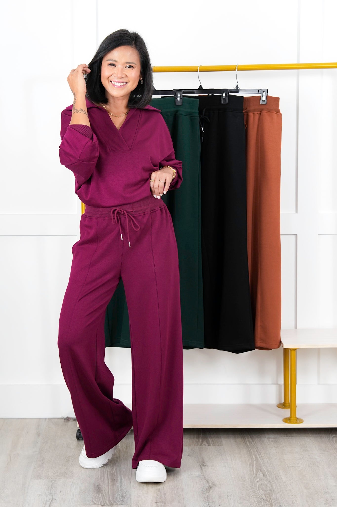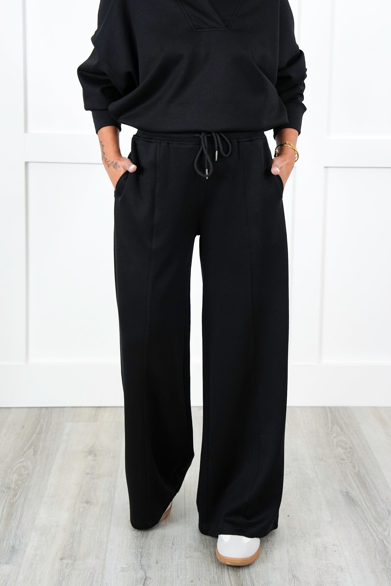 Fit: These aren't your average sweatpants, ladies! They are scuba knit making them chic and trendy. We love the wide legs, elastic waistband, and functional drawstring for added comfort. They also have side pockets and front seam. These are super soft with a relaxed, true-to-size fit!