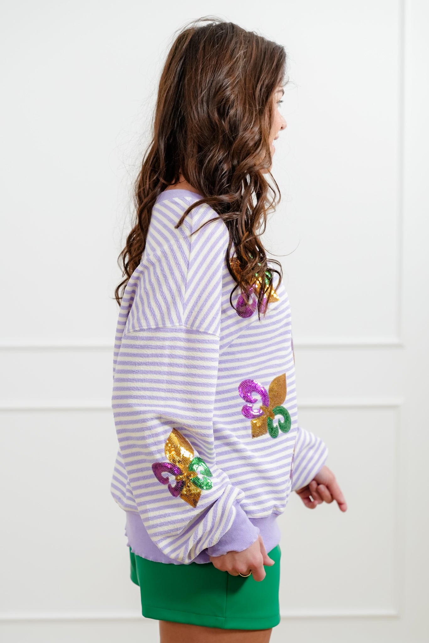 This pullover brings Mardi Gras energy front and center with colorful sequin fleur de lis patches layered over classic stripes. The lightweight fabric keeps it comfortable and easy, while the sparkle makes it feel special for parade days, casual parties, or dressed-up everyday looks with denim or skirts.