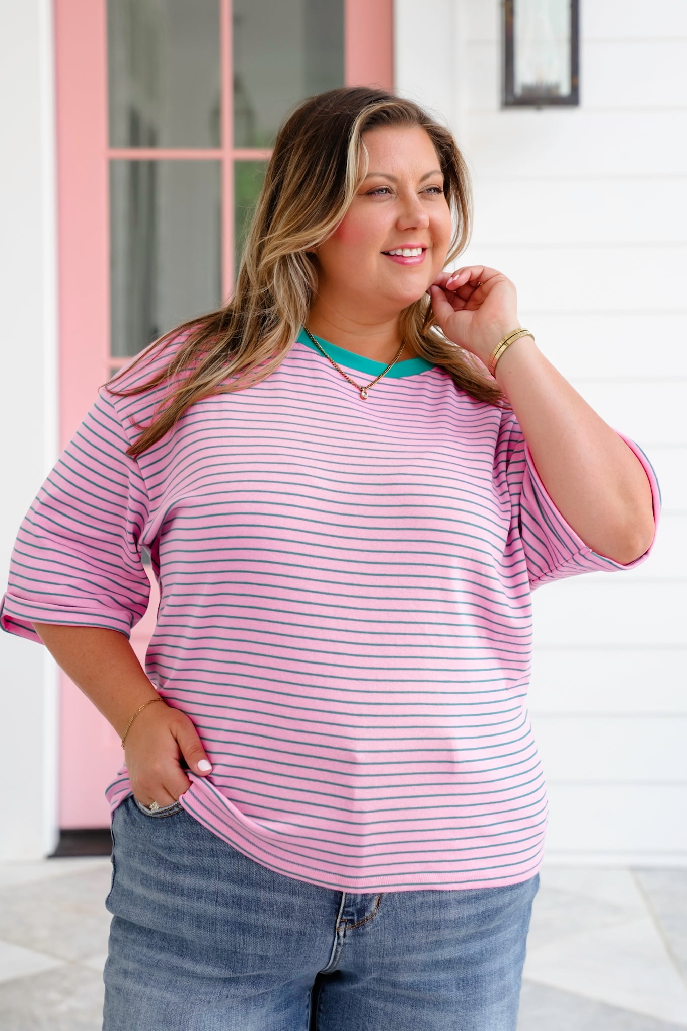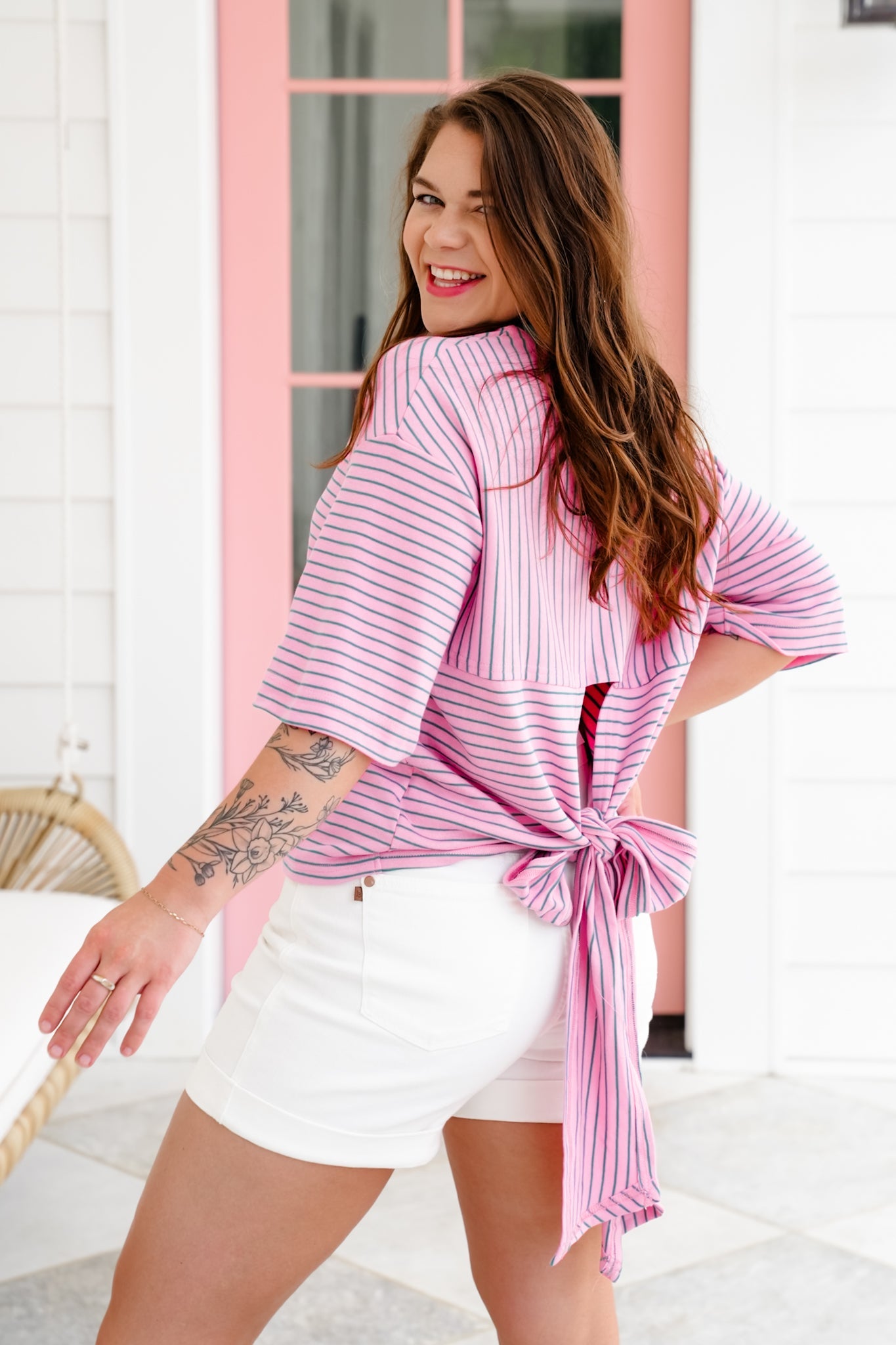 A classic stripe with a twist. This top is all about that unexpected tie-back moment! The front gives laid-back casual with a soft round neckline and relaxed sleeves, while the back brings the surprise with a playful bow detail that turns heads. Pair it with high-rise shorts or white denim and a colorful stack of bracelets for a look that’s equal parts sweet and standout.