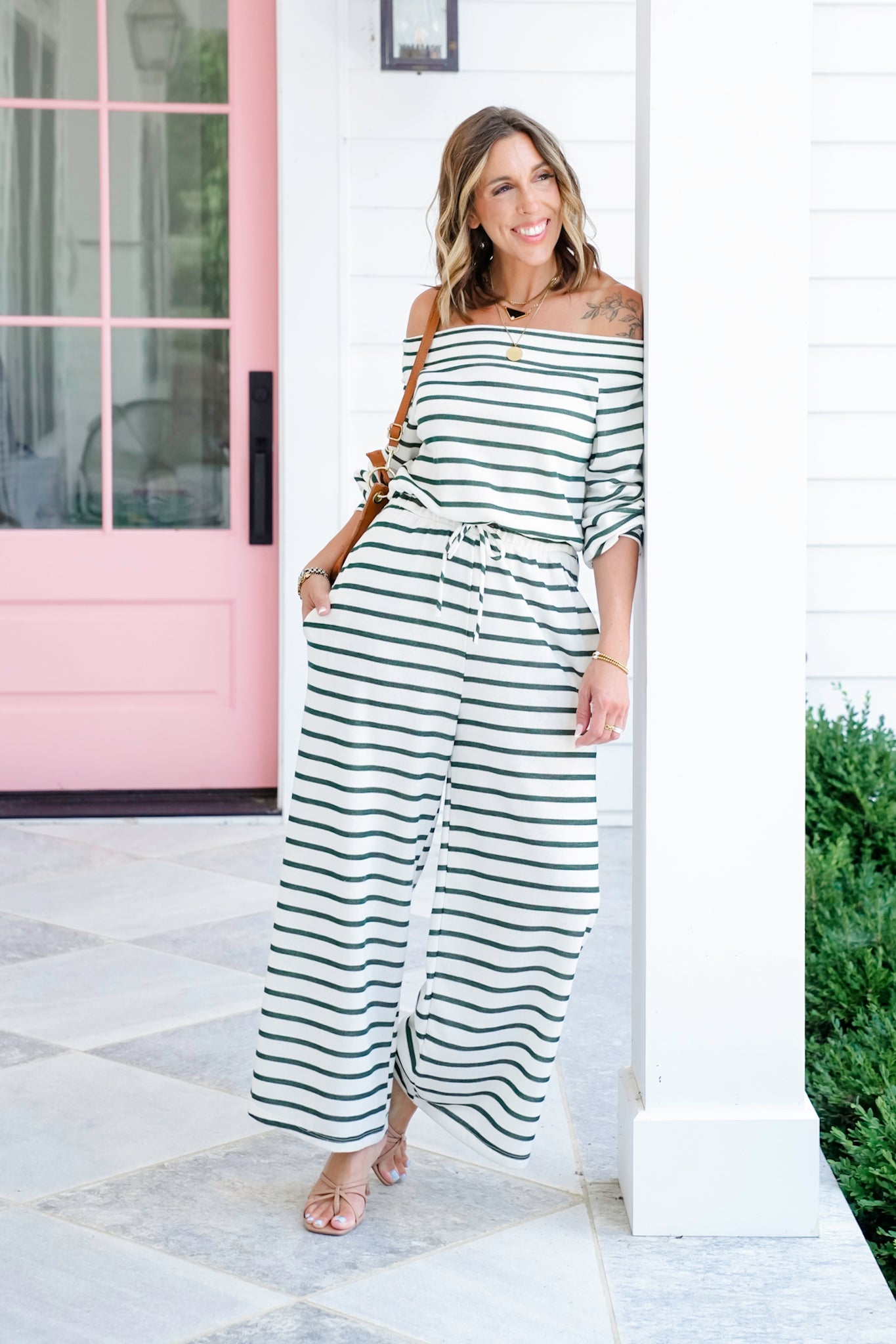 This striped terry jumpsuit is the ultimate mix of cozy and chic, featuring a wide boatneck collar that can be worn on or off the shoulder, an elastic waist with a functional drawstring, and, of course, side pockets for that extra dash of effortless style. The hunter green stripes on soft French terry lining give it a timeless yet playful vibe you’ll love reaching for again and again.