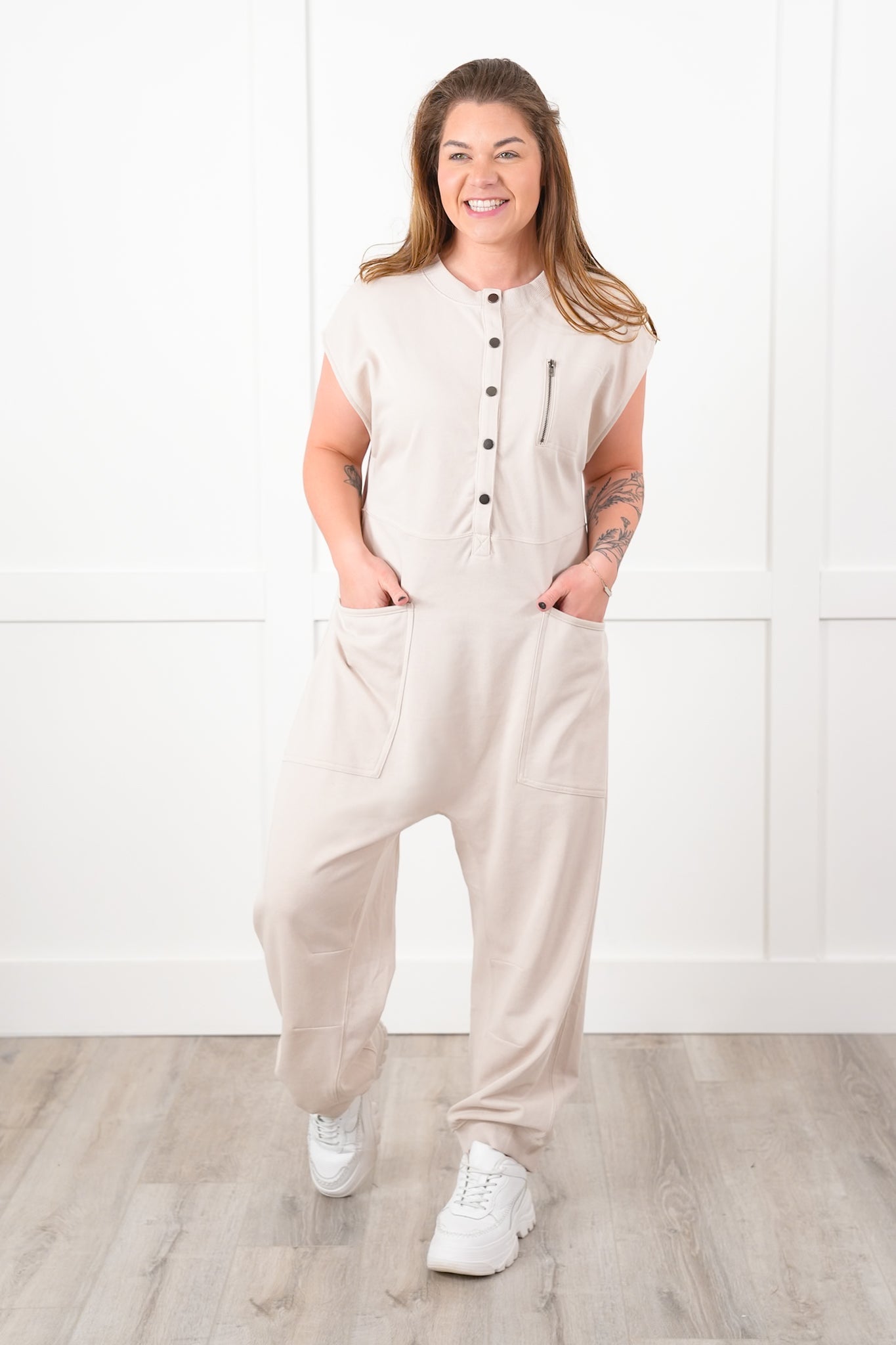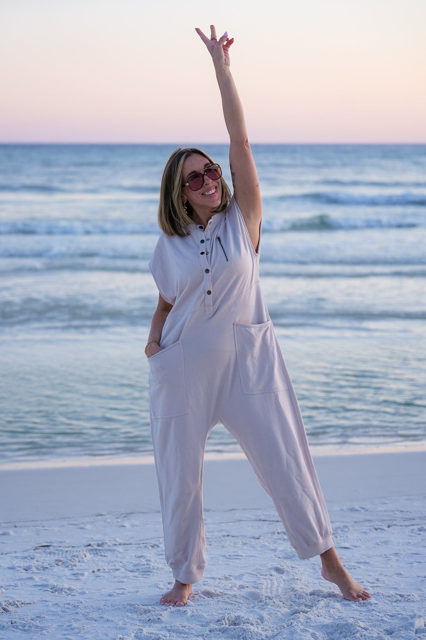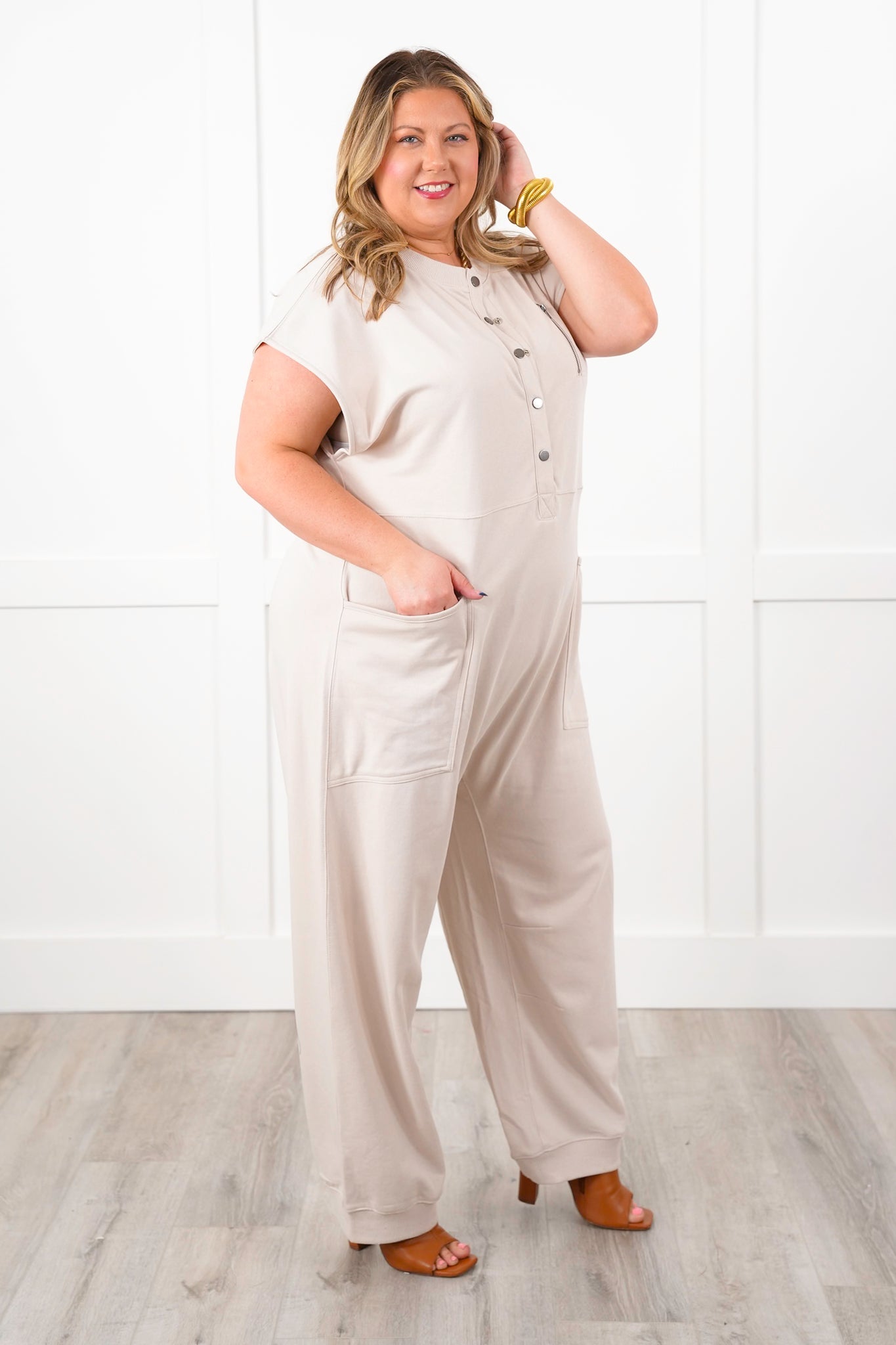 This chic taupe jumpsuit brings effortless style with its relaxed silhouette and handy front pockets! The soft knit fabric feels like your favorite loungewear, while the button details and short sleeves keep things perfectly polished.