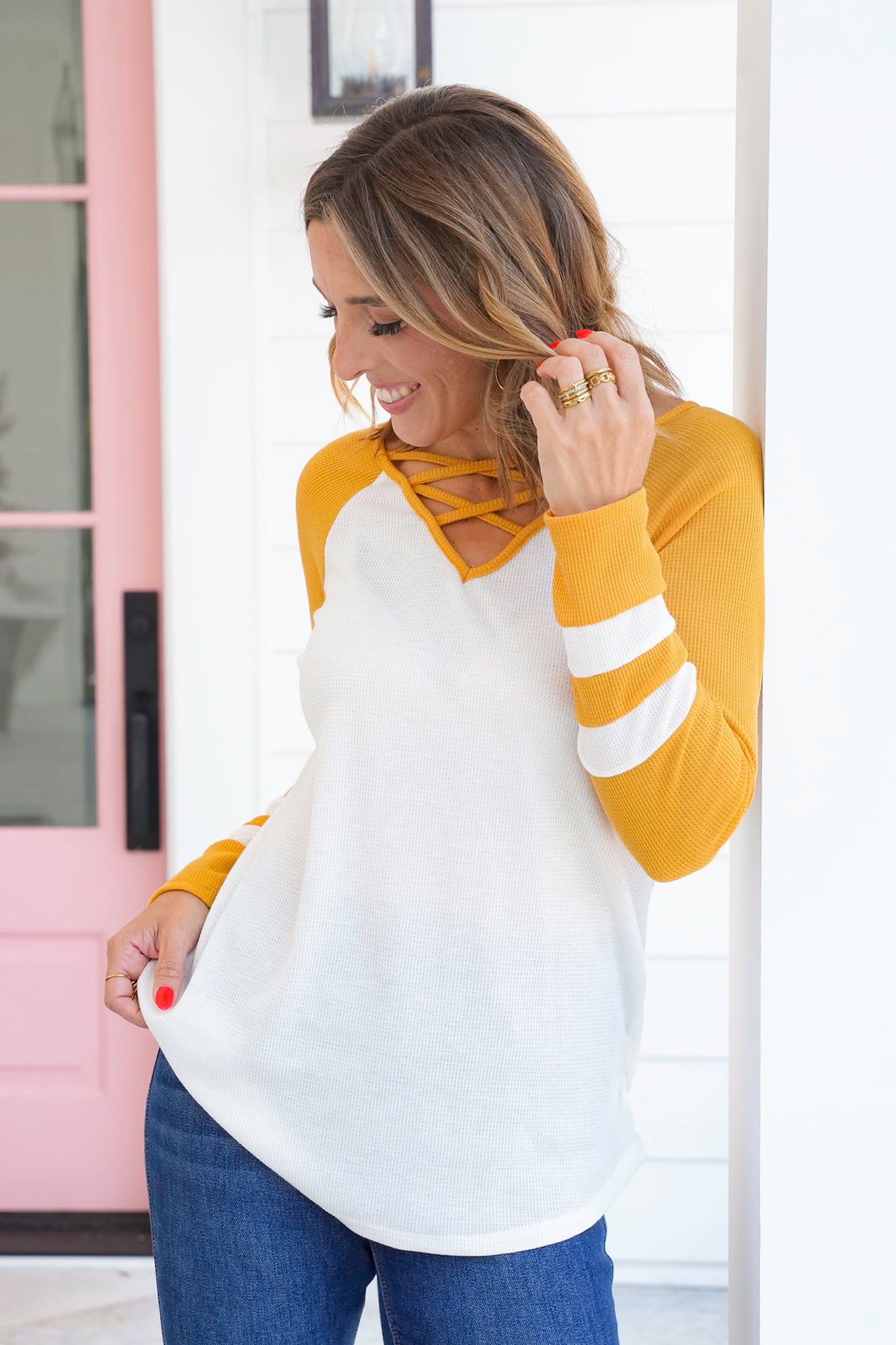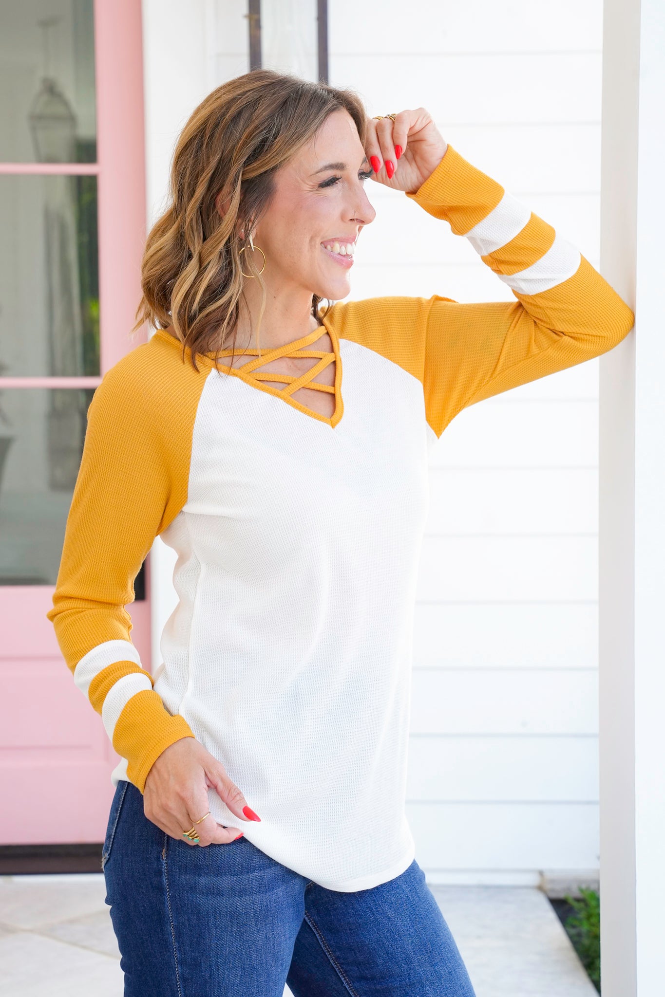 This thermal color block top brings all the retro vibes with its bold contrast sleeves, sporty stripes, and fun criss-cross detail at the V-neck. It’s the perfect casual piece that feels fresh and playful, whether you’re styling it with jeans for a laid-back look or layering it under a jacket for cooler days.