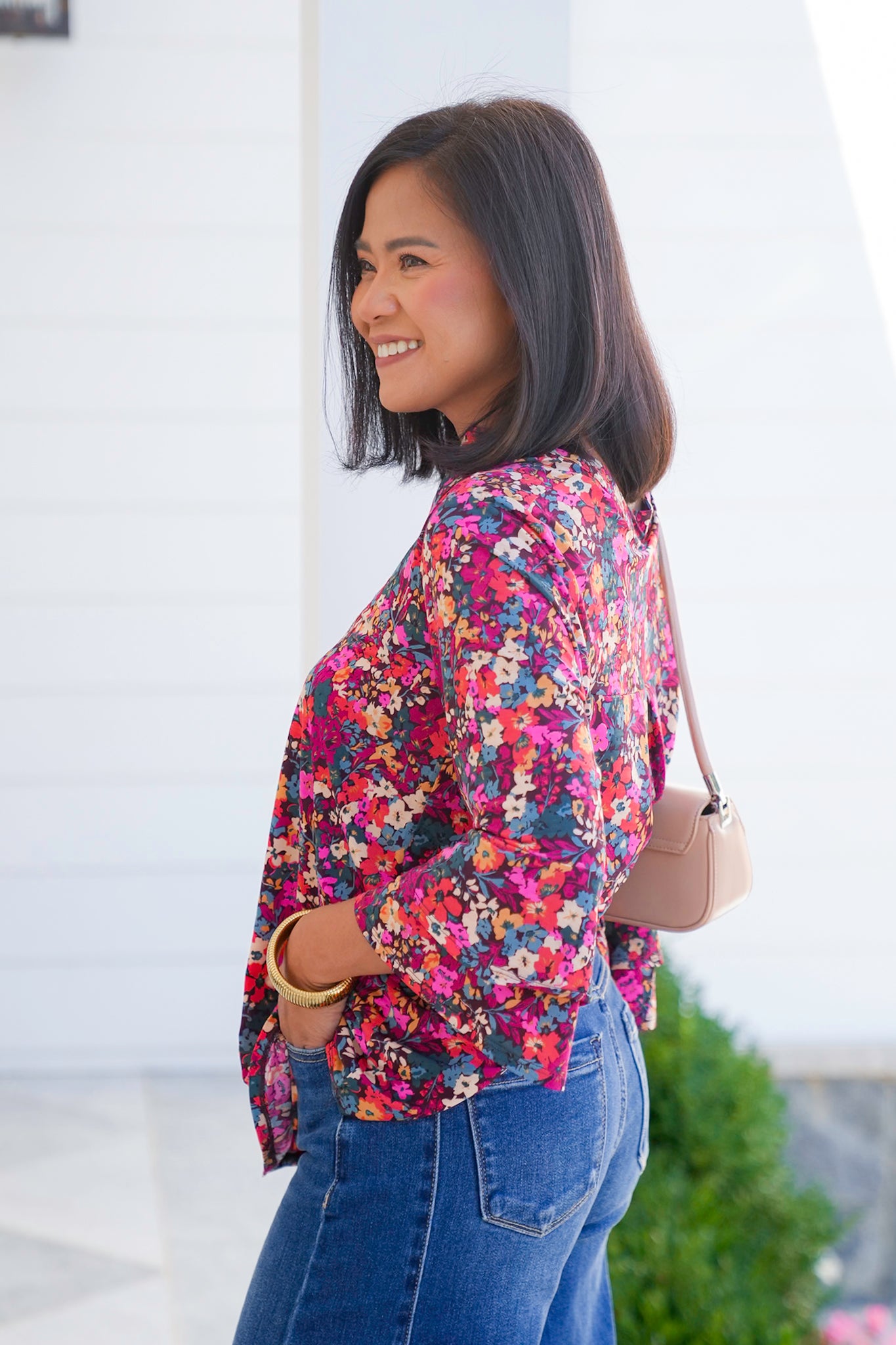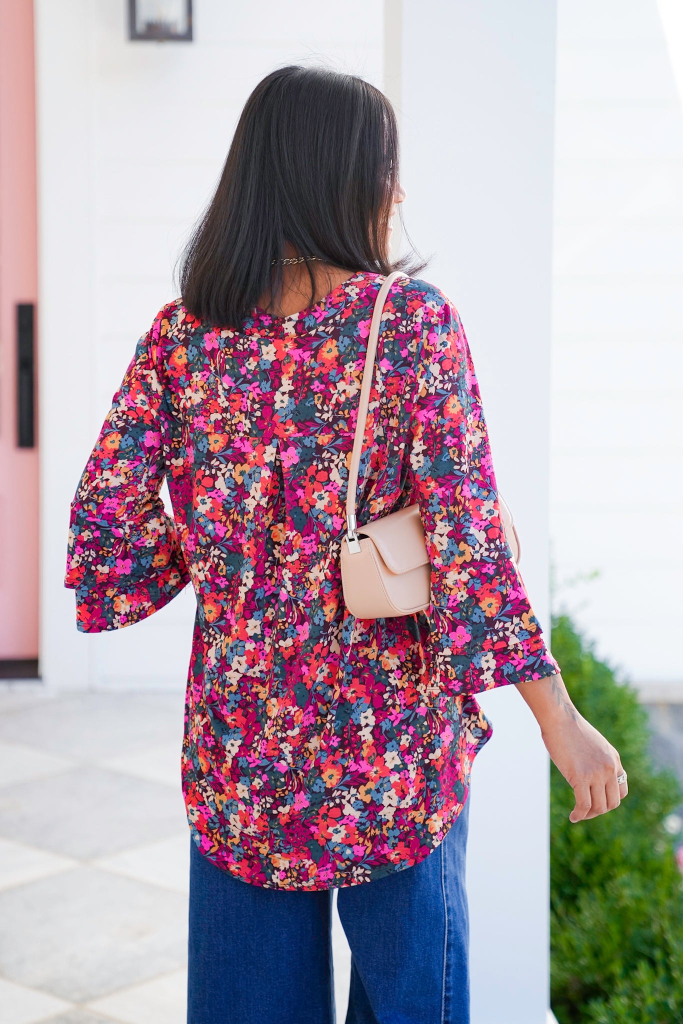 This floral print tunic top is bursting with vibrant fall colors that make it such a cheerful piece to wear. The notched mandarin collar keeps it polished, while the 3/4 bell sleeves add that fun, flowy detail that feels so feminine.