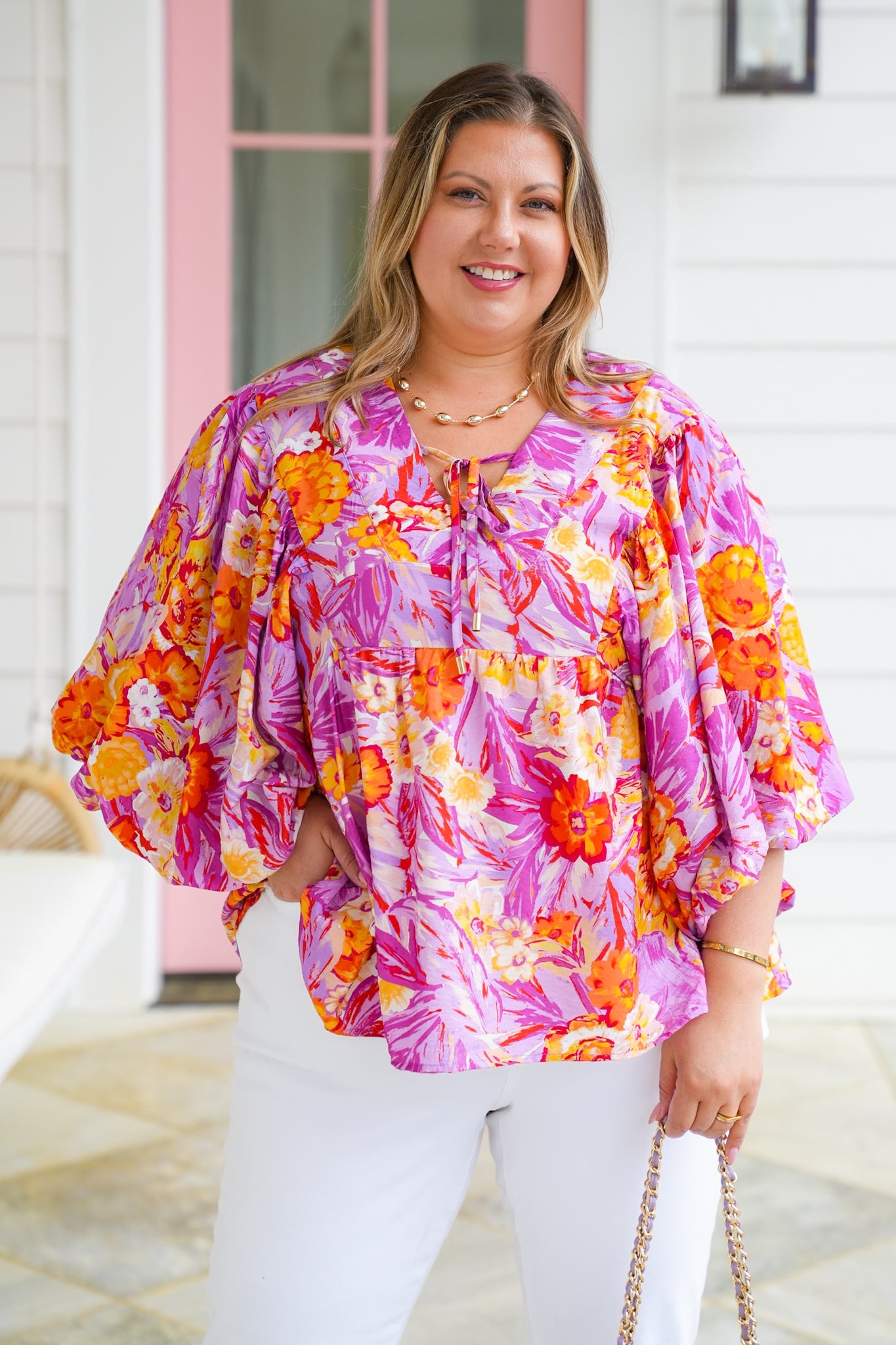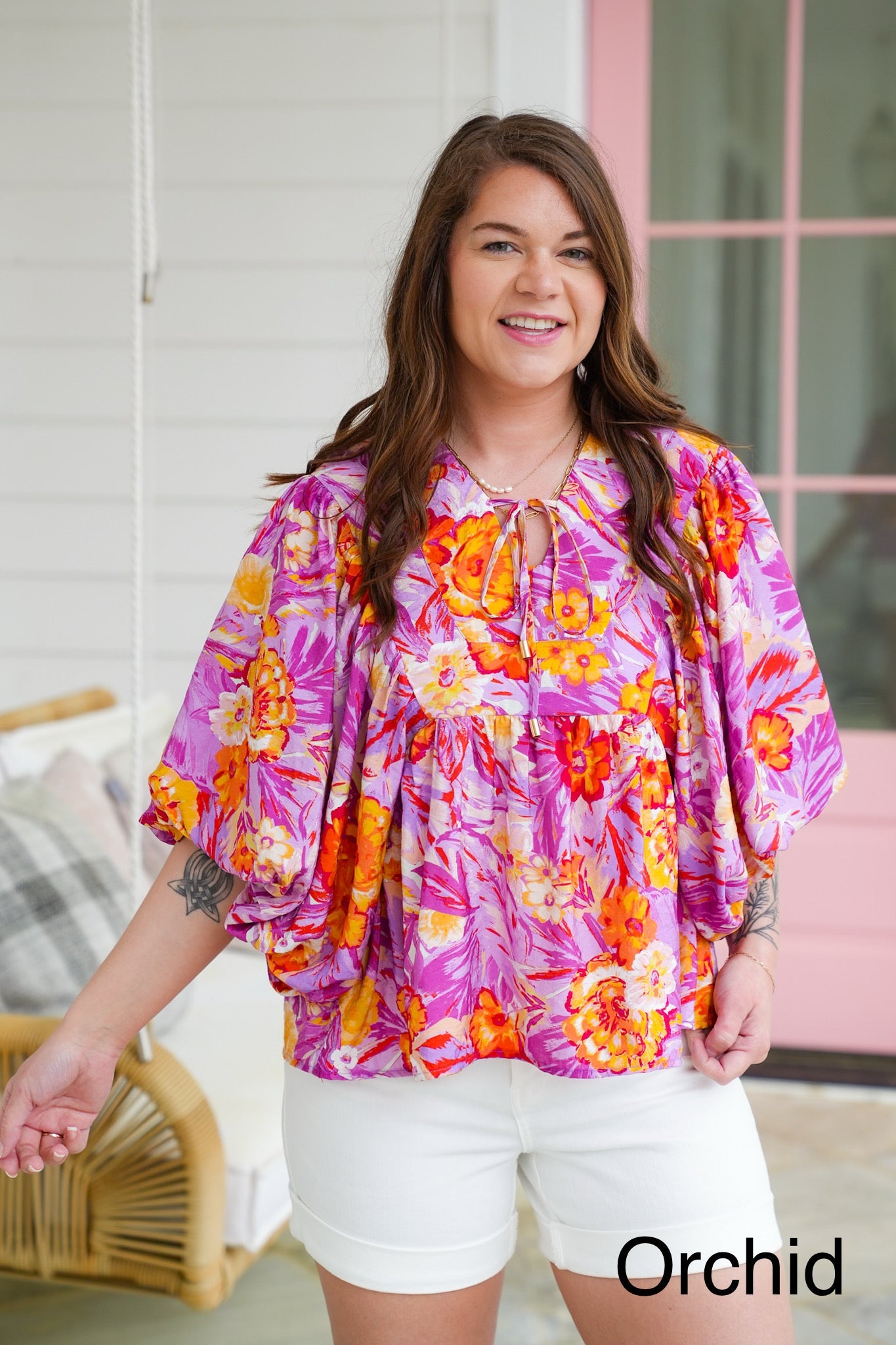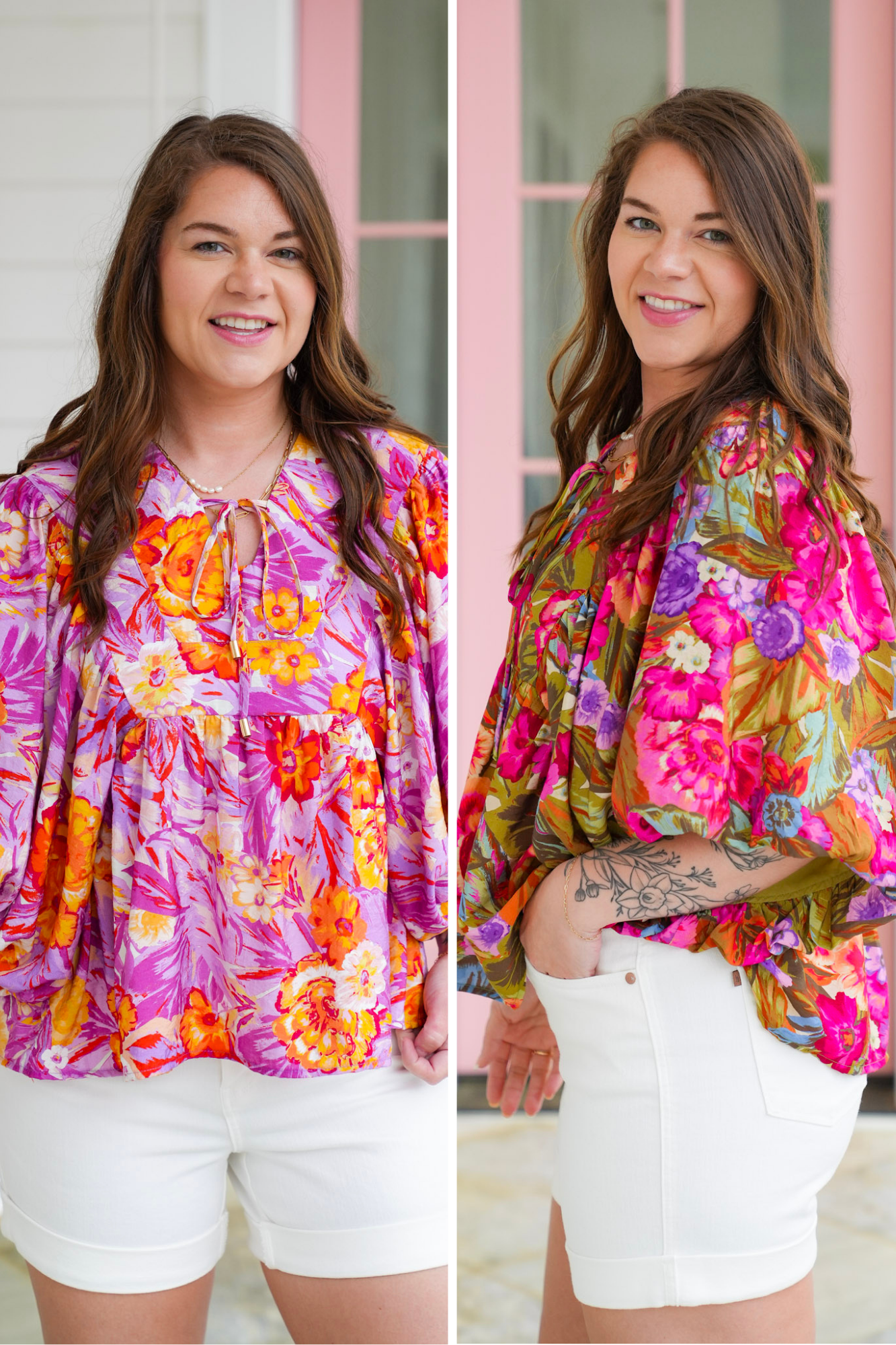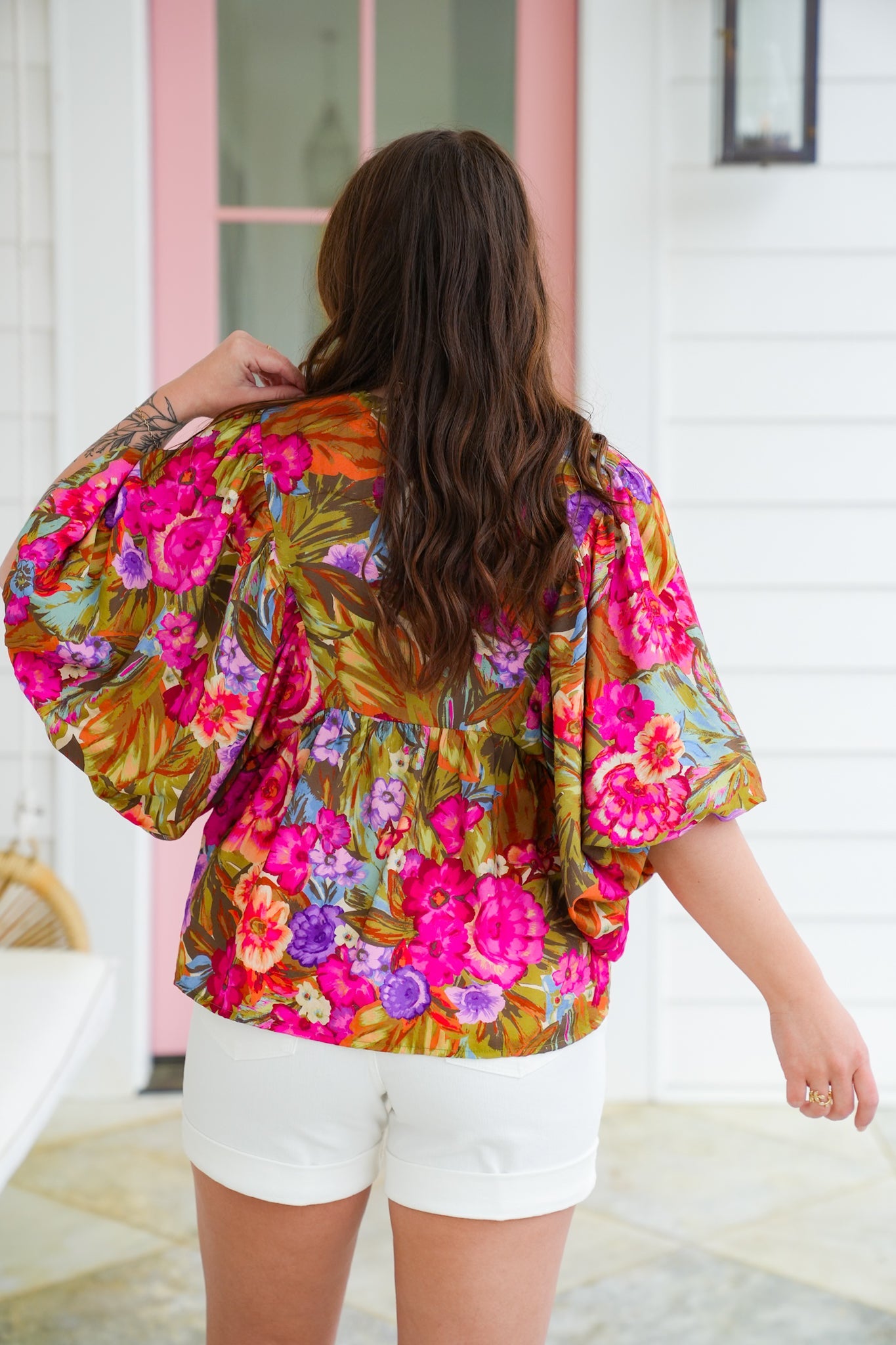 Turn up the color and let the compliments roll in! This tropical floral print top is bold, bright, and made for fun. The flowy dolman sleeves and pleated neckline add that swoon-worthy shape, while the vibrant print makes the whole outfit pop. Pair it with white denim, a wedge sandal, and simple jewelry to let the top do all the talking.