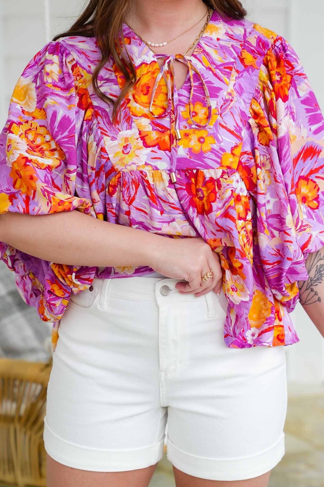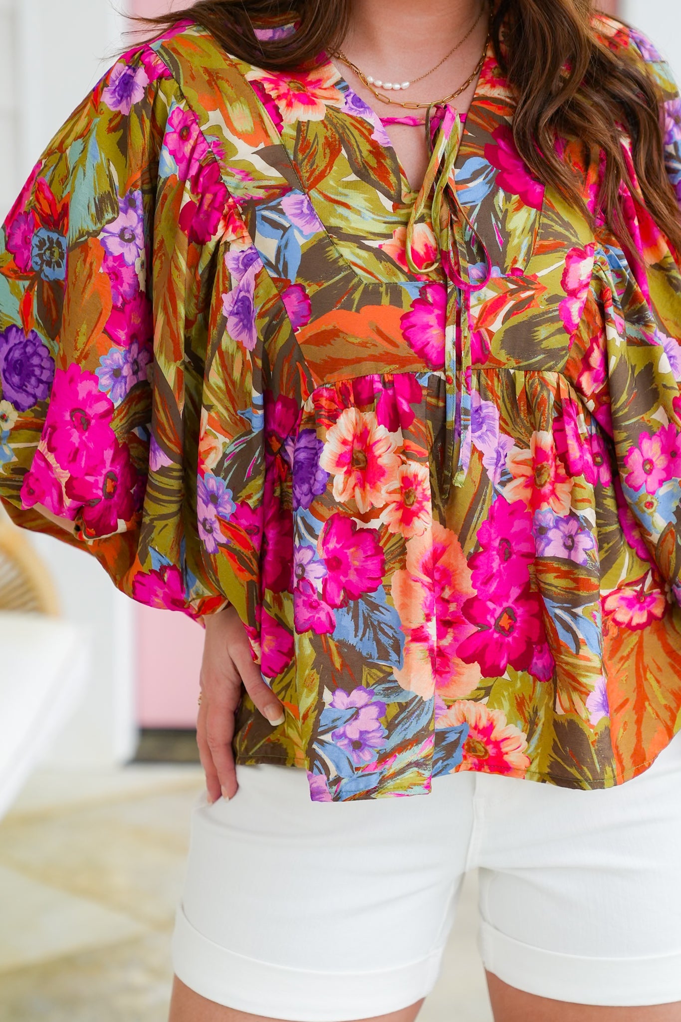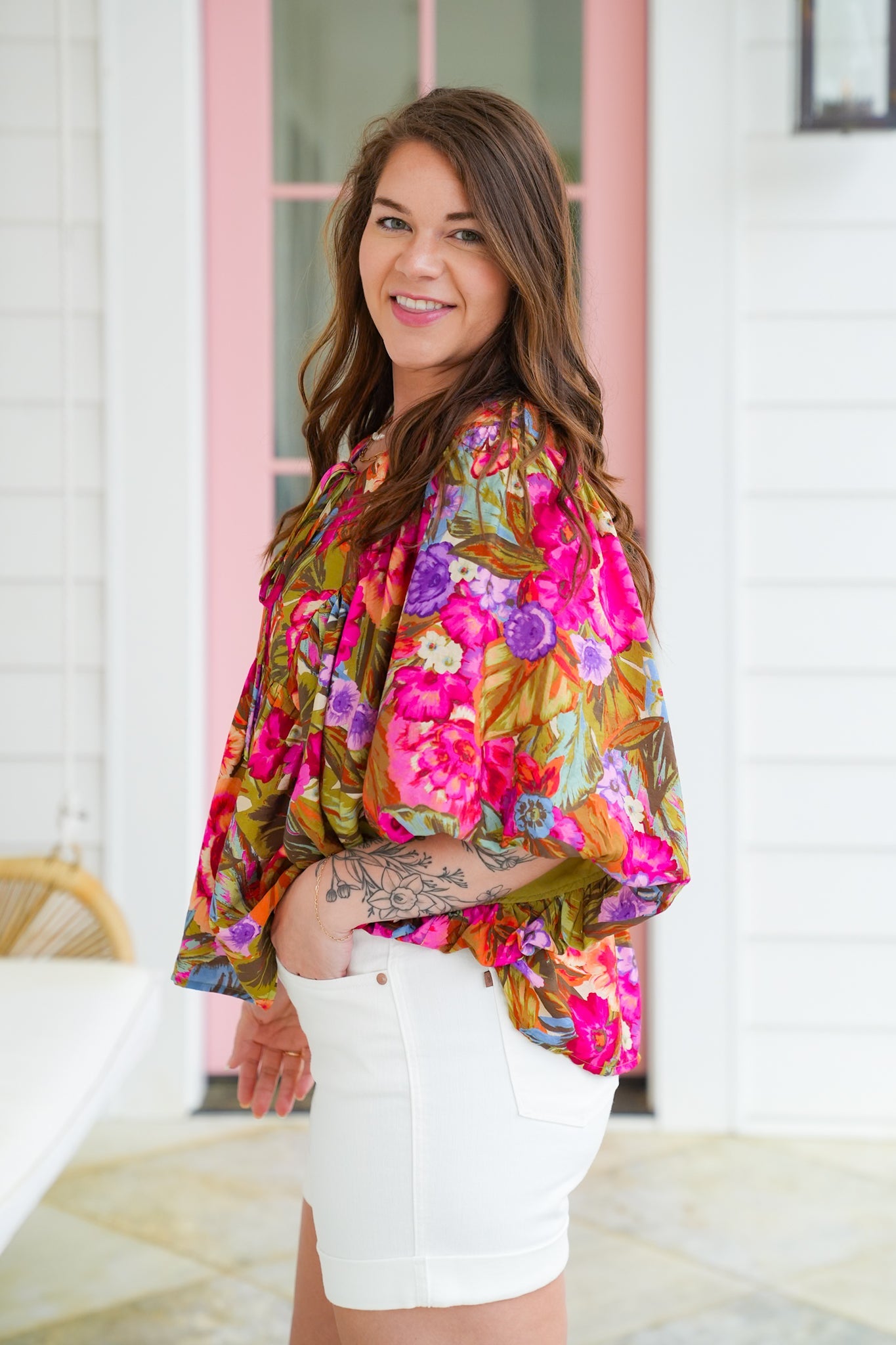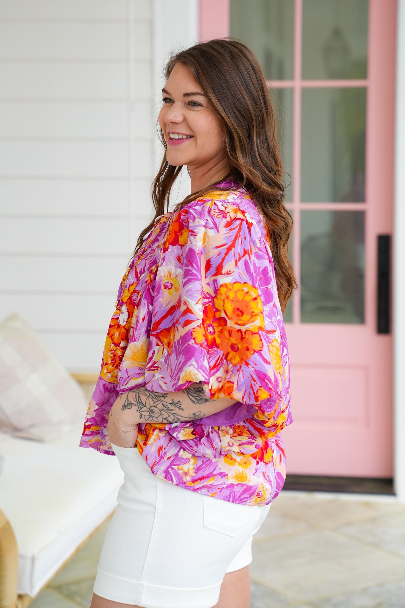 Turn up the color and let the compliments roll in! This tropical floral print top is bold, bright, and made for fun. The flowy dolman sleeves and pleated neckline add that swoon-worthy shape, while the vibrant print makes the whole outfit pop. Pair it with white denim, a wedge sandal, and simple jewelry to let the top do all the talking.