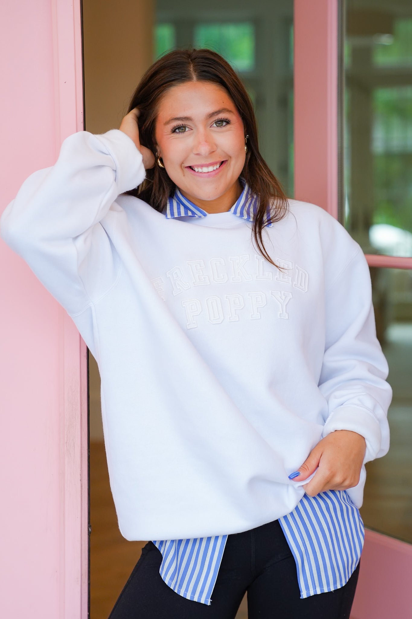 Brighten up any day with this playful “Freckled Poppy” graphic sweatshirt! It’s a cheerful essential for breezy days, layering over collared shirts or pairing with your favorite leggings for a laid-back, stylish look.