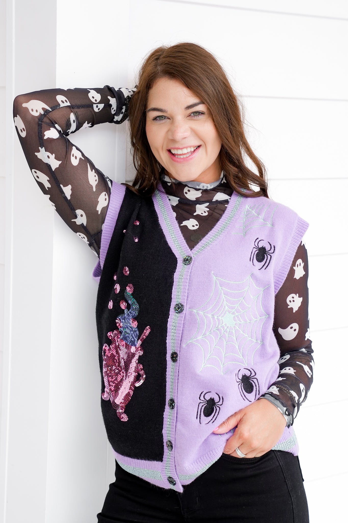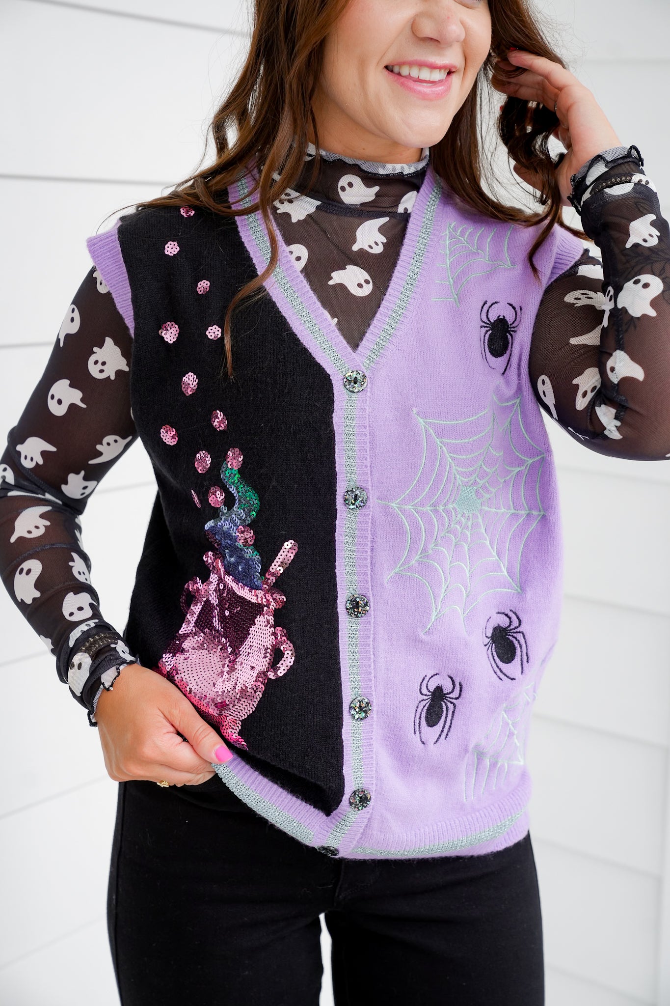 Bring the magic with this whimsical-meets-spooky sweater vest. The intricate embroidery and sequin details give it a festive, high-end feel while the playful color combo keeps it fun. Style it over a mesh printed top for full-on Halloween flair, or keep it casual with a solid tee and your favorite jeans.
