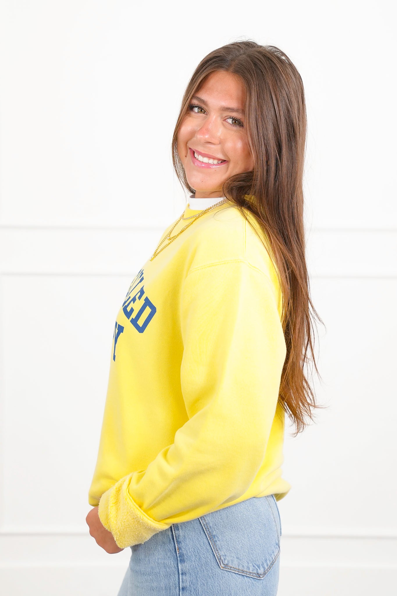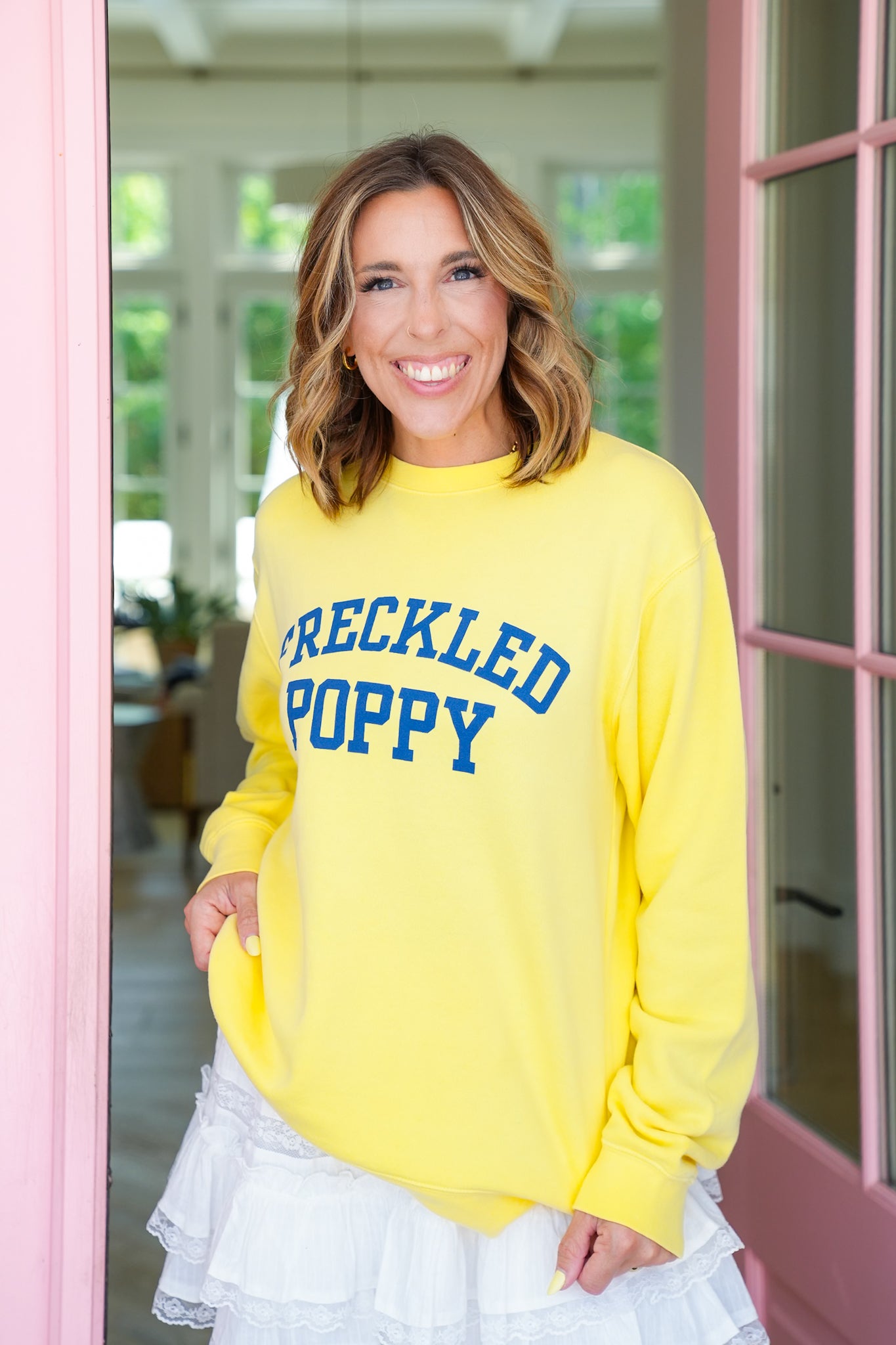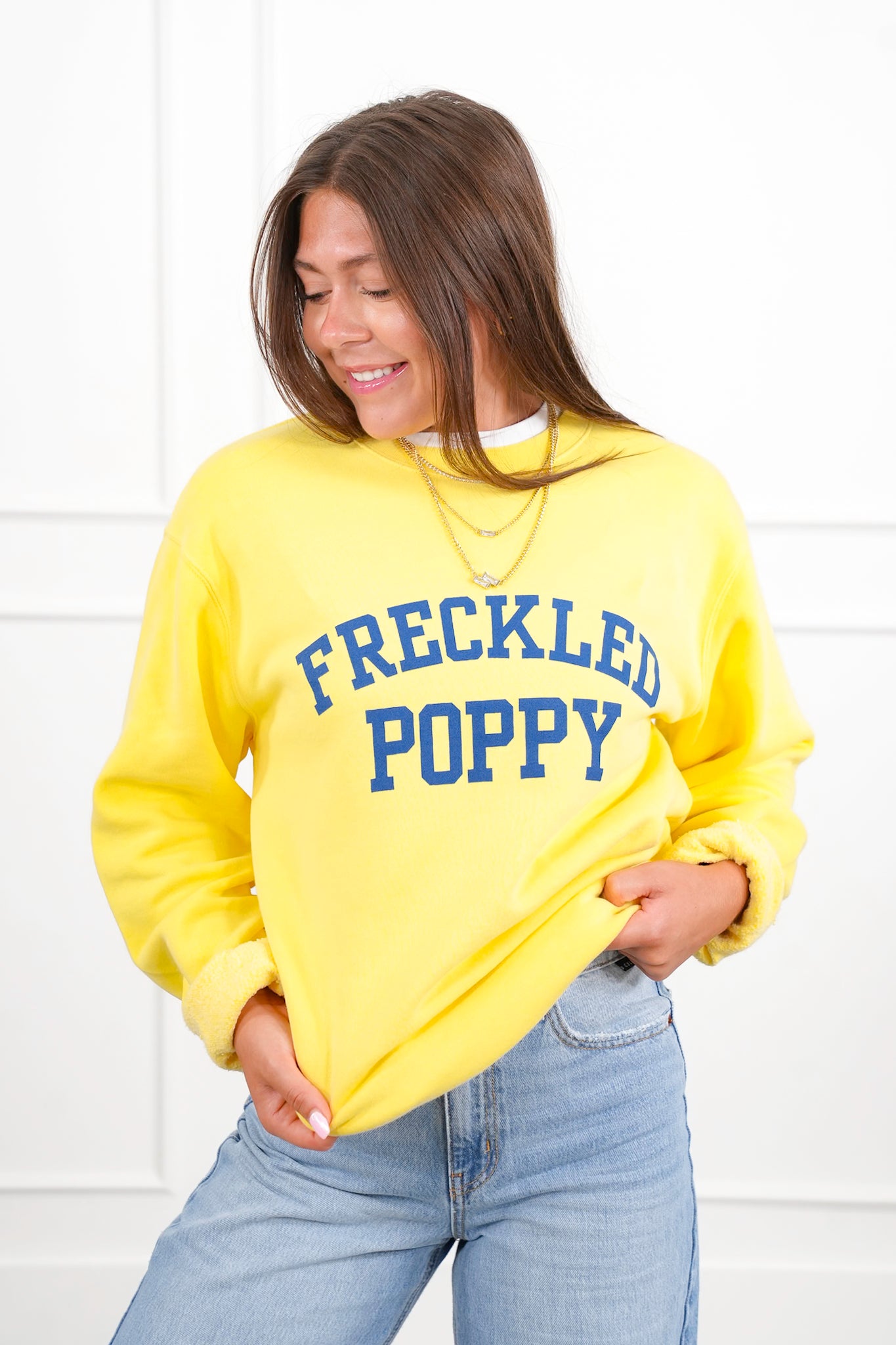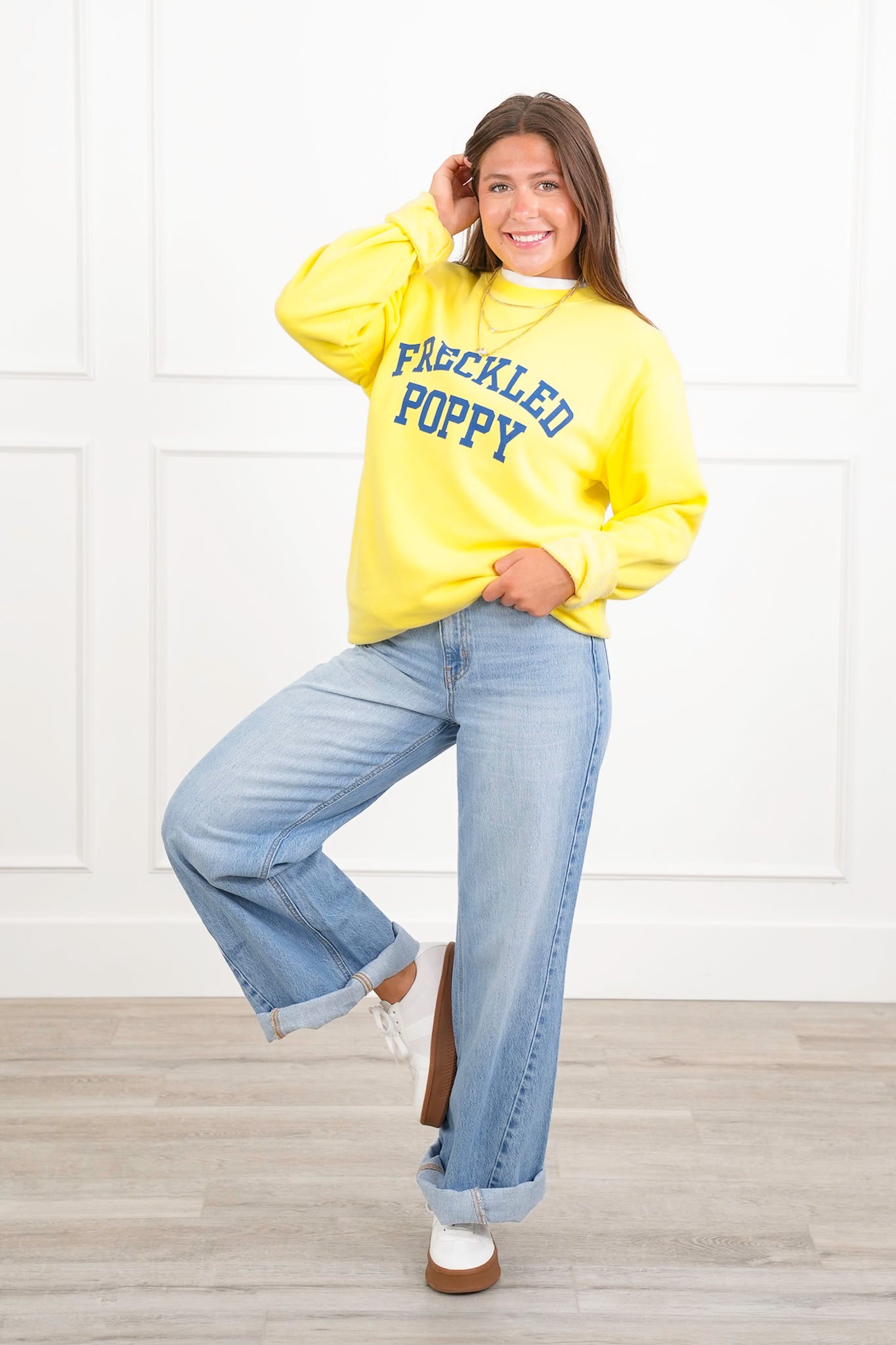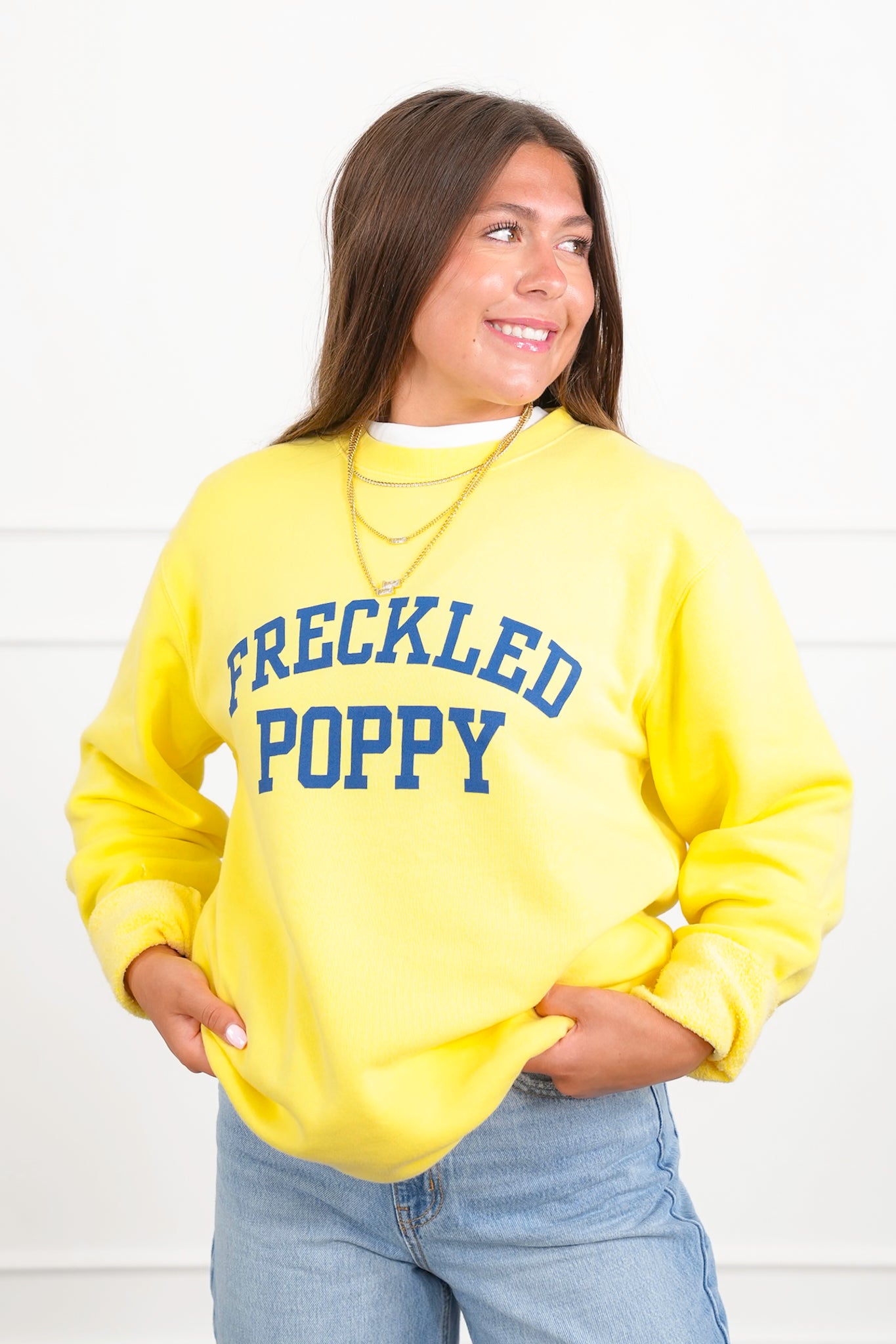 Ready to steal the spotlight? This soft yellow "Freckled Poppy" sweatshirt is pure sunshine for your wardrobe. It pops with a bold blue graphic that’s playful, cheery, and guaranteed to lift your mood. Perfect for days you want to keep it casual but still look put together. Pair it with jeans, leggings, or layer it over a collared shirt for a cute, preppy twist.