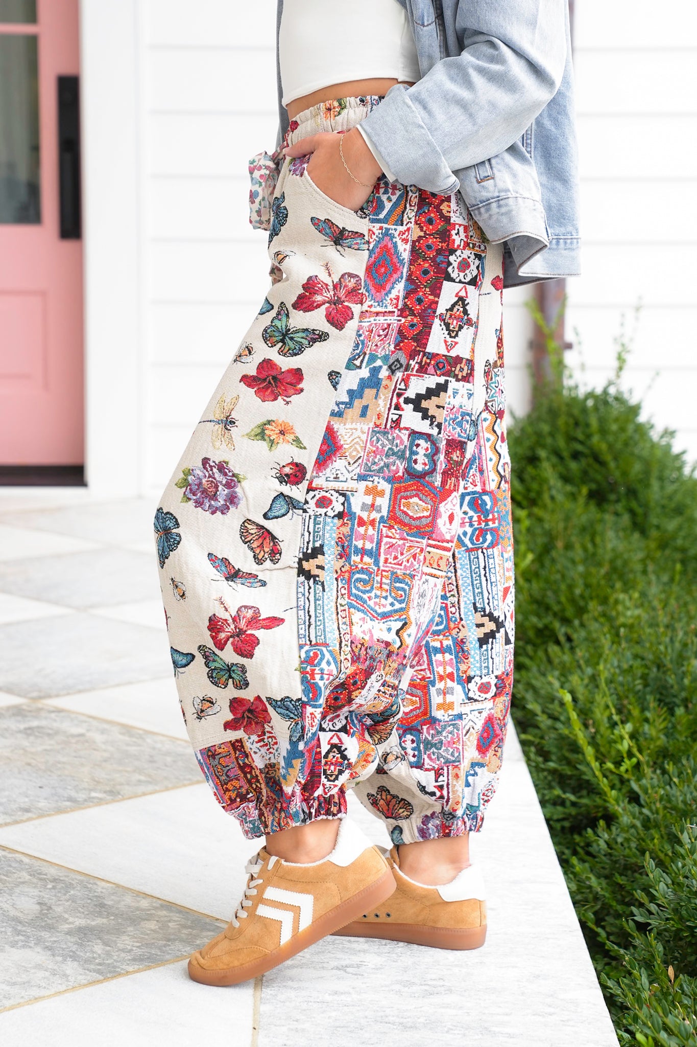 These joggers turn everyday comfort into a statement moment. The whimsical butterfly and floral pattern mixed with boho patchwork detailing adds artistic flair to any look. Style them with a fitted tank, denim jacket, or cropped pullover for a fun and free-spirited vibe.