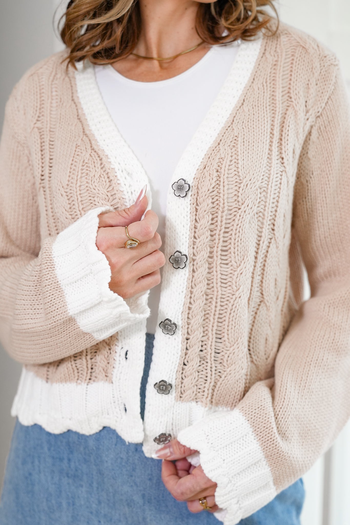 This cardigan brings that cozy-cute vibe everyone loves with a soft cable knit that instantly elevates your outfit. The lightweight feel keeps it easy and wearable, while the button-up front makes it perfect layered over basics or worn on its own with denim for an effortless, put-together look.
