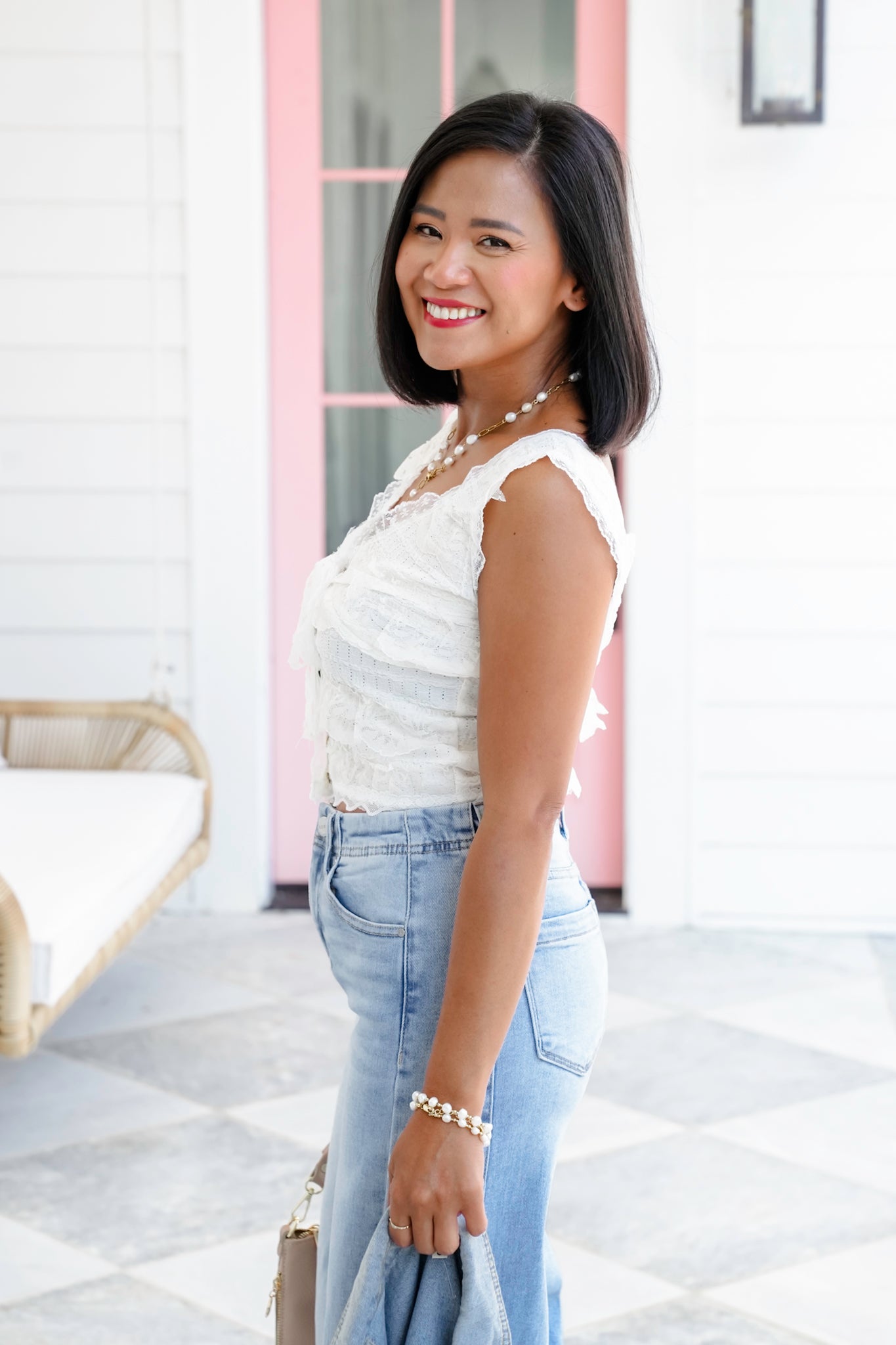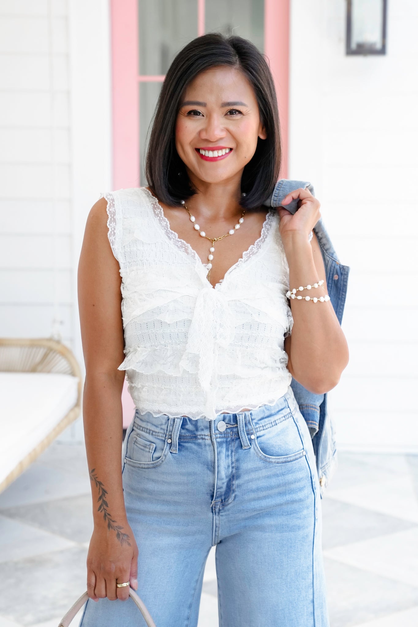This lace crop top is a dreamy mix of feminine and flirty. With its intricate lace layers and soft scalloped edges, it’s a piece that elevates even the simplest pair of jeans. Dress it up with a maxi skirt or layer under a denim jacket for a casual day out.