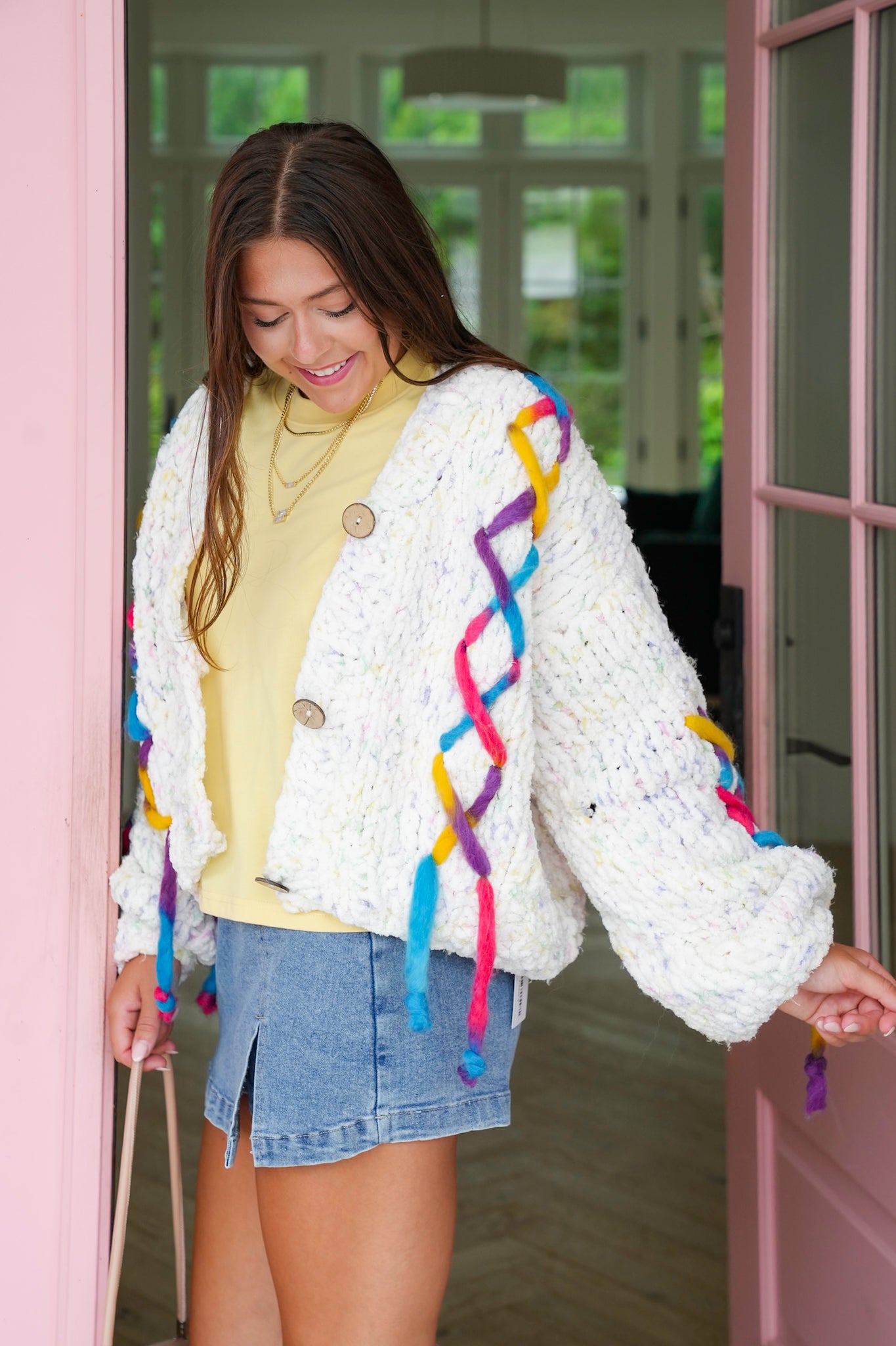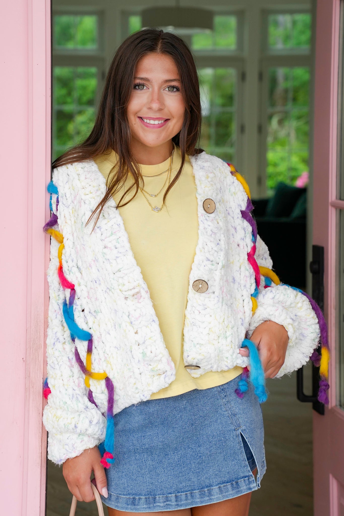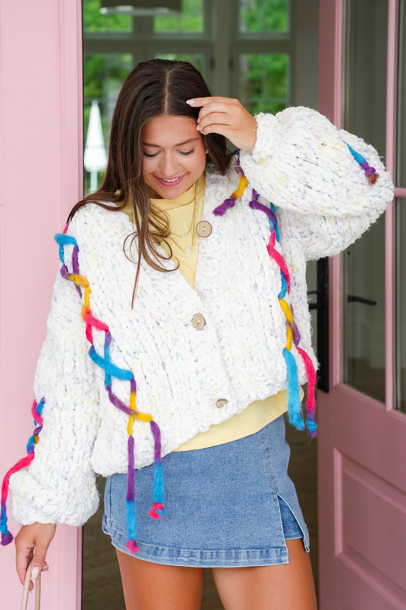 This cardigan is the definition of cozy with a twist! The cream base makes it timeless and easy to style, while the colorful stitch detailing gives it that unexpected pop of fun that only POL delivers.